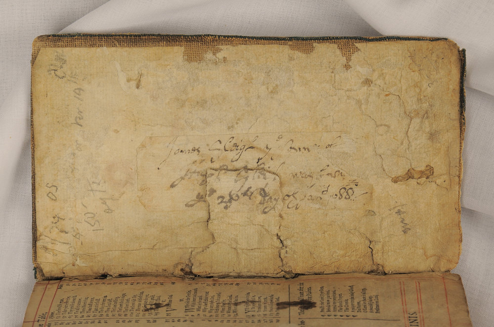 December 9, 2013, Inside back cover of the Bible, with the inscription “James Sleigh ye sonne of Hugh Sleigh was born ye 26th [?] Day of Jany 1688.” Bibles were often used to record family histories. Inside back cover of the Bible, with the inscription “James Sleigh ye sonne of Hugh Sleigh was born ye 26th [?] Day of Jany 1688.” Bibles were often used to record family histories.