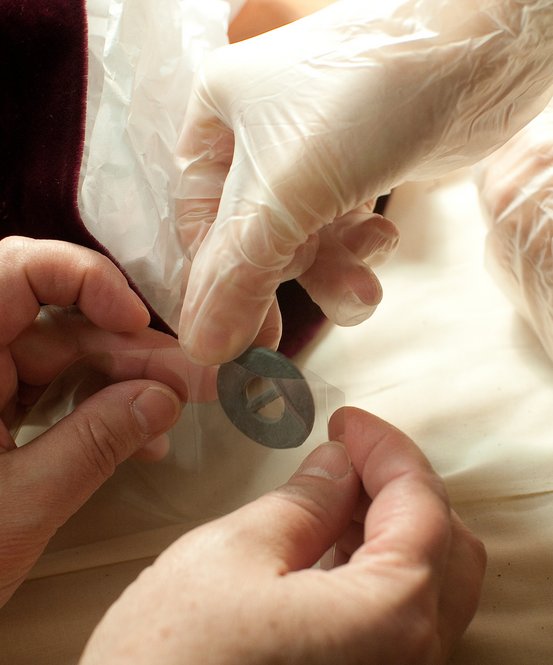 July 27, 2011, Filed Under: ConservationWeights removed from red burgundy dress from "Gone With The Wind" to prevent damage “Wear that!” spits Rhett Butler, throwing a burgundy ball gown at Scarlett. “Nothing modest or matronly will do for this occasion.” When the provocative burgundy gown from Gone With The Wind arrived at the Ransom Center in the early 1980s, lead weights lining the back hem had torn parts of the dress. Cara Varnell, a conservator specializing in Hollywood film costumes who is currently conserving the Ransom Center’s five Gone With The Wind dresses, explains that the weights are an example of inherent vice: the studio costume department included the weights to make the dress hang and move properly, but over time the weights ended up tearing parts of the dress. To prevent further damage, Varnell and the conservation team decided that the weights had to go. “This girl’s never dancing again, so the dress doesn’t need to train properly,” Varnell said. “But what we do care about is that it’s pulling on the center of the dress. Dress weights are very common, and, while I don’t approach it casually, I often remove the weights in most of the couture dresses I work with because they’re usually pulling on the fabric.” To remove the weights, the team enlisted the help of three Costume Studies master’s degree students at New York University: Lauren Lappin, Jennifer Moss, and Laura Winslow. Before removing the weights, the students worked with Ransom Center Book Conservator Mary Baughman to create compartments for storing the weights. They used one machine to heat seal the edges of two strips of transparent polyester film, and they used an ultrasonic machine to separate the strips into individual compartments. They then labeled the compartments with each weight’s location on the gown’s hem. Once the compartments were ready, the students took turns removing the thread from the bottom of the weight pockets. Switching between tweezers and the flat blade of small scissors, they gently lifted the thread from the fabric, removed the thread, then slid the weights out of their pockets and into their Mylar compartments. Once all the weights were in their designated compartments, Baughman and the students went back to the welding machines to seal the top. After devising compartments, removing the weights, and placing the removed weights in their designated compartments, the conservation team helped the burgundy ball gown lose some weight. Please click on the thumbnails below to view full-size images. Photo of burgandy ball gown before conservation project. Vivien Leigh, wearing the burgundy ball gown, and her co-star Clark Gable in “Gone With The Wind.” One of the weights found lining the back hem of the burgundy ball gown. The conservation team removed the weights because they were pulling on the gown, possibly leading to tears. Photo by Pete Smith. Jennifer Moss, a master’s student in Costume Studies at New York University interning at the Ransom Center this summer, removes thread from the bottom of the pockets holding weights in the burgundy ball gown. Photo by Pete Smith. The conservation team removes a weight from the burgundy ball gown. Photo by Pete Smith. The conservation team places a weight into a mylar compartment they devised to store the weights. Photo by Pete Smith.