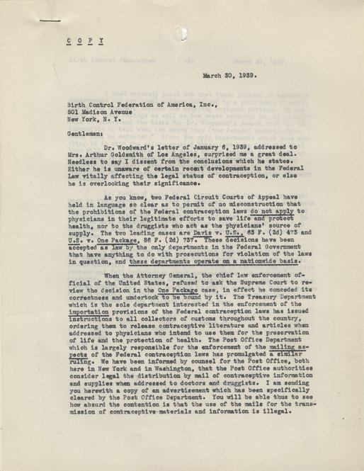 April 12, 2012, Filed Under: Cataloging, Research + TeachingDecades later, current headlines echo controversies addressed in Morris Ernst collection Through a generous grant from the National Endowment for the Humanities, a team of archivists and student interns has been working to organize and catalog the papers of attorney Morris Leopold Ernst since September 2009. The collection is now open for research, and a finding aid is available online. Morris Leopold Ernst (1888–1976), who earned his law degree 100 years ago, may not yet be a household name, but his legal career has had a lasting impact on American society. Ernst dealt primarily with civil liberties cases in a variety of areas, including censorship, obscenity, and first amendment rights. In addition to his busy legal career, he was a prolific writer, authoring more than 30 books and hundreds of articles, essays, and short works on legal topics and other social issues like big business and divorce. Ernst is probably best known for his work in literary censorship cases. His influential fights include the defense of Radclyffe Hall’s The Well of Loneliness, Arthur Schnitzler’s Casanova’s Homecoming, and most famously, James Joyce’s Ulysses. Though the majority of Ernst’s work took place in the early and mid-twentieth century, as our team of archivists sifted through his papers and processed the collection, we couldn’t help noticing how timely the collection seemed. Over and over again the subjects we read about in Ernst’s archive were echoed by stories in the recent news. The case United States v. One Book Entitled Ulysses by James Joyce, which Ernst and his colleagues carefully orchestrated, won Ernst much fame and set a precedent for arguing and trying “objectionable” literature. Banned in the United States for more than a decade before Ernst won the case in 1933, Joyce’s masterpiece has had to overcome other more recent hurdles. In 2010 the work was in the news when Apple tried to censor a graphic novel version by Rob Berry and Josh Levitas. Before allowing the Ulysses comic to appear as an electronic book for the iPad, Apple requested that the illustrators remove all nudity from their images. Apple eventually rescinded its demand and allowed the original illustrations to appear. In the 1930s, Ernst was also a prominent figure in the early birth control movement defending the Birth Control Federation of America and the Clinical Research Bureau, predecessors of the Planned Parenthood Federation of America. As these organizations printed and distributed educational materials on reproduction and contraception, they were charged with obscenity. In cases such as United States v. One Package of Japanese Pessaries, Ernst exonerated the movement’s leaders from indecency and in so doing, helped promote women’s rights and the freedom of choice. Contraception and women’s rights have continued to be newsworthy topics. Ernst was also well known for his work with labor unions, famously defending first amendment rights in Hague, Mayor, et al. v. Committee for Industrial Organization et al. This conflict arose in the 1930s when Jersey City, N.J. mayor Frank Hague tried to suppress many of the Committee for Industrial Organization’s (CIO) activities and decreed by city ordinance that laborers could not assemble in public. The case was appealed to the Supreme Court where the workers’ rights were upheld. Though Ernst won that case in 1939, politicians and labor unions have often been at odds with each other. For example, beginning in February 2011 headlines were populated with reports about Wisconsin Governor Scott Walker’s attempts to curtail union bargaining rights. The AFL-CIO represented workers in these disagreements as well. Ernst published his book Too Big in 1940, one of the many books he wrote. The title is echoed by the phrase “too big to fail,” with which we all are familiar, as it has been frequently used in the media since the market crash in 2008. Monopolies and the danger of big business were of real concern to Ernst, and he wrote about it not only in that volume, but in numerous magazine articles. Censorship, birth control, labor unions, and monopolies were only a few of Ernst’s many interests. As a tireless worker he involved himself in many other issues, such as reducing postage rates for books and promoting literacy around the world. His papers provide insight into his legal practice and writing career and could also provide a new perspective on issues in contemporary society. Please click the thumbnails below to view full-size images. Morris Ernst’s copy of James Joyce’s “Ulysses.” This chart was compiled by Morris Ernst and his colleagues to track responses to a survey sent to libraries across the country about the interest and demand for “Ulysses.” “Birth Control in the Courts” document written by Morris Ernst. Poster from the Morris Ernst collection. Cover of claimant memorandum from trial over James Joyce’s “Ulysses.” Morris Ernst collection. First page of letter from Morris Ernst to Birth Control Federation, dated March 30, 1939. Morris Ernst collection. Second page of letter from Morris Ernst to Birth Control Federation, dated March 30, 1939. Morris Ernst collection. Morris L. Ernst (left, holding book) was one of the most active attorneys for the anti-censorship cause during the interwar years. In this 1935 photograph, from the “New York Journal American” collection, Ernst defends the Gustavo Flaubert’s “November.”