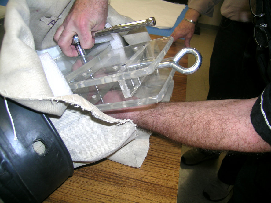 July 31, 2012, Filed Under: Conservation, FilmExhibition services team builds custom storage hanger for "Men of Honor" dive suit from Robert De Niro’s collection There are many factors to consider when housing very large collection objects. This was particularly true in the case of the deep sea diving suit worn by Cuba Gooding Jr. in the movie Men of Honor, which came into the care of the Ransom Center when Robert De Niro donated his archive to the Center in 2006. The mandate was to create a storage device to increase the longevity and preserve the construction of the suit. The dive suit was too large and too heavy for housing in conventional preservation boxes, and flat storage could not have properly supported the suit’s own material from crushing itself. The amount of storage space had to be considered, along with the construction of the support device, so the suit could be easily transported and exhibited. This dictated that the type of materials used to construct the device be archival and light weight, such as acrylic sheet and polyethylene foam. The solution was a hanger designed to be simple, adjustable, and adaptable. The main body and structure of the hanger is 1.25 cm thick acrylic sheet. It was measured to fit the exact shape of the interior of the deep sea diving suit across the shoulders and into the arms. The acrylic sheet panels were cut, drilled, and polished, then bolted together with two thick polyethylene foam planks placed between them. The Ethafoam serves as lightweight, highly compact archival filler. It also provides a porous surface to which layers of Ethafoam padding can be hot-glued to cover the surfaces and edges of the acrylic sheet and the bolt heads. The central neck panel is also constructed from acrylic sheet, and screwed together to form an adjustable sliding block that is removable. This allows the shoulder support to be placed inside the suit without obstruction and refitted once the suit is ready to hang. The neck panel also has an adjustable swiveling eyebolt that provides easy attachment when transporting, hanging, and exhibiting. The Ethafoam padding goes well beyond the shoulder seams of the suit and gives support across the entire upper half of the shoulders and well into the arms to reduce weight pulling on the shoulder seams of the suit. The width of the hanger from front to back completely supports the neck’s thick vulcanized collar, as well. The hanger can readily be taken apart and modified for future adjustments or additions. One possibility being considered is the addition of fabric straps from the main body of the hanger to the interior of the waist for further support. The hanger is unobtrusive in appearance but can also be covered easily for exhibition purposes. It is, of course, important that the stabilizing support that extends from the wall be securely mounted to ensure adequate support to the weight of the suit. This article originally appeared in the January 2012 issue of the Western Association for Art Conservation newsletter. Please click on the thumbnails below to view full-size images. “Men of Honor” promotional poster from the Robert De Niro collection. The Robert De Niro collection, which was donated to the Ransom Center in 2006, includes the costume that was worn by Cuba Gooding, Jr. in the movie “Men of Honor” (2000). Photo by Pete Smith. The Robert De Niro collection, which was donated to the Ransom Center in 2006, includes the costume that was worn by Cuba Gooding, Jr. in the movie “Men of Honor” (2000). Photo by Pete Smith. After taking measurements of the suit, the acrylic sheet panels and polyethylene foam pieces are cut to size using a pattern fashioned from blue board. Photo by Wyndell Faulk. Polyethylene foam is archival, lightweight and flexible, which makes it the perfect product to use for this project. Adding it to the outside of the hanger protects the suit and is support padding for the shoulders. Photo by Wyndell Faulk. The hanger measures over thirty inches in length and is designed to be unobtrusive so the viewer’s focus remains on the suit itself during exhibitions. Photo by Wyndell Faulk. The construction of the hanger allows the center section to be removed and adjusted in order to fit the hanger inside the suit with ease and create a proper fit. Photo by Sonja Reid. A special wall-mounted bracket is used to support the weight of the suit plus all its accoutrement, such as the weight belt when used in exhibitions. Photo by Wyndell Faulk. The suit is so heavy that it must be placed horizontally in order to get the hanger inside. Photo by Sonja Reid. Once hanging, the suit doesn’t touch the walls or the floor, which helps preserve the material. Photo by Wyndell Faulk.