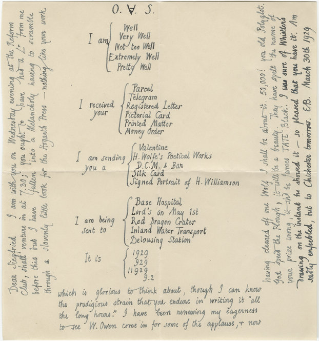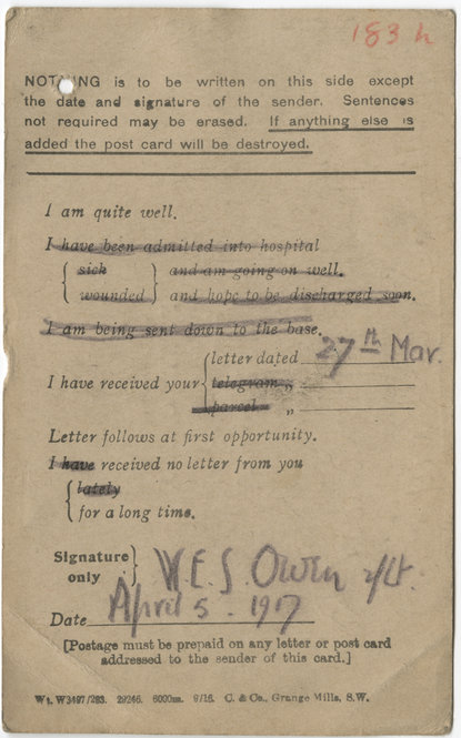 August 2, 2012, Filed Under: Books + Manuscripts, Research + TeachingPostcards from France: Paul Fussell and the Field Service “Form-letter” May 23, 2012, marked the passing of literary scholar and public intellectual Paul Fussell, whose monumental 1975 study of World War I, The Great War and Modern Memory, brought widespread attention to how the experience of trench warfare helped foster a modern, ironic sensibility that still influences art and culture today. Fussell’s book was the first in-depth study of the cultural legacy of the First World War and remains a landmark in the scholarship of early twentieth-century literature. As critic Vincent Sherry has written, the book’s “ambition and popularity move interpretation of the War from a relatively minor literary and historical specialization to a much more widespread cultural concern. [Fussell’s] claims for the meaning of the War are profound and far-reaching . . . . [he] has set the agenda for most of the criticism that has followed him.” Staff members who are working on the Ransom Center’s 2014 centenary exhibition Looking at the First World War have certainly found Sherry’s claim for the importance of Fussell’s influence to be true. Fussell, a former patron of the Ransom Center, centered his work on many of the British trench poets and writers whose manuscript collections are held at the Center. The Great War and Modern Memory frequently refers to the poem drafts, letters, and diaries of writers such as Wilfred Owen, Siegfried Sassoon, and Edmund Blunden. Fussell maintained that these writers—all of whom were young officers in the trenches of the Western Front—developed a new and often satiric poetic language that served to subvert the “official” rhetoric that was used by the British government and army. Combining biting irony with graphic descriptions of newly industrialized warfare—gas attacks and machine guns, for example—the Generation of 1914 sought to tell the public the eyewitness truth about modern combat. Numerous items that will be on display in the upcoming exhibition highlight Fussell’s observation that the First World War, as a watershed moment of the twentieth century, inspired soldier-poets to produce deeply personal accounts of their combat experience—often in direct response to government and army propaganda. One of The Great War and Modern Memory’s most memorable examples of the division between the “official” language of the War and the literary response to trench life is Fussell’s discussion of the standardized “Field Service Postcard” issued by the British Army in November 1914. Known as “Quick Firers,” these postcards were mass-produced in the millions and issued to infantry servicemen who would send them to family and friends as evidence of being alive and safe. The Ransom Center’s Wilfred Owen collection houses more than a dozen of the Field Service Postcards that the young poet-officer sent his family while on active duty in France during 1916–18. As you can see from this image of a postcard sent by Owen to his mother in 1917, the card forces the sender to report his well-being by choosing between uniform, pre-printed sentences: “NOTHING” written in the margins of the card is allowed, or else the card will be destroyed instead of sent. Thus, soldiers such as Owen faced what Fussell refers to as the “implicit optimism” of the Field Service Postcard: they were forced to report that they were “quite well, “going on well,” or were to be “discharged soon” and happily sent back home. The standardized sentences of the card did not allow soldiers to report, for example, that they were facing an artillery barrage, had lost limbs, or were wounded beyond hope of recovery. Owen, who detested the army’s censorship, made an agreement with his mother that if he were advancing to the front lines of battle he would send her a Field Service Postcard with the sentence “I am being sent down to base” struck out twice. The double strikeout is apparent in this postcard, sent just days before Owen was transferred to the Somme region of France, where he participated in some of the heaviest fighting of the War. In the years following the Great War, the Field Service Postcard, which Fussell calls the first widespread “form” letter, would be spoofed by poets and writers wishing to point out the lack of humanity in these standardized communications. As discussed in a blog post by Rich Oram, the Ransom Center’s Edmund Wilson and Evelyn Waugh archives reveal that both men mocked the “form-letter” model when sending or declining social invitations in the postwar period. This 1929 letter from the poet Edmund Blunden to Siegfried Sassoon, housed in the Ransom Center’s Siegfried Sassoon collection, demonstrates that the memory of the standard Field Service Postcard stayed with soldiers long after the Armistice. Blunden offers only alternative variations of “well” as a means of describing his mental state and mixes contemporary references with allusions to wartime objects or locations. When listing the possible enclosures of the letter, Blunden offers “H. Wolfe’s Poetical Works” or a “Signed Portrait of H. Williamson” (Humbert Wolfe and Henry Williamson were literary rivals of Blunden’s) alongside a “D.C.M. and Bar” (Distinguished Conduct Medal and insignia for a soldier’s uniform) and a “Silk Card” (an embroidered postcard that was often sent as a souvenir by British soldiers in France to their loved ones at home). Likewise Blunden brackets obsolete military destinations—“base hospital,” a “delousing station,” and “Red Dragon Crater” (a section of No Man’s Land where Blunden endured some of his worst combat experience)—with Lord’s, the famous London cricket ground beloved by both Blunden and Sassoon. In personalizing the “form-letter,” Blunden emphasizes the hollow and automated nature of the Field Serv