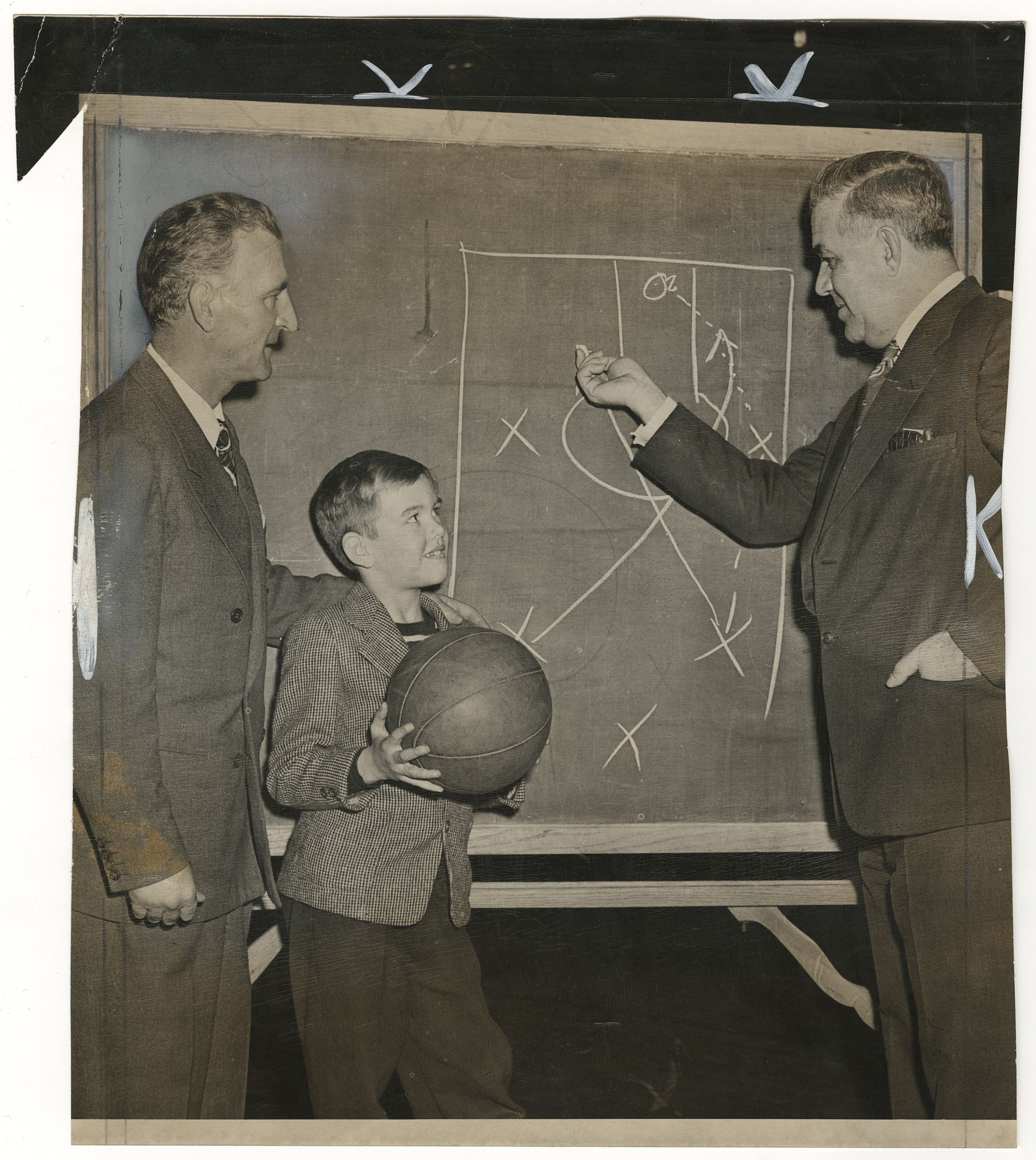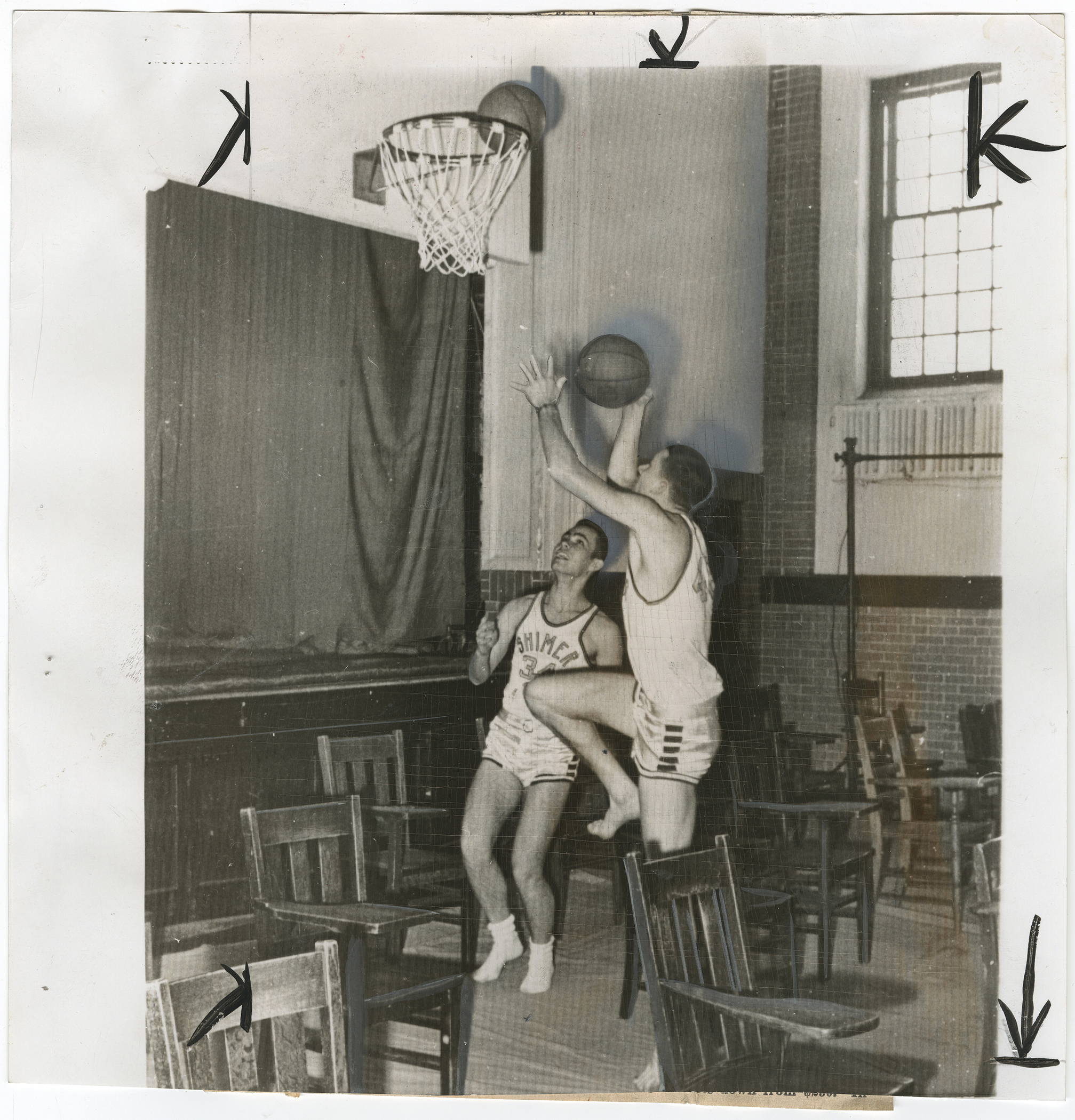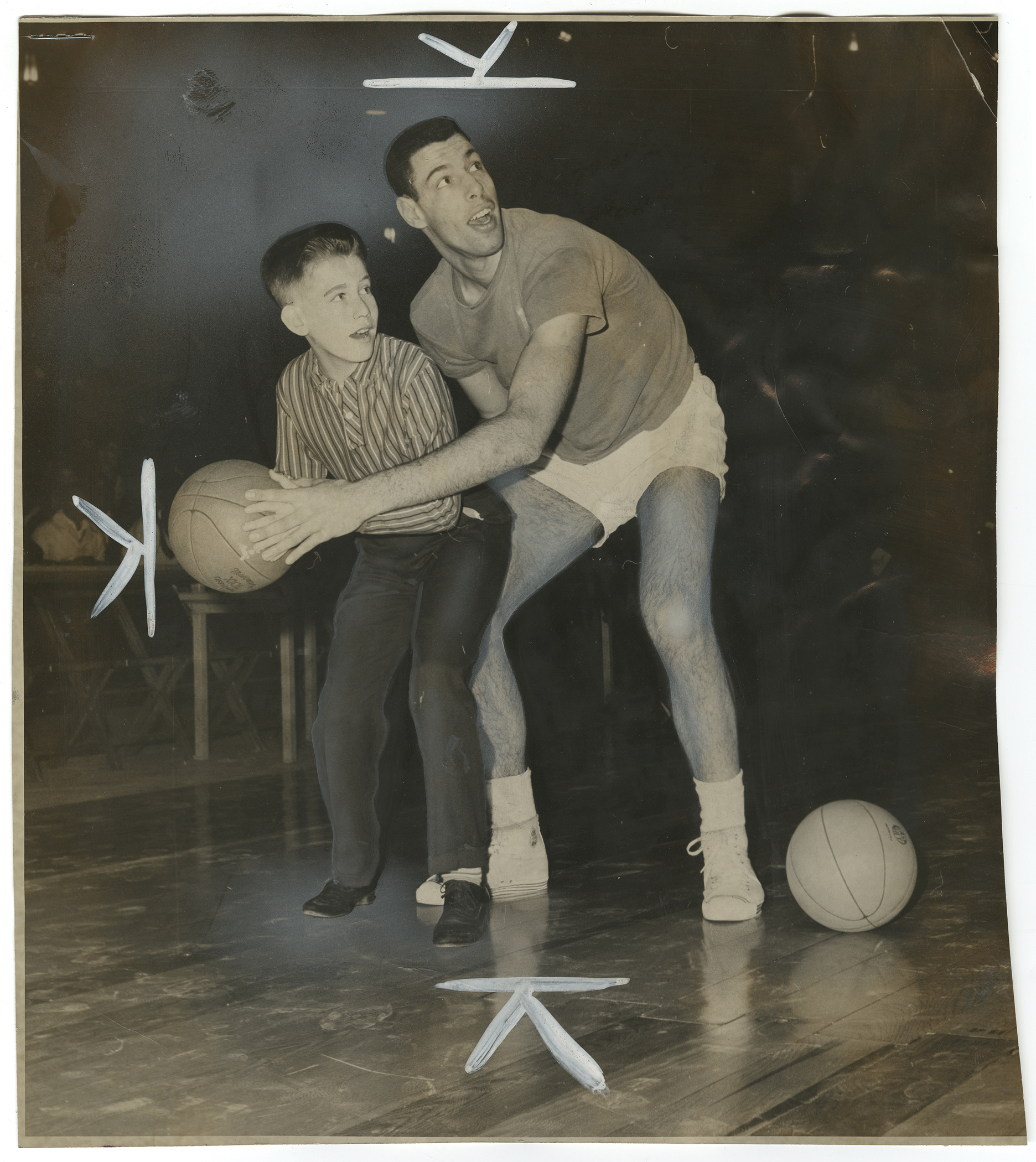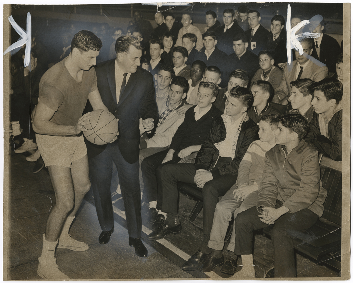 September 18, 2012, Filed Under: Exhibitions + EventsDisplay highlights basketball photos in "Basketball: Power in Play" Basketball, which began as a game invented to occupy young, energetic boys within the confines of a gymnasium on rainy days, has come to be one of the most popular sports in American culture. Basketball: Power in Play, a display of sports photographs from the Harry Ransom Center’s New York Journal-American collection, captures some of the key components of the game from the 1940s through the 1960s. From September 18 through December 9, 2012, visitors will be able to view images depicting various perspectives on the game such as training and technique, women in basketball, wheelchair basketball, the Harlem Globetrotters, and images of incredible shots and blunders. The 32 black-and-white photographs in the exhibition come from the New York Journal-American, which was published from 1937 to 1968. Soon after the newspaper’s demise, the Ransom Center gained ownership of the paper’s approximately two million prints and one million negatives. Many of the photographs in the display show original crop and edit marks used in the course of publication. Geared toward sports enthusiasts, the rich history and engaging narratives embodied in the photo captions will be sure to entertain and amuse. The display is one of several exhibitions and events across The University of Texas at Austin campus this fall capturing the spirit and history of basketball from its beginnings in a Massachusetts YMCA to the modern NBA. Courtesy of Suzanne Deal Booth and David G. Booth, the University’s Blanton Museum of Art will be presenting James Naismith’s “Original Rules of Basket Ball,” the 1891 document that outlines the 13 original rules of the game. The rules will be exhibited alongside the works of contemporary artist Paul Pfeiffer in The Rules of Basketball: Works by Paul Pfeiffer and James Naismith’s Original Rules of Basket Ball, running through January 13, 2013. The H. J. Lutcher Stark Center for Physical Culture and Sports will host a symposium during the fall 2012 semester about the history and cultural significance of basketball. Former undergraduate intern Rachel Platis selected the content for the Ransom Center’s display. The materials are on view in the Ransom Center’s lobby during exhibition gallery hours and in the third-floor Director’s Gallery, Monday through Friday, from 10 a.m. to 5 p.m. Please click the thumbnails below to view full-size images. “Clipping a Hawk on the Wing” (St. Louis Hawks vs. New York Knicks). “New York Journal-American,” February 25, 1961. Obstacle Course (Shimer College basketball team practice). Unidentified photographer, “New York Journal-American,” January 26, 1964. “Winning Combination” (high-school basketball champions dinner). Sheldon Gottesman for the “New York Journal-American,” April 6, 1960. Clair Bree (left) and Howard Cann diagram play for a basketball clinic. “New York Journal-American,” December 12, 1948. Violet Rays conduct first “New York Journal-American” basketball clinic for youth. Frank Jurkoski for the “New York Journal-American,” November 24, 1963. “Look at the Basket” (New York University’s Violet Rays at basketball clinic). “New York Journal-American,” April 2, 1962. Long Island University students protesting ban on sports following basketball scandal. Ed Pickwood for “New York Journal-American,” ca. 1951. “On a Tour of Europe” (Harlem Globetrotters and Pope John XXII). Unidentified photographer, “New York Journal-American,” August 9, 1961.