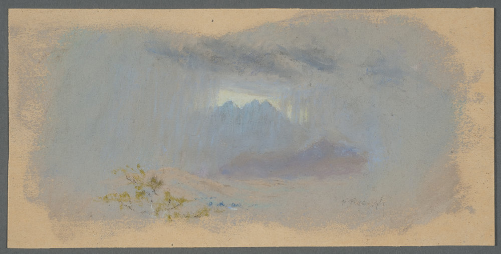 February 7, 2013, Filed Under: Art, Cataloging, Research + TeachingFrank Reaugh project reveals new details of the artist’s process The Ransom Center is currently engaged in a one-year, grant-funded project to digitize, catalog, process and make the Frank Reaugh art collection available online, which will be the first complete collection of the Ransom Center’s new digital asset management system. The project is ongoing and is expected to be completed and available online to viewers by the fall. The Frank Reaugh collection consists primarily of pastel landscapes on paper and board but also includes oil landscapes and portraits, charcoal sketches, and pen and ink drawings. Reaugh’s (1883–1937) favorite subject, the Texas Longhorn, is often featured within his untamed Texas landscapes. His work includes native subjects and locations ranging from the Texas Panhandle to the state’s western plains and mountainous regions and beyond the state border to New Mexico, Arizona, and Wyoming. Interest in Frank Reaugh has grown steadily over the years, as his contributions as an influential artist, arts educator, benefactor, naturalist, and inventor are being increasingly recognized by curators, collectors, and scholars. Access to the works has long been limited due to their delicate nature and to their sheer number and size. Digitization of the framed and often fragile works is not simple. Many of the pastels have never before been removed from their original frames and mats, which were largely constructed by Reaugh himself. Thus far, the first half of the collection has been digitized, beginning with Reaugh’s distinctive small-format pastel landscapes. When the project is finished, researchers will not only have unprecedented access to the entire body of Reaugh’s work held by the Ransom Center but will also have the opportunity to peer beneath the frames. During the process of removing these delicate pastels from their frames, there is often an unexpected surprise waiting beneath the window mat. Reaugh used his own technique to prepare the paper to hold the pastel media, and evidence of this applied fixative is easily visible in the margins of the paper support. A view of the margins of some of these pastels also reveals previously hidden inscriptions and areas where Reaugh tested his colors. One can see the well-delineated borders of his rectangular landscapes, which he sometimes stayed within, but more often allowed his strokes to extend beyond the intended space. Two pastels have even revealed outlined sketches on the reverse, offering insight into Reaugh’s preliminary drawing techniques. In addition to the works themselves, the framing materials and methods speak to Reaugh’s time on the cattle-trail, where it appears that he made use of whatever materials he had on hand. Images of each artwork (including the fronts and backs, framed and unframed) will be available via the Ransom Center’s new digital asset management system in the fall. Funding for the Frank Reaugh project is made possible with support from the Institute of Museum and Library Services and the Texas State Library and Archives Commission. Please click on the thumbnails below to view full-size images. “Rift in the Rain Cloud” by Frank Reaugh (1860-1945), front of framed work. Photo by Pete Smith. “Rift in the Rain Cloud” by Frank Reaugh (1860-1945), back of framed work. Photo by Pete Smith. “Rift in the Rain Cloud” by Frank Reaugh (1860-1945), front of pastel. Photo by Pete Smith. Untitled [light pink with hills] by Frank Reaugh (1860-1945), verso, showing sketch of a landscape. Photo by Pete Smith. “Rift in the Rain Cloud” by Frank Reaugh (1860-1945), showing uncovered backing board. Photo by Pete Smith. Untitled [light pink with hills] by Frank Reaugh (1860-1945), verso, showing sketch of a landscape. Photo by Pete Smith. “Clouds for OH” by Frank Reaugh (1860-1945), showing swatches of color in the top margin. Photo by Pete Smith. “Under Mesquites” by Frank Reaugh (1860-1945), showing an inscription in the margin. Photo by Pete Smith.