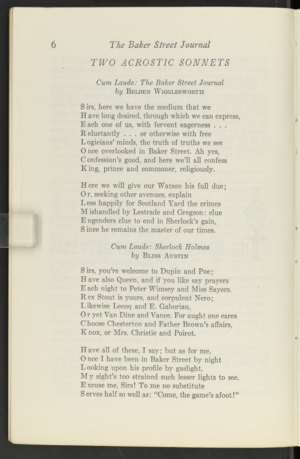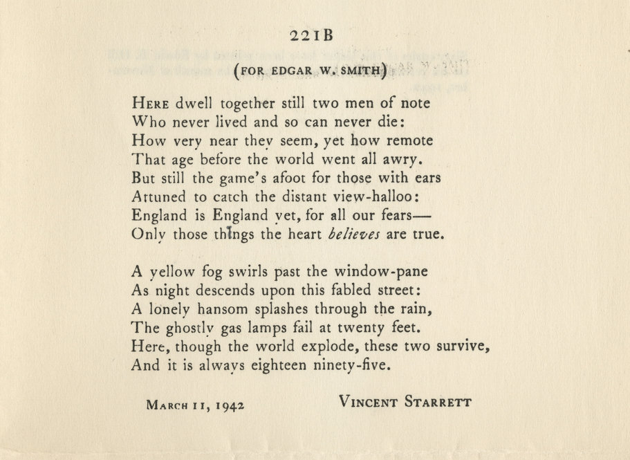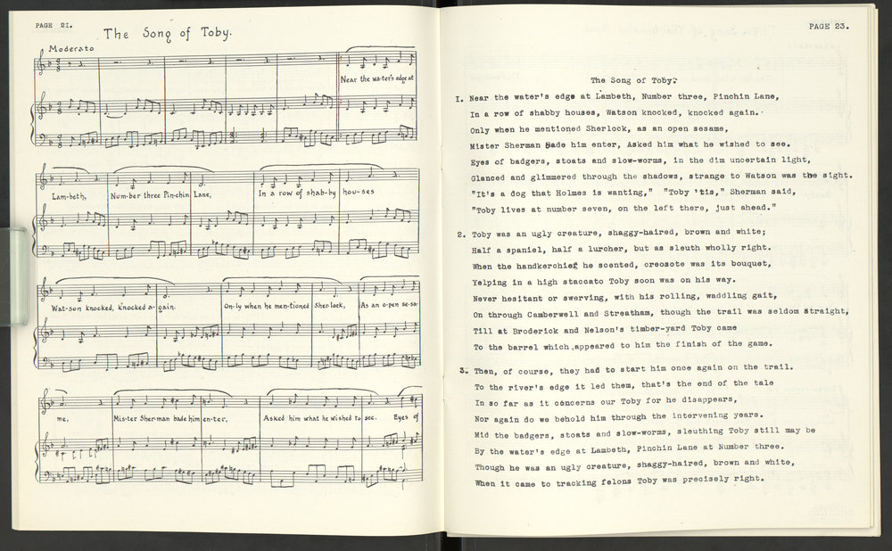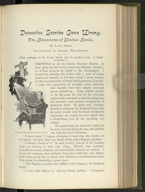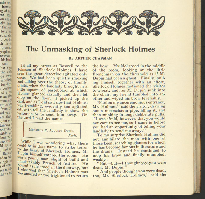 April 4, 2013, Filed Under: Authors, Research + TeachingSherlock Holmes’s Infinite Case-Book Many of the items discussed here are featured in the display “The Intertextual Sherlock Holmes,” which can be seen outside the Reading and Viewing Room on the second floor of the Ransom Center until April 21. While fanfiction may seem like an Internet-dependent phenomenon, its origins stretch far back into the past, beyond even the age of print. Adapting others’ literary creations for new purposes is at least as old as the Aeneid, in which Virgil adopts a minor character from Homer’s Iliad, Aeneas, as the hero of his story. The scholar Henry Jenkins has argued for fanfiction as modern myth-making, “a way of the culture repairing the damage done in a system where contemporary myths are owned by corporations instead of owned by the folk.” Just as ancient Greek storytellers could draw upon shared cultural knowledge to spin a tale featuring Theseus or Ariadne, their present-day counterparts seeking a similar resonance might instead turn to Harry Potter, Captain James T. Kirk—or Sherlock Holmes. Holmes captured the imagination of other writers almost from his inception. In 1891, an anonymous author published “My Evening with Sherlock Holmes” in The Speaker, less than four years after the detective’s 1887 debut in A Study in Scarlet. One might argue that it was not long before other writers were more enamored of Holmes than Sir Arthur Conan Doyle was himself, for Doyle attempted to kill off his obstreperous creation in 1893 in a thwarted effort to refocus attention on his historical fiction. Even Holmes’s apparent death at Reichenbach Falls did little to stem the rising tide of Sherlockian pastiches, parodies, and fanfictions, of which the Ransom Center holds a diverse selection. Published in Punch in January 1894, the eighth and last part of “The Adventures of Picklock Holes” by “Cunnin Toil” features the derivative detective tussling on the brink of a waterfall with his archenemy—Sherlock Holmes himself. Many of the early extra-canonical Holmes sightings crop up as brief, humorous episodes in newspapers or periodicals, often with absurd variations on the detective’s distinctive name. In 1892, The Idler featured the adventures of Sherlaw Kombs, while Punch followed in 1893 with tales of Picklock Holes. Even P. G. Wodehouse joined the fun, publishing “Dudley Jones, Bore-Hunter” in Punch in 1903. Andrew Lang, best known for editing the Blue Fairy Book and its sequels, took a more serious approach in his pastiche “At the Sign of the Ship” (Longman’s Magazine, 1905), in which Holmes applies his deductive powers to the unsolved mystery of Edwin Drood. Across the Atlantic, Arthur Chapman took time off from writing cowboy poetry to pen “The Unmasking of Sherlock Holmes” for The Critic (1905), in which Auguste Dupin derides Holmes as an attenuated derivative of himself. (The story ends with Holmes shamefacedly conceding his debt to Dupin.) While Chapman leaves Holmes at home in London, other authors took Holmes on some distinctly American adventures. In A Double Barrelled Detective Story (1902), Mark Twain transplants the detective to a California mining camp, much to the chagrin of his murderous nephew, Fetlock Jones. In “The Sleuths” (1911), Austin’s own O. Henry re-imagines Holmes as New York private eye Shamrock Jolnes, whose “thin, intellectual face, piercing eyes, and rate per word are too well known to need description.” The Center holds unusual copies of both books: Twain’s is a signed first edition from the author’s own library, while Henry’s is a tiny volume originally distributed as a free prize in cigarette packets. Alongside the proliferating Holmesian fictions, a tradition of tongue-in-cheek nonfiction also arose that treated Holmes and Watson as real people, with Doyle demoted to mere editor when he was acknowledged at all. In 1911, future mystery writer and Monsignor Ronald Knox regaled an Oxford audience with “Studies in the Literature of Sherlock Holmes,” couched in the stentorian style of Biblical exegesis. Knox’s disquisition not only presumed the actuality of Holmes himself, but also fabricated a bevy of rival Holmesian scholars, whose interpretations of the canon Knox demolished with great relish. Taken up by other enthusiasts, this practice of fan-nonfiction became known as the Higher Criticism or the Great Game. The Center’s collections include key entries in the genre by Vincent Starrett, H. W. Bell, S. C. Roberts, and Dorothy L. Sayers, among many others. Fascination with Holmes soon expanded beyond his English-speaking audience. A German newspaper wrote in 1908, “It is certain that contemporary Europe is suffering from a disease called Sherlockismus […] a literary disease similar to Werther-mania and romantic Byronism.” The Bookman concurred, diagnosing Paris with “what may be described as a bad case of Sherlockitis,” and citing some alarming symptoms: “In connection with two recent sensational murders the Paris newspapers have been giving their versions of how these crimes were committed in the form of imaginary interviews with Sherlock Holmes.” Versions of Holmes also thrived on the Spanish stage, with several plays produced and published between 1908 and 1916. While some of these drew directly on the canon, many were original works that borrowed only the character (and sometimes no more than the name) of Holmes. As Doyle’s frustration with Holmes’s popularity became more and more apparent, and new adventures appeared less and less frequently, fans turned to supplementing the canon with their own creations. After the publication of the final Holmes tales in 1927, a Wisconsin teenager named August Derleth started writing stories that both imitated and explicitly referenced Holmes, introducing his detective Solar Pons as “the Sherlock Holmes of Praed Street.” Derleth again translated his 
