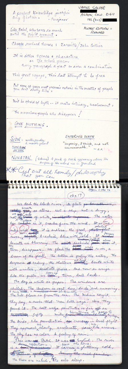 April 18, 2013, Filed Under: Authors, Books + Manuscripts"Write for readers like yourself": James Salter’s Novels Note: This post originally appeared on April 18, 2013. James Salter’s All That Is (Knopf), his first new novel since 1979, is a reflective work, a reconsideration of many of the themes he has explored in his earlier fiction. Looking back at Salter’s prior novels through his archive at the Harry Ransom Center, one can see the artist at work and better understand the sentiments that guide his craft. Some notebooks from Salter’s archive can be seen on The Daily Beast. Salter writes his novels by hand, covering notebook after notebook in a tidy, flowing script before typing—and retyping—his drafts. His archive is filled with these notebooks, which not only bear his earliest renderings of a story but also reveal the candid instructions and advice he pens for himself on their inside covers. For example, in the notebook of his 1979 novel Solo Faces, he writes to himself, “Don’t write something they will recognize & accept. Write something that will astonish, that is completely different from their ideas & world & will alter them.” Further down the page is his note, “Brief, lucid, mercilessly clear,” as accurate a description of Salter’s prose style as I have ever seen. The inside cover and first page of the notebook containing the first draft of James Salter’s 1975 novel, “Light Years.” In his opening notebook for Light Years, published in 1975, Salter instructs himself, “Don’t be afraid of length… it creates intimacy, involvement.” The novel itself is an exploration of intimacy and involvement, of love and the slow unraveling of a marriage. Salter revisits many of these concepts in his newest novel. In fact, Light Years may have been a sort of precursor to All That Is. The book’s title is plucked out of the description Salter gave of Light Years in a 1993 interview for the Paris Review: “The book is the worn stones of conjugal life. All that is beautiful, all that is plain, everything that nourishes or causes to wither.” Prominently recorded on the inside cover of Salter’s first notebook for the 1967 novel A Sport and a Pastime is an instructive quote by André Gide: “Write as if this were your only book, your last book. Into it put everything you were saving—everything precious, every scrap of capital, every penny as it were. Don’t be afraid of being left with nothing.” This advice must have been especially poignant for Salter. He succinctly and emphatically reinforces this sentiment within his notebook for Light Years: “SAVE NOTHING.” Pasted inside Salter’s opening notebook for Cassada, the 2001 retelling of his 1961 novel The Arm of Flesh, is a photograph of military planes not unlike the ones flown by the book’s characters and by Salter during his 12-year career in the U. S. Air Force. In his notebook, Salter outlines a straightforward, three-part plan for writing the novel: “SELECT INVENT EXPLAIN A BIT” There are no notebooks in Salter’s archive for his first novel, The Hunters, which was published in 1957 when Salter left the military to become a professional writer. The only draft of the novel in Salter’s archive is typed and labeled, “First submitted draft, originally titled “A Patron of Tokoshi’s” by John Eden” (a pseudonym). Inserted into the draft is Salter’s typed outline of the novel, titled “Rough Re-Outline,” which is covered with the checkmarks of progress and Salter’s handwritten notes. A hallmark of Salter’s creative process, detailed outlines can be found throughout his archive for his subsequent novels. Salter’s notebooks and outlines reveal a deliberate author at work, one who has a clear vision of both the novel he wants to create and the one he wants to avoid. One of his most illuminating instructions to himself, written and underlined on the inside cover of his notebook for Solo Faces, is the simple note: “Write for readers like yourself.”
