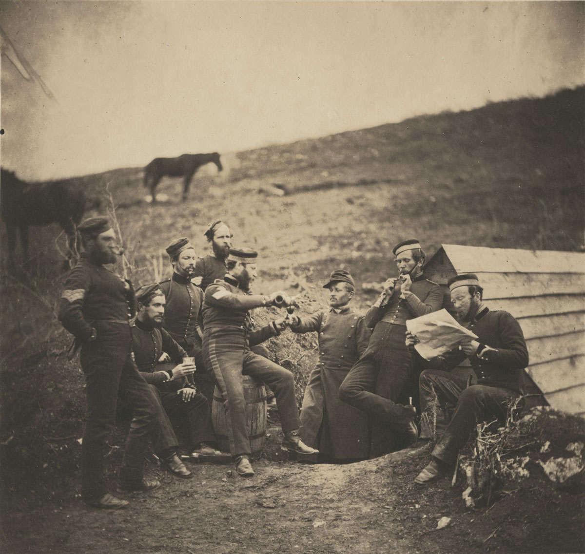 January 16, 2014, Filed Under: Exhibitions + Events, Photography, Research + TeachingWar photography exhibition showcases images from the Ransom Center’s photography collection Back in November the exhibition WAR/PHOTOGRAPHY: Images of Armed Conflict and Its Aftermath opened at its fourth and final venue, the Brooklyn Museum. This exhibition, which I curated with Anne Tucker and Will Michels in my former role in the photography department at the Museum of Fine Arts, Houston, featured over 400 photographic objects dating from 1848 to 2012, including a number of photographs from the Harry Ransom Center’s collections. Our curatorial mission was neither to tell a history of war illustrated by photography nor to present a series on singular photographers. Instead, we hoped to bring together a selection of objects that highlighted the intersections between war and photography. Photographs from the Ransom Center collections were included throughout the exhibition, enriching the thematic sections that explored daily routine, shell shock, and dissemination, as well as battlefield burial and death. The Gernsheim collection yielded a chilling 1871 print of communards in coffins, an image likely used to discourage further unrest in the streets of Paris, as well as Roger Fenton’s iconic and controversial 1855 photograph The Valley of the Shadow of Death from the Crimean War. A Ransom Center fellowship funded by the Andrew W. Mellon Foundation Research Fellowship Endowment enabled curator Anne Tucker to spend weeks going through box after box of the Ransom Center’s prints, lantern slides, and stereographs. While in the reading room, she could compare the croppings of multiple photographs of Captain Ike Fenton and the U.S. Marines during the Korean War by David Douglas Duncan and share her findings. She also surveyed the collection of prints made at the height of the civil war in El Salvador by 30 international photographers, including Donna DeCesare and Harry Mattison. The New York Journal- American photo morgue provided one of my favorite photographs in the exhibition. It is a small print from 1918 of a carrier pigeon being released from a tank on the Western Front. The image itself references one of the means of communication (pigeon transport) that is often associated with World War I, but it is also important as a photographic object because it carries the marks and highlights of an editor’s pencil, readying the print for reproduction and the image for dissemination. Please click on the thumbnails below to view larger images. David McLellan. “Releasing Carrier Pigeon from Tank, Western Front,” August 1918. Gelatin silver print. Roger Fenton. “The Valley of the Shadow of Death,” 1855. Salted paper print from a paper negative. Felice Beato. “Gallows on which two of the King of Delhi’s sons were hanged for having taken part in the murder of the English resident at Delhi at the commencement of the mutiny, India,” May 1857. From the album “Photographic views, Crimea, India &c.” Albumen print. David Douglas Duncan. “Corporal machine-gunner Leonard Hayworth upon learning there were no more grenades, ammunition from his machine-gun reinforcements to take the place of the wounded and dead or communication from the rear, Korea,” September 1950. Gelatin silver print. David Douglas Duncan. “Captain Ike Fenton, Commanding Officer of Baker Company, 1st Battalion, 5th Marine Regiment, 1st Provisional Marine Brigade, receives reports of dwindling supplies during the battle to secure No-Name Ridge along the Naktong River, Korea,” September 1950. Gelatin silver print. James (Jimmy) H. Hare “Men carrying wood to a pyre in the fields near Lioyang where five dead are laid out,” ca. 1904–1905. Lantern slide. James (Jimmy) H. Hare. “Taking a bath at twelve below zero in December along the Sha O River,” c. 1904–1905. Gelatin silver print. Unknown photographer. “Insurgents in Coffins, Paris,” 1871. Albumen print. Roger Fenton. “L’Entente Cordiale,” February 29, 1856. Salted paper print. Harry Mattison. “Nuns Leaving the cathedral after the funeral of Archbishop Romero,” March 30, 1980. Gelatin silver print. Timothy O’Sullivan. “A Harvest of Death,” July 4, 1863. Albumen silver print.