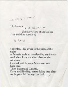 January 16, 2014, Typescript pages annotated by Billy Collins of his poem “The Names,” which commemorates victims of the September 11, 2001 attacks. Collins read the poem before a special joint session of Congress on September 6, 2002.