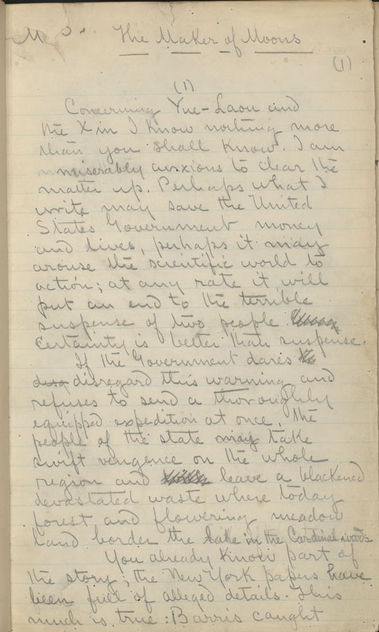 March 13, 2014, Filed Under: Books + ManuscriptsSix Degrees of Separation: “True Detective” and the Ransom Center I am already missing Rust Cohle, Marty Hart, and sinister references to the “Yellow King.” If you are not sure what I am talking about, it’s the first season of the HBO crime series True Detective. A ritualistic murder investigation set against a backdrop of oil refineries in the swamps of the Louisiana bayou, True Detective is full of philosophical musings and obscure literary references including spiral symbols, black stars, yellow kings, and a fictional place named Carcosa. What does any of this have to do with the Ransom Center? As I watched Rust and Marty enter into a wicked, sunken maze of brick tunnels, I thought “I bet the Ransom Center has a link to this show.” With the Center’s many collections in literature, film, photography, art, performing arts, and rare books, I am quite sure it is possible to connect almost any news story or popular culture reference to one of the Ransom Center’s collections in fewer than six degrees. Can I link Matthew McConaughey to the Ransom Center? Start 1. Journalist and short-story writer Ambrose Bierce wrote the horror story “An Inhabitant of Carcosa” in 1886. The story explores death, light, and darkness and is about a man who awakens from a sickness-induced sleep to find himself lost in an unfamiliar wilderness. Sound familiar? The Ransom Center has three photos of Ambrose Bierce in the Literary File Collection (box: PH:LF:Small Alphabet). 2. Writer Robert W. Chambers borrows the name of Ambrose’s ancient city, Carcosa, and builds it into a mysterious and cursed city in his collection of short stories The King in Yellow. The stories in the book are linked by a fictional play of the same name, which induces despair and insanity in those who read it or see it performed. Considered “weird fiction” under the subgenre of speculative fiction, Chamber’s The King in Yellow has inspired many writers, including H. P. Lovecraft. The Ransom Center owns an 1895 edition of The King in Yellow. It is just one of the 35,000 volumes in the L.W. Currey science fiction and fantasy collection (call number: PS 1284 K563 1895a). Despite being out of copyright and freely available on the internet, the book has created literary buzz and climbed into a best-selling spot on Amazon. According to the Wall Street Journal, after episode five of True Detective, sales increased 71percent, elevating The King in Yellow into spot No. 7 on Amazon.com. The Ransom Center also has some letters by Chambers and the handwritten draft of his short story “The Maker of Moons,” which was the title story of his 1896 short story collection (collection: Robert W. Chambers in Little Alphabet and Uncataloged Little Alphabet). 3. The HBO series True Detective is full of direct quotes and visual references to Chamber’s The King in Yellow. 4. Matthew McConaughey stars as detective Rust Cohle in True Detective. Alright, alright, alright. Your turn! Please click on thumbnails below to view larger images. An 1895 edition of “The King in Yellow” by Robert W. Chambers. Photo of Robert W. Chambers, author of “The King in Yellow.” Title page of “The King in Yellow” by Robert G. Chambers. Page from “The King in Yellow” by Robert G. Chambers. Page from “The King in Yellow” by Robert G. Chambers. Page from “The King in Yellow” by Robert G. Chambers. Page from Robert W. Chambers’s manuscript of “The Maker of Moons.” Page from Robert W. Chambers’s manuscript of “The Maker of Moons.” Page from Robert W. Chambers’s manuscript of “The Maker of Moons.” Page from Robert W. Chambers’s manuscript of “The Maker of Moons.” Page from Robert W. Chambers’s manuscript of “The Maker of Moons.”