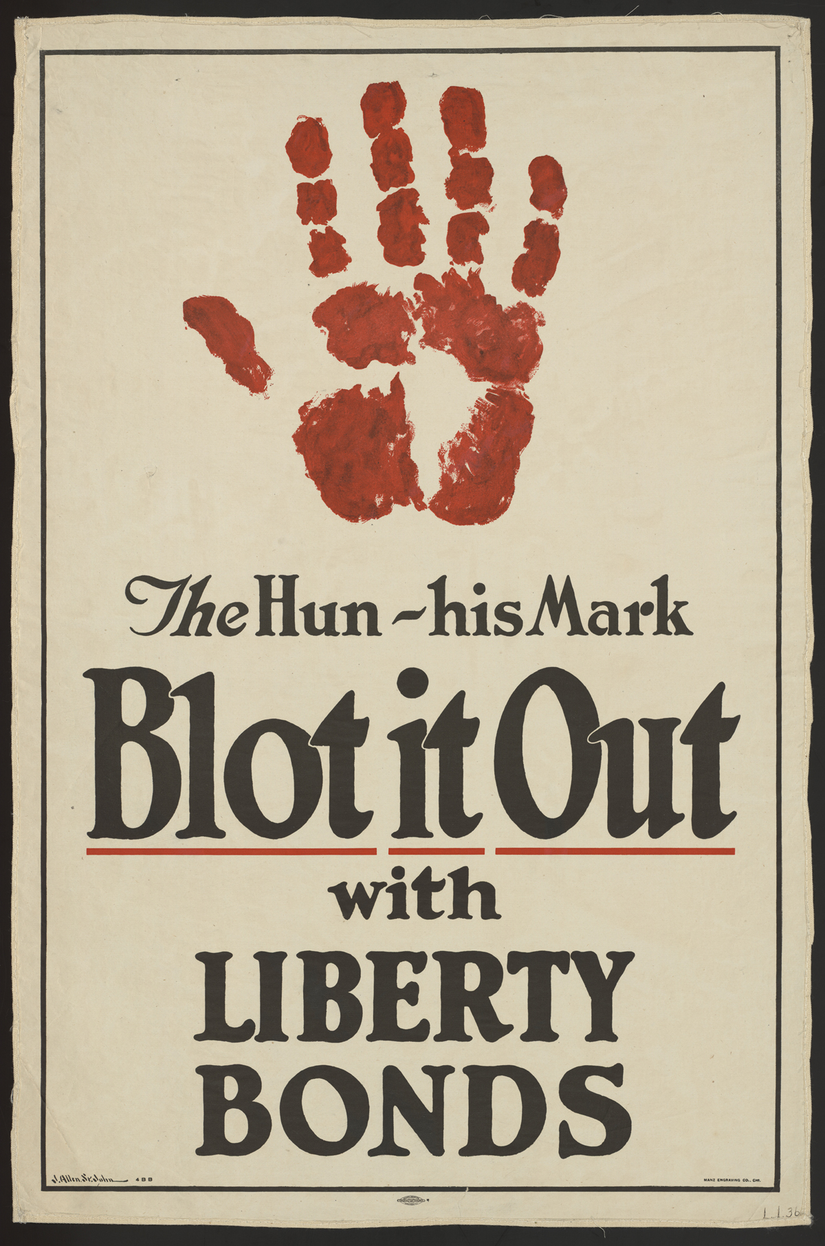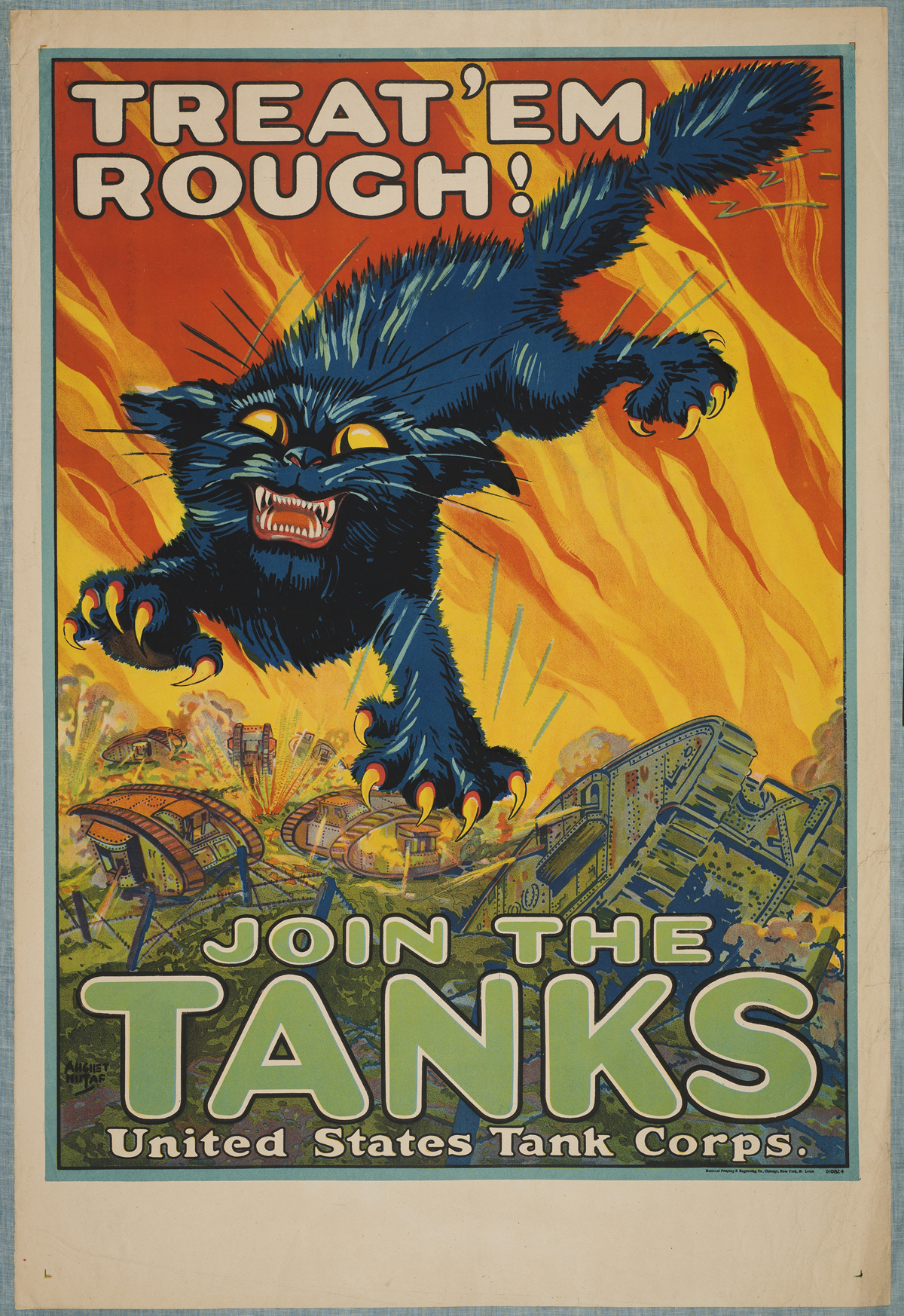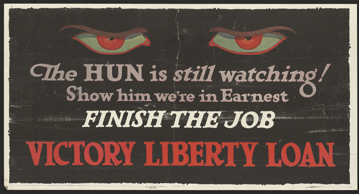 April 10, 2014, Filed Under: Art, Digital Collections, Exhibitions + EventsExplore World War I propaganda posters online The Ransom Center recently launched a new platform of digital collections on its website, which includes the World War I poster collection. More than 120 items from that collection, including the posters highlighted in this blog post, can be viewed on the new platform. Some of these posters can also be seen in the current exhibition The World at War 1914–1918. In the era before broadcast radio and television, posters were one of the simplest and most powerful ways to coerce or inform the public. During the First World War, all the major powers produced posters to convey messages rapidly and efficiently. Some of the most successful paired compelling imagery and bright visceral color with appeals to emotion, patriotism, and duty. As an American artist said, “The poster should be to the eye what the command is to the ear.” The Ransom Center’s World War I poster collection illuminates the lived experience of the war from the point of view of everyday people worldwide. Lithographs in English, French, German, and Russian illustrate a wide spectrum of sentiments from military boosterism to appeals for public austerity. (English translations of foreign-language poster titles are available in the description of each item.) The posters document geo-political events and the social and economic transformations set in motion by the war. The role of women, new technologies, international aid, wartime economy, and food supply all feature prominently in the collection. The majority of the posters in the Center’s collection are authentic lithographs. Discovered in the late eighteenth century, the techniques of lithography reached a golden age during the First World War. In the modern four-color process, combinations of colors are separated using photographic filters into four primary colors: cyan, magenta, yellow, and black. To print lithographs, colored ink is added to printing “stones” in solids and patterns. The ink only adheres to marks on the wet stone made by a greasy crayon. Early lithographs featured simple blocks of solid colors. By the turn of the century, artists harnessed overlay and blending to create more subtle visual effects. The World War I poster collection features many works by notable artists who applied their talents to the war effort. Among them, the French caricaturist Georges Goursat (1863–1934), known as Sem, stands out for his skillful application of lithographic techniques to create sumptuous gradients of color and shadow. His poster Pour la liberté du monde depicts the Statue of Liberty, a gift to the United States from the people of France, appearing on the horizon over the Atlantic Ocean. In the soft pink and yellow sky, a new day is dawning, and Lady Liberty emerges from shadow. It is no coincidence that the French name for the Statue, La Liberté éclairant le monde, translates to “Liberty lighting the world.” Produced in 1917 shortly after the United States entered into the war, Sem’s poster suggests that the American soldiers will turn the tides of battle and bring liberty to Europe. The artist conveys most of his message wordlessly. The text urges support through the purchase of a war bond: For the liberty of the world. Subscribe to the National Loan at the National Credit Bank. Pour la liberté du monde pairs artistry and symbolism to rouse support among the war-fatigued French public. Explore the World War I poster collection to see more examples of artists using lithography to transform political ideas into persuasive compositions of image and text. Please click on thumbnails below to view larger images. Unknown artist. “Soglasie” (“согласие”). 1915. [Agreement or Triple Entente]. Lithograph. 71 x 54 cm. Sem (1863–1934). “Pour la liberté du monde. Souscrivez á l’Emprunt National á la Banque Nationale de Crédit.” [For the freedom of the world. Subscribe to the National Loan at the Banque Nationale de Crédit.] 1917. Lithograph. 119 x 77 cm. Lucille Patterson. “Service. National League for Women’s Service. Fall In!” ca. 1914–1918. Lithograph. 63.5 x 44 cm. Z. P. Nikolaki. “Hello! This is Liberty speaking.” 1918. Lithograph. 30.5 x 22.5 cm. Unknown artist. “The Hun is still watching!” 1917. Lithograph. 28 x 53.5 cm. Ellsworth Young. “Remember Belgium. Buy bonds.” 1918. Lithograph. 77 x 51 cm. James Allen St. John (1872–1957). “The Hun. His mark. Blot it out with Liberty Bonds.” 1917. Lithograph. 76.5 x 50 cm. William P. King. “Hold up your end!” ca. 1914–1918. Lithograph. 70 x 51.5 cm. Harry R. Hopps (1869–1937). “Destroy This Mad Brute. Enlist – U.S. Army.” 1917. Lithograph. 106 x 71 cm. August William Hutaf (1879–1942). “Treat ’em rough. Join the tanks.” 1917. Lithograph. 104 x 70 cm.