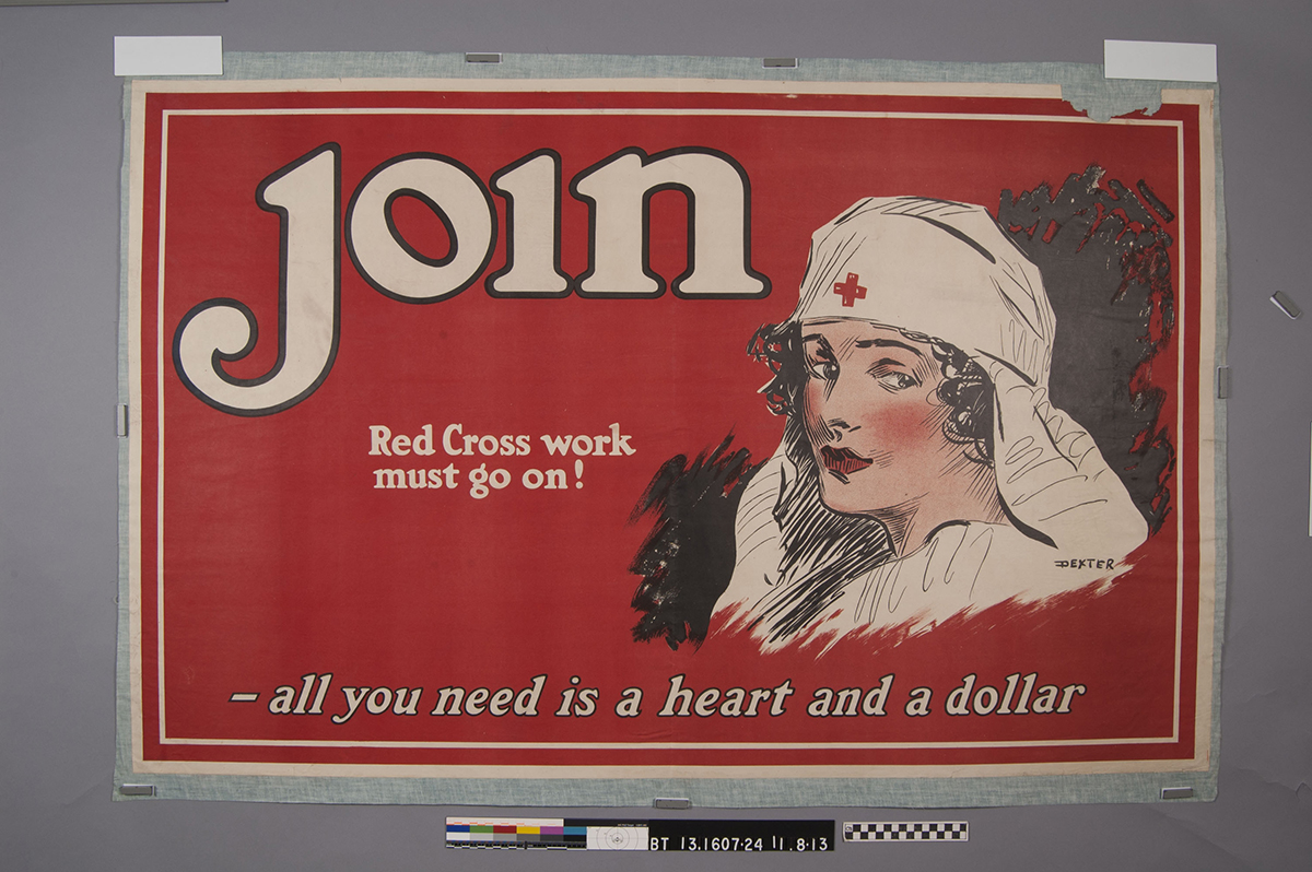 April 25, 2014, Filed Under: Art, Conservation, Exhibitions + EventsWorld War I Red Cross poster undergoes conservation treatment for exhibition The conservation department at the Harry Ransom Center treated many collection items in preparation for the current exhibition The World at War 1914–1918. Among these were numerous posters of various sizes, including a mural-sized poster (about 3 x 5 feet) depicting a Red Cross nurse. The poster reads: “Join—Red Cross Work Must Go On!—all you need is a heart and a dollar.” The poster came to the paper conservation lab having been lined in the past with a heavy, blue, starch-filled cloth, much like that used for binding books. This inappropriate fabric lining was noticeably wrinkled, and the blue color accentuated a large loss near the upper right corner of the poster. We made the decision to remove this lining and flatten the cockled poster. We also decided to fill the loss with a toned paper to make this area less distracting to the viewer. First, we surface cleaned the poster using a large, soft brush to remove loose dust and dirt. We continued cleaning the surface grime with rubber sponges, sometimes referred to as “soot sponges.” To remove the lining fabric, we needed to bathe the poster, which would loosen the lining adhesive and allow us to gently peel back the fabric. We tested all of the inks to ensure that they would not be sensitive to water, and we then pre-humidified the print and bathed it in deionized water at a neutral pH. The adhesive began to soften within only a few minutes, and we were able to separate the lining from the poster. While the poster was still in the water bath, verso upward, we could feel that there was still adhesive clinging to the back of the paper. We used wads of cotton to swab off this residual adhesive. We exchanged the water bath two times until we were confident that we had cleaned it as well as we could. Next, we lifted the wet poster out of the bath. Handling wet paper is not difficult because we include a layer of spun polyester—called Reemay—on both the front and back of an item when we bathe it. The Reemay acts as a support during the bath and afterwards, when transporting the wet paper. The poster was allowed to dry flat between layers of Reemay and blotters, under weight. About a week later, we removed the poster from under the weight and began work on the fill. In paper conservation, Japanese paper is often used to fill losses. This strong, thin paper works well for repairing or filling losses and can be toned to a suitable color. The poster’s missing portion covered both red and off-white sections. We toned a Japanese paper with red acrylic paint and layered this over an off-white Japanese paper. The fill was then shaped to fit the loss and adhered in place with wheat starch paste. Again, the poster was placed between Reemay and blotter, under weight to ensure that the fill would dry flat. Once the poster was completely dried, the fill was trimmed along the outside edge. This treatment was unusual only in that the poster is so large. Otherwise, the techniques described here are common treatments in paper conservation. Please click on thumbnails to view larger images. Before treatment: the poster is lined with a blue cloth. The poster is wrinkled and has a large loss near the upper right corner. Photo by Heather Hamilton. Conservators placing the lined poster into a large bath of deionized water. Here we see the back of the lining and one corner of the front of the poster. Photo by Pete Smith. Jim Stroud pulls back the lining fabric while holding the poster securely with a tool. Photo by Pete Smith. Conservators remove the poster from the bath. They are able to handle the wet paper because it is layered between strong sheets of spun polyester, called Reemay. The poster clings to the Reemay as it is pulled from the water. Photo by Pete Smith. After bathing, the poster is placed between layers of spun polyester and wool felts to allow it to dry flat. A rigid board is laid over the felts and weights are added. It will stay this way for about a week. Photo by Heather Hamilton. Filling the loss with toned Japanese paper torn to shape. The fill is applied to the back of the poster with wheat starch paste. Photo by Heather Hamilton. Tools used for preparing the fill. Mylar with an outline of the loss, Japanese paper to be cut to size, a water pen to help tear the paper with a soft edge, wheat starch paste to adhere the fill in place. Photo by Heather Hamilton. The fill completed. Photo by Heather Hamilton. After treatment. Photo by Heather Hamilton.