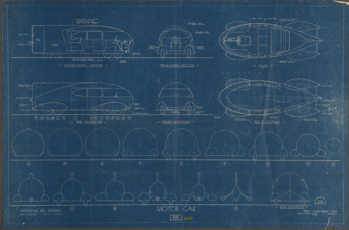 July 10, 2014, Filed Under: Exhibitions + Events, Theatre + Performing ArtsHigh Museum of Art’s “Dream Cars” exhibition features drawings, designs from Norman Bel Geddes collection “We dream of cars that will float or fly, or run on energy from a laser beam, or travel close to the ground without wheels. Such research may border on the fantastic, but so did the idea of a carriage going about the country without a horse.” –The Ford Book of Styling, 1963 The High Museum of Art in Atlanta is currently hosting the exhibition Dream Cars, which includes items from the Ransom Center’s Norman Bel Geddes collection. The exhibition showcases the innovative and artistic design of rare vehicles from the early 1930s to 2010 and encompasses the evolution of the automobile from a horseless carriage to a sleek, highly functional speed machine. Dream Cars highlights designs and models from across Europe and the United States, including a blueprint, a photograph, and three drawings of Bel Geddes’s 1932 design, Motorcar No. 9. The exhibition brings together 17 concept cars, including designs from Ferrari, Bugatti, General Motors, and Porsche. These vehicles are paired with conceptual drawings, patents, and scale models to demonstrate how imaginative designs and innovation changed the automobile from a basic, functional object to a symbol of limitless possibilities. None of the vehicles and designs on display in this exhibition were ever intended for production. Rather, they represent the “dream” of future possibilities and highlight the talent and imagination of industrial designers. Bel Geddes was an American theatrical and industrial designer who gained fame in the 1920s, ’30s, and ’40s. The Motorcar No. 9 model demonstrates his expertise in aerodynamics and streamlining as a means to modernism. The Ransom Center’s extensive Norman Bel Geddes archive> includes a model of Motorcar No. 9 among other papers, designs, and artifacts that span 50 years. Related content: Video: Curator of Norman Bel Geddes exhibition discusses influence of the industrial designer Please click on the thumbnails below to view larger images. Norman Bel Geddes. “Motorcar No. 9 composite drawing.” Ca. 1932. Norman Bel Geddes. “Motorcar No. 9 Rearview.” Ca. 1932. Norman Bel Geddes. “Motorcar No. 9 Blueprint.” Ca. 1932. Model of Norman Bel Geddes’s “Motorcar No. 9.” Ca. 1933. Photo by Pete Smith.