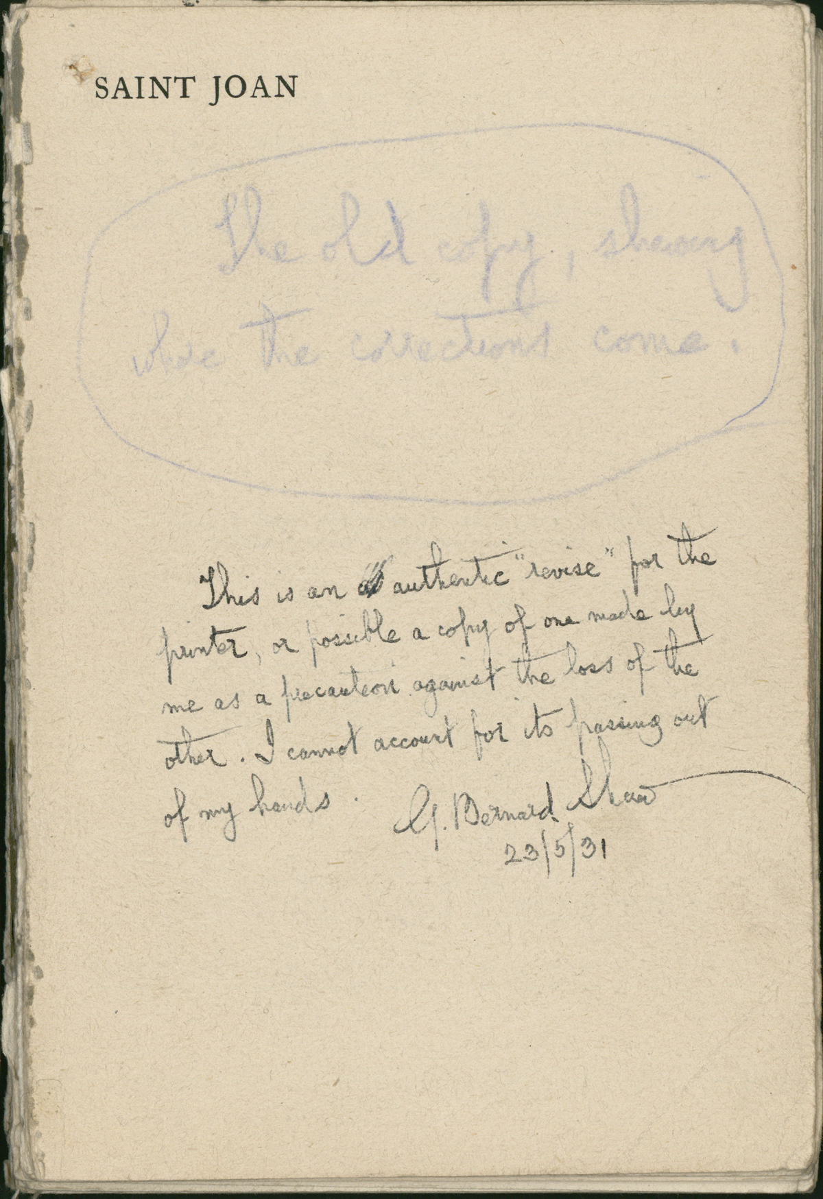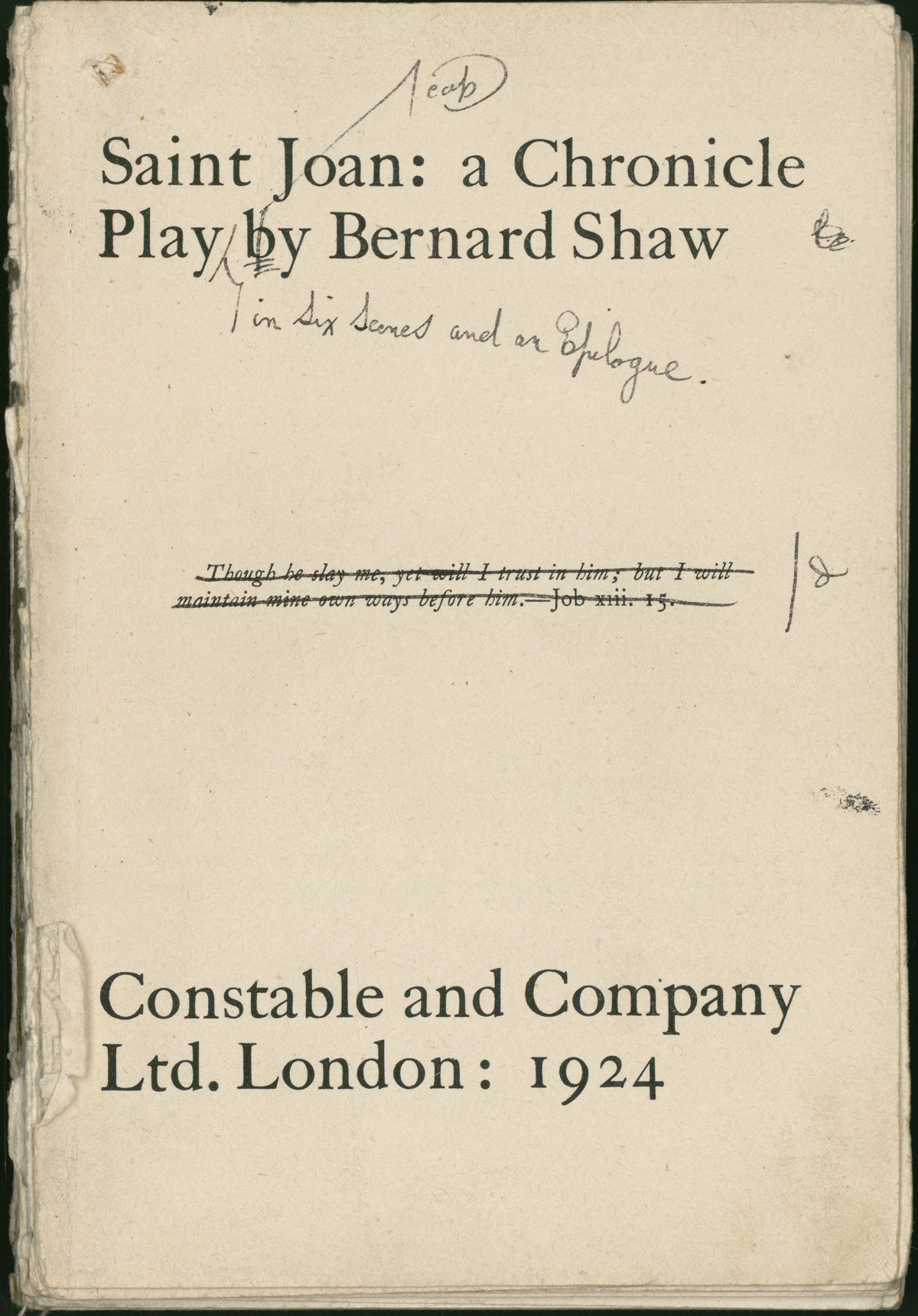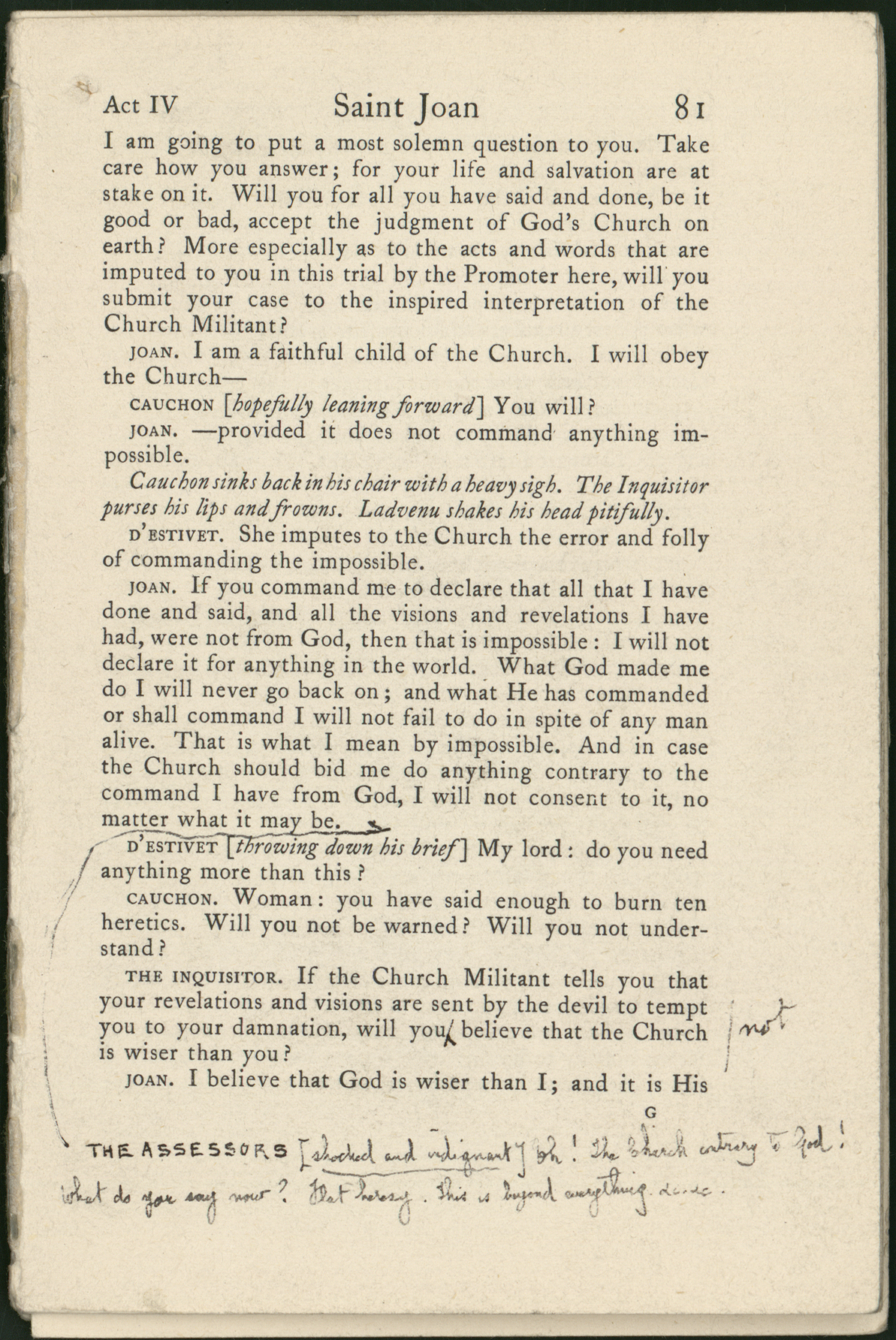 August 13, 2014, Filed Under: Books + Manuscripts, Research + Teaching, Theatre + Performing ArtsFellows Find: Scholar explores eleventh-hour additions to George Bernard Shaw’s corrected proof of play “Saint Joan” Alex Feldman, an Assistant Professor in the English Department at MacEwan University, Alberta, visited the Ransom Center to consult the papers of George Bernard Shaw, Lillian Hellman, and Arthur Miller, among others. His research, supported by the Dorot Foundation Postdoctoral Research Fellowship in Jewish Studies, focused on the dramatization of historical trials specifically those of Joan of Arc and the witches of Salem, in twentieth-century drama. The Ransom Center is celebrating the 25th anniversary of its fellowship program in 2014–2015. The Ransom Center’s cataloging card describes the volume on my desk as a “Rough Proof” of George Bernard Shaw’s play Saint Joan (1923). On the title page—the book is missing a cover—a faint pencil inscription in Shaw’s hand reads, “the old copy showing where the corrections come.” According to Brian Tyson’s account of the play’s development (The Story of Saint Joan), the revisions that appear in this copy date from Shaw’s holiday in Parknasilla, County Kerry, in September 1923, three months before the play’s New York premiere and six months prior to its first performance in London. The ink annotation below, made almost eight years later, reads, “This is an authentic ‘revise’ for the printer, or possible [sic] a copy of one made by me as a precaution against the loss of the other…” What this copy and its corrections reveal is that a collective voice of great prominence in Shaw’s trial scene was added at a very late stage in the play’s composition. Here, in Shaw’s hand, “The Assessors” make their first appearance. Sixty or so French and English clerics of assorted order and rank, the assessors fulfilled a quasi-juridical function at Joan’s trial, acting in a consultative capacity under Pierre Cauchon, Bishop of Beauvais, who presided over the proceedings, and Jean Lemaitre, vicar of the Inquisition at Rouen and Joan’s second judge. The likelihood is that, whether intimidated, coerced, or otherwise incentivized, many of the assessors could be counted on to lean, as Cauchon directed, in favor of Joan’s excommunication (and subsequent execution.) But their presence in Rouen and their substantial role in the trial did indicate a serious regard for procedural fairness. According to the trial transcripts, Cauchon, eager to present them as incorruptible, described the assessors as “ecclesiastical and learned men, experienced in canon and civil law, who wished and intended to proceed with [Joan] in all piety and meekness.” Shaw, by contrast, though he deviates from the melodramatic tradition that portrays the assessors as “malignant scoundrels,” presents them as a shrill chorus of righteously indignant imbeciles. Here’s a representative interjection, which affords some insight into the rationale behind Shaw’s eleventh-hour additions to the text. Under Cauchon’s interrogation, refusing to disavow the heavenly provenance of her “visions and revelations,” Joan declares that she will continue to be guided by God’s will. “In case the Church should bid me do anything contrary to the command I have from God,” Joan declares, “I will not consent to it, no matter what it may be.” Here, in the proof copy, the following insertion appears (see below image): THE ASSESSORS [shocked and indignant] Oh! The Church contrary to God! What do you say now? Flat heresy. This is beyond everything. The playwright isolates the objectionable detail—“The Church contrary to God!”—in case the audience has missed it, and offers it up to the spectator’s scrutiny once again, via the medium of the assessors’ protest. Here and throughout, the assessors perform a mediating function, clarifying, for Shaw’s audience, the nature of Joan’s heresy, as contemporary clerics perceived it. (See images below for further examples.) The development of this choric voice, identifying and decrying Joan’s seminal transgressions, adds weight to the anti-Joan sentiment building throughout the trial among the clergy. The assessors’ interjections are crucial to Shaw’s establishment of his protagonist’s perceived theological-legal guilt (in the identification of her heresy), but they are also instrumental in advancing Shaw’s argument that the world is always unprepared for the saints in its midst. A rabble of censorious mediocrities, these men are not evil—“there are no villains in the piece,” Shaw insisted—but they do contribute to the sense that middlebrow opinion (ever the object of Shaw’s critique) and unthinking conformity to the conventional canons of belief create insuperable obstacles to the recognition of genius. I am grateful to Jean Cannon and all of the staff at the Ransom Center for their expert guidance, to Willow White for her timely assistance, and to Sos Eltis and Peter Raby for their support of my fellowship application. Please click on thumbnails below to view larger versions. The pencil note reads “the old copy showing where the corrections come.” In ink below it: “This is an authentic ‘revise’ for the printer, or possible [sic] a copy of one made by me as a precaution against the loss of the other. I cannot account for its passing out of my hands. G. Bernard Shaw. 23/5/31” Though Shaw made these revisions in September 1923, since he had not yet begun work on the Preface, and Constable & Co. were aware that this was to be a substantial undertaking, 1924 is printed here as the prospective date of publication. “THE ASSESSORS: [whispering] Protestantism! What was that? What does the Bishop mean? Is it a new heresy? The English commander, he said. Did you ever hear of Protestantism? &c. &c.” Joan’s trial pre-dates the Reformation by almost a century, 