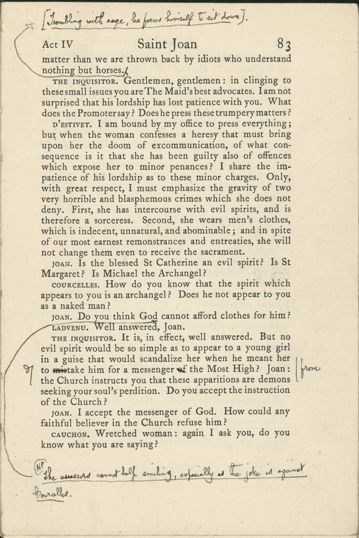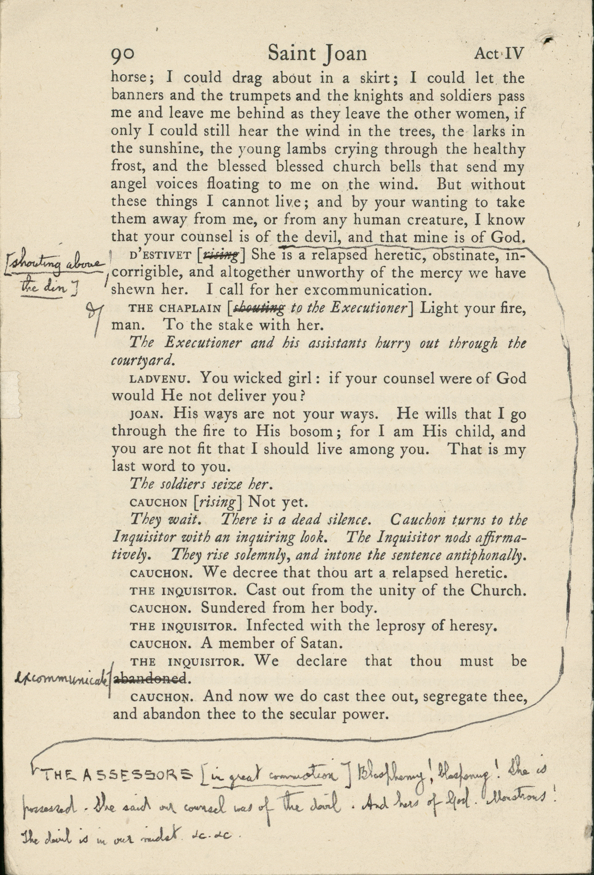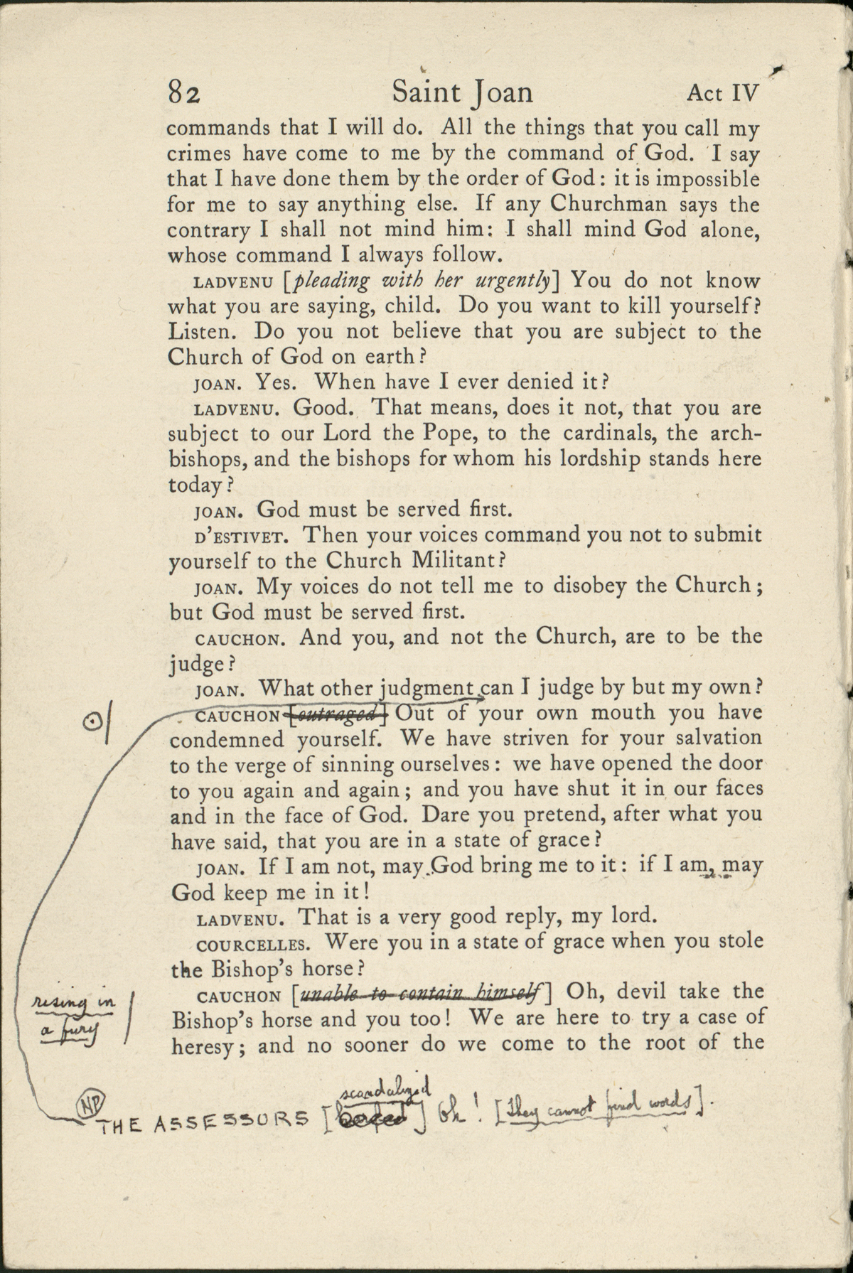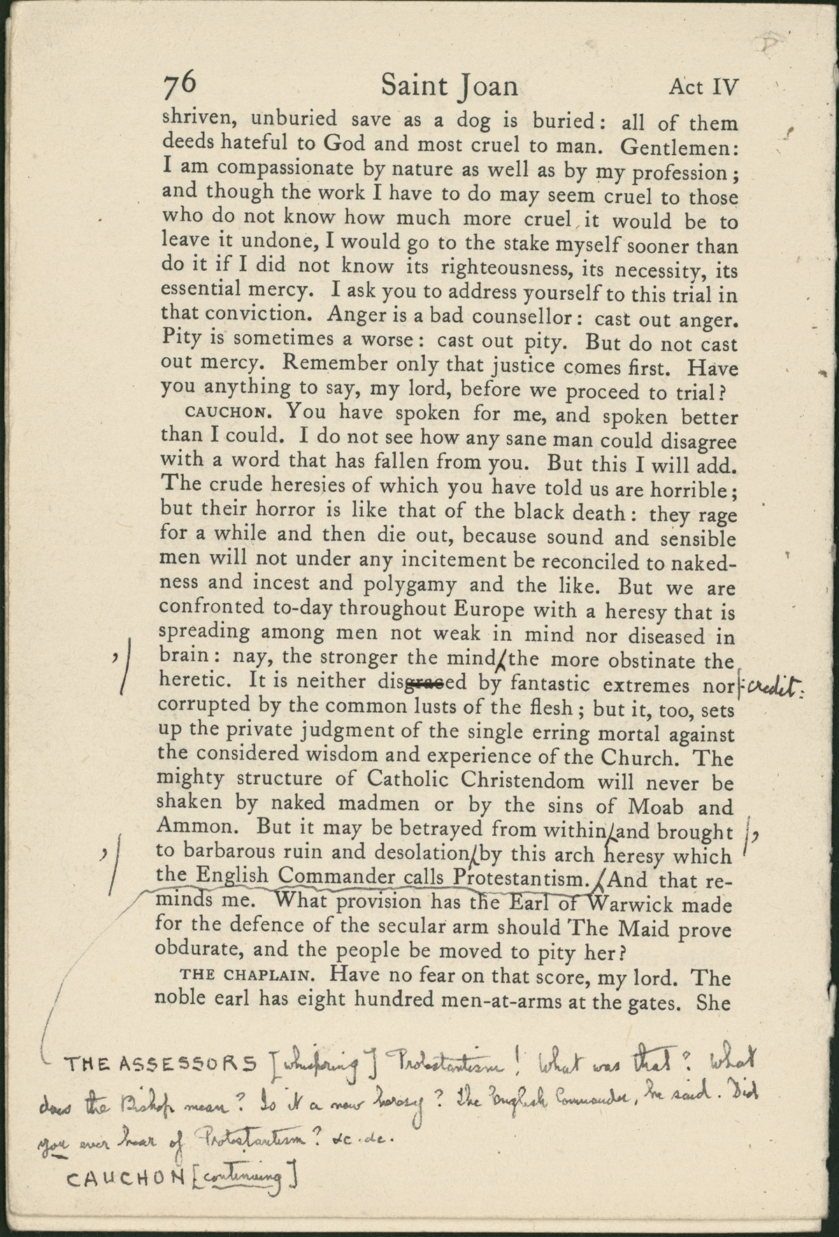 August 13, 2014, Filed Under: Books + Manuscripts, Research + Teaching, Theatre + Performing ArtsFellows Find: Scholar explores eleventh-hour additions to George Bernard Shaw’s corrected proof of play “Saint Joan” Alex Feldman, an Assistant Professor in the English Department at MacEwan University, Alberta, visited the Ransom Center to consult the papers of George Bernard Shaw, Lillian Hellman, and Arthur Miller, among others. His research, supported by the Dorot Foundation Postdoctoral Research Fellowship in Jewish Studies, focused on the dramatization of historical trials specifically those of Joan of Arc and the witches of Salem, in twentieth-century drama. The Ransom Center is celebrating the 25th anniversary of its fellowship program in 2014–2015. The Ransom Center’s cataloging card describes the volume on my desk as a “Rough Proof” of George Bernard Shaw’s play Saint Joan (1923). On the title page—the book is missing a cover—a faint pencil inscription in Shaw’s hand reads, “the old copy showing where the corrections come.” According to Brian Tyson’s account of the play’s development (The Story of Saint Joan), the revisions that appear in this copy date from Shaw’s holiday in Parknasilla, County Kerry, in September 1923, three months before the play’s New York premiere and six months prior to its first performance in London. The ink annotation below, made almost eight years later, reads, “This is an authentic ‘revise’ for the printer, or possible [sic] a copy of one made by me as a precaution against the loss of the other…” What this copy and its corrections reveal is that a collective voice of great prominence in Shaw’s trial scene was added at a very late stage in the play’s composition. Here, in Shaw’s hand, “The Assessors” make their first appearance. Sixty or so French and English clerics of assorted order and rank, the assessors fulfilled a quasi-juridical function at Joan’s trial, acting in a consultative capacity under Pierre Cauchon, Bishop of Beauvais, who presided over the proceedings, and Jean Lemaitre, vicar of the Inquisition at Rouen and Joan’s second judge. The likelihood is that, whether intimidated, coerced, or otherwise incentivized, many of the assessors could be counted on to lean, as Cauchon directed, in favor of Joan’s excommunication (and subsequent execution.) But their presence in Rouen and their substantial role in the trial did indicate a serious regard for procedural fairness. According to the trial transcripts, Cauchon, eager to present them as incorruptible, described the assessors as “ecclesiastical and learned men, experienced in canon and civil law, who wished and intended to proceed with [Joan] in all piety and meekness.” Shaw, by contrast, though he deviates from the melodramatic tradition that portrays the assessors as “malignant scoundrels,” presents them as a shrill chorus of righteously indignant imbeciles. Here’s a representative interjection, which affords some insight into the rationale behind Shaw’s eleventh-hour additions to the text. Under Cauchon’s interrogation, refusing to disavow the heavenly provenance of her “visions and revelations,” Joan declares that she will continue to be guided by God’s will. “In case the Church should bid me do anything contrary to the command I have from God,” Joan declares, “I will not consent to it, no matter what it may be.” Here, in the proof copy, the following insertion appears (see below image): THE ASSESSORS [shocked and indignant] Oh! The Church contrary to God! What do you say now? Flat heresy. This is beyond everything. The playwright isolates the objectionable detail—“The Church contrary to God!”—in case the audience has missed it, and offers it up to the spectator’s scrutiny once again, via the medium of the assessors’ protest. Here and throughout, the assessors perform a mediating function, clarifying, for Shaw’s audience, the nature of Joan’s heresy, as contemporary clerics perceived it. (See images below for further examples.) The development of this choric voice, identifying and decrying Joan’s seminal transgressions, adds weight to the anti-Joan sentiment building throughout the trial among the clergy. The assessors’ interjections are crucial to Shaw’s establishment of his protagonist’s perceived theological-legal guilt (in the identification of her heresy), but they are also instrumental in advancing Shaw’s argument that the world is always unprepared for the saints in its midst. A rabble of censorious mediocrities, these men are not evil—“there are no villains in the piece,” Shaw insisted—but they do contribute to the sense that middlebrow opinion (ever the object of Shaw’s critique) and unthinking conformity to the conventional canons of belief create insuperable obstacles to the recognition of genius. I am grateful to Jean Cannon and all of the staff at the Ransom Center for their expert guidance, to Willow White for her timely assistance, and to Sos Eltis and Peter Raby for their support of my fellowship application. Please click on thumbnails below to view larger versions. The pencil note reads “the old copy showing where the corrections come.” In ink below it: “This is an authentic ‘revise’ for the printer, or possible [sic] a copy of one made by me as a precaution against the loss of the other. I cannot account for its passing out of my hands. G. Bernard Shaw. 23/5/31” Though Shaw made these revisions in September 1923, since he had not yet begun work on the Preface, and Constable & Co. were aware that this was to be a substantial undertaking, 1924 is printed here as the prospective date of publication. “THE ASSESSORS: [whispering] Protestantism! What was that? What does the Bishop mean? Is it a new heresy? The English commander, he said. Did you ever hear of Protestantism? &c. &c.” Joan’s trial pre-dates the Reformation by almost a century, 