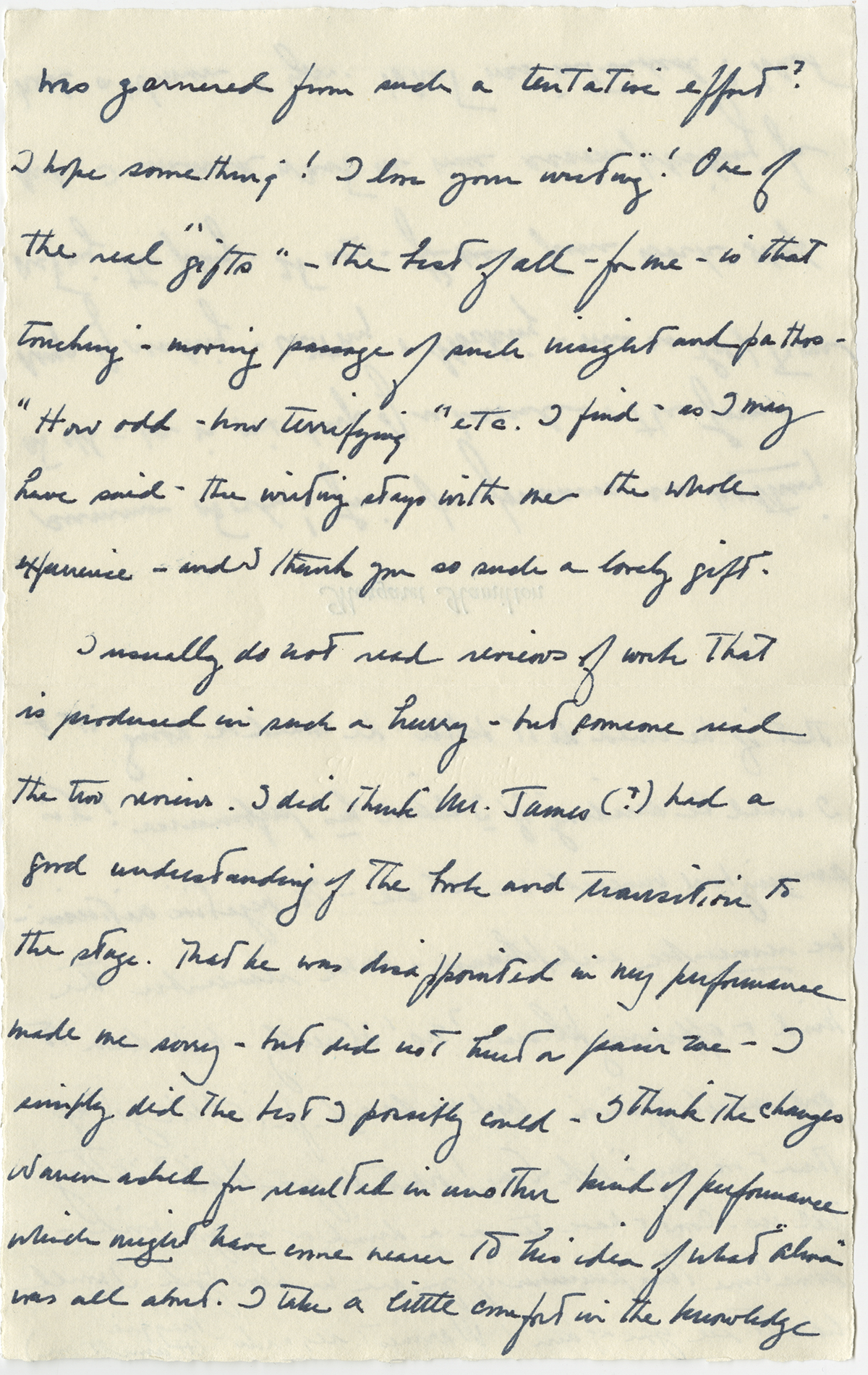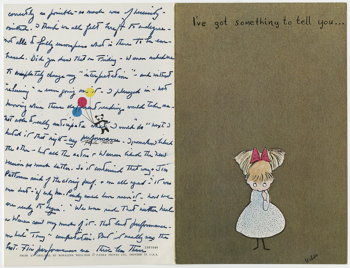 January 20, 2015, Filed Under: Books + Manuscripts, CatalogingA note from James Purdy cheers up “Wicked Witch of the West” actress Margaret Hamilton The papers of American author James Purdy (1914–2009) at the Ransom Center include a missive written to Purdy in the spring of 1971 by the actress Margaret Hamilton (1902–1985). Hamilton is, of course, best known for her role as the Wicked Witch of the West in the 1939 film version of L. Frank Baum’s The Wizard of Oz. The communication fills three pages of a whimsical Rosalind Welcher greeting card and continues onto both sides of a sheet of the actress’s personalized note stationery. From internal evidence in Hamilton’s letter, as well as from an earlier one in the collection from playwright Neal Du Brock to Purdy, it’s evident she had starred in Du Brock’s dramatization of Purdy’s novel The Nephew. The production was presented by the Studio Arena Theatre in Buffalo, New York in early 1971. Du Brock’s adaptation wasn’t particularly well received and closed with considerable gloom among the play’s company. Purdy evidently wrote a consoling note to Du Brock, which led Du Brock to suggest that Miss Hamilton, who had clearly felt stung by the reviews, might be cheered by a positive word from the original author. Purdy’s ensuing note to Hamilton seemingly helped lift the actress’s spirits, and she responded in her letter of April 23, 1971, “how very dear of you to write me…and perk up such a dismal Easter.” She went on to say she was then in Boston at her alma mater, Wheelock College, recovering from the flu and looking forward, upon her recovery, to appearing in a play with the school’s drama department. After recounting the hectic events surrounding the production of The Nephew and its treatment in the press, the scarcely wicked witch continued with the observation that “it is amazing how vulnerable we all are—to negative criticism—we remember each phrase—do we remember the kind or approving phrases? No! It really boils down to one man’s opinion. And we do ask for it!” Hamilton closed with an invitation to Purdy to “come & have tea or a drink… sometime this summer if you are in New York.” The James Purdy papers are currently being processed and will be available to scholars once cataloging is complete. Please click on thumbnails below to view larger images. Letter from Margaret Hamilton to James Purdy, dated April 23, 1971. Letter from Margaret Hamilton to James Purdy, dated April 23, 1971. Letter from Margaret Hamilton to James Purdy, dated April 23, 1971. Letter from Margaret Hamilton to James Purdy, dated April 23, 1971. Letter from Margaret Hamilton to James Purdy, dated April 23, 1971.