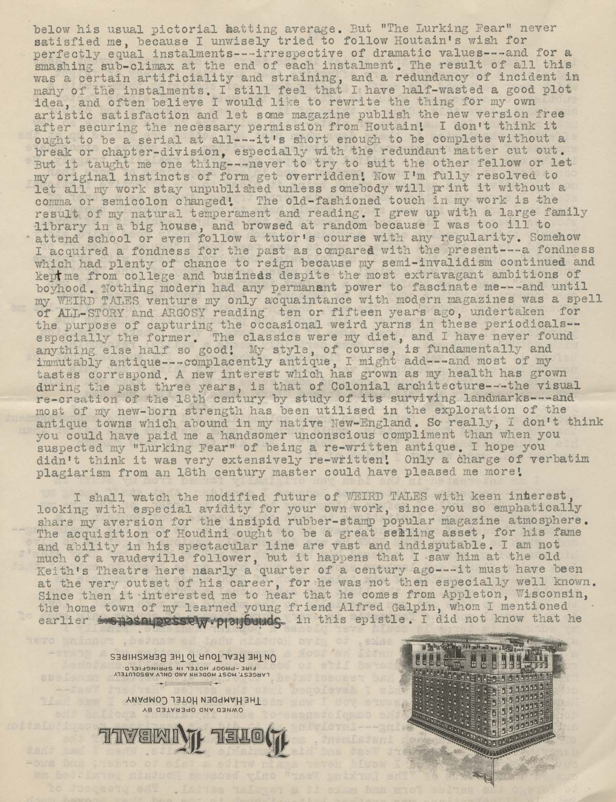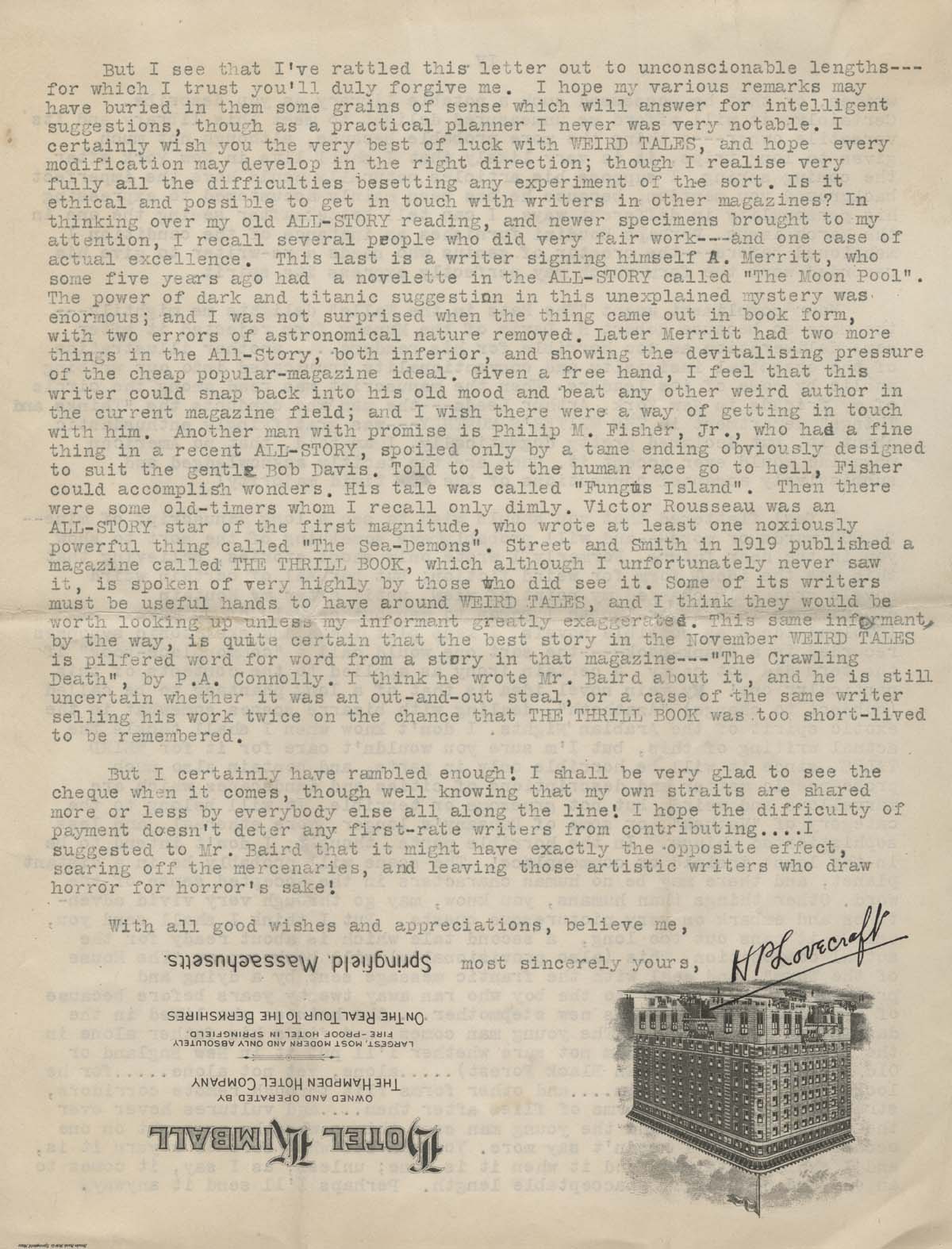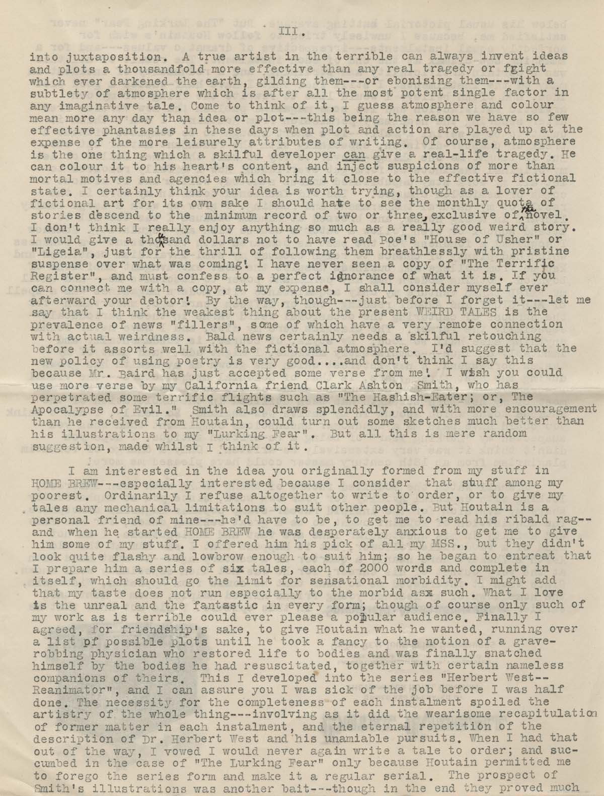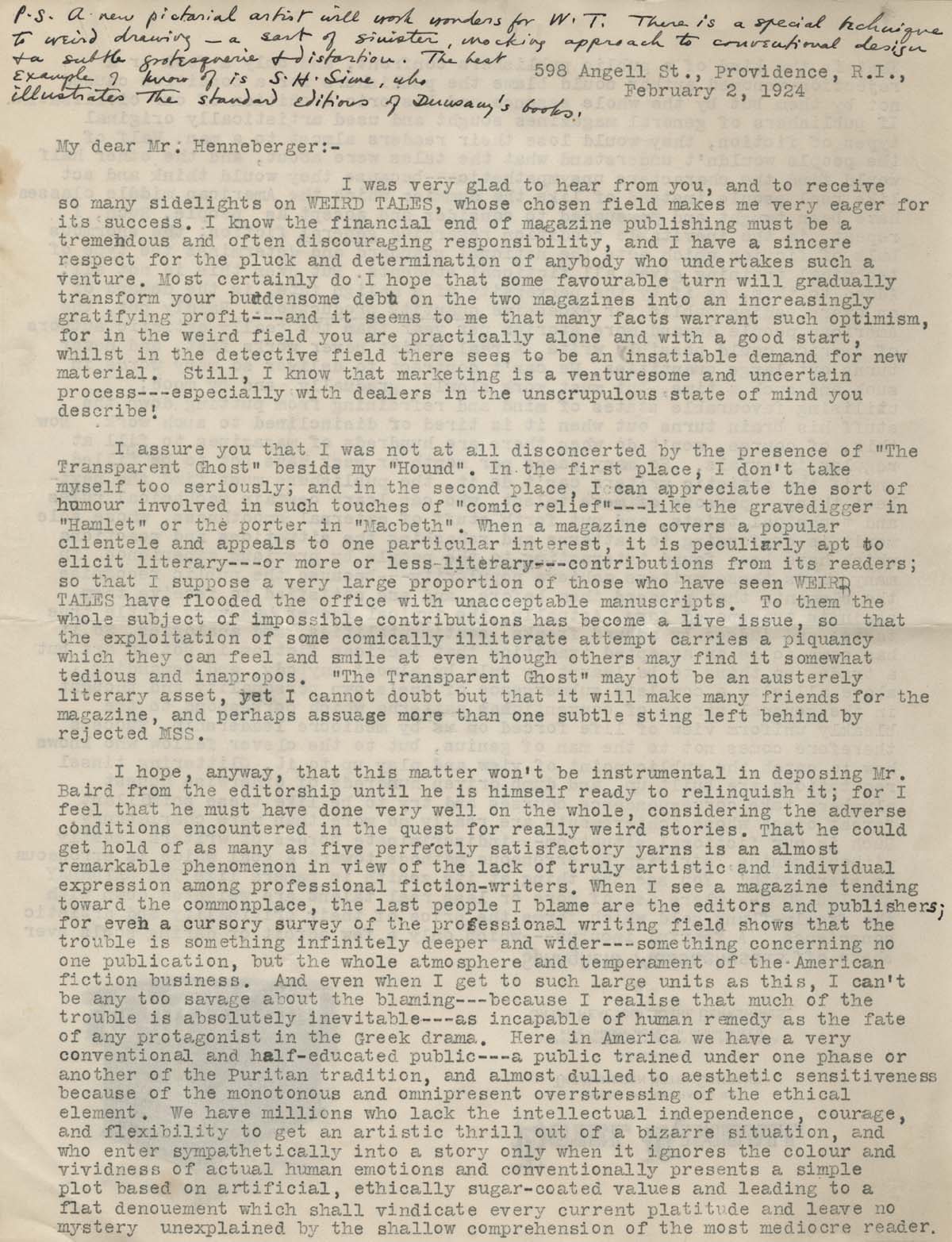 January 27, 2015, Filed Under: Books + Manuscripts, Research + TeachingFellows Find: H. P. Lovecraft letter sheds light on pivotal moment in his career James Machin is a PhD student at Birkbeck, University of London, working on a thesis on early weird fiction, circa 1880 to 1914. He is also the editor of Faunus, the journal of the Friends of Arthur Machen. His research at the Ransom Center was funded by a dissertation fellowship supported by the Creekmore and Adele Fath Charitable Foundation and The University of Texas at Austin Office of Graduate Studies. One of the joys of archival research in the Ransom Center is wandering off-track to follow hunches or simply indulge one’s curiosity. The subject of my thesis is early weird fiction, and while the bulk of my time at the Center was spent investigating material from the 1890s relating to Arthur Machen, M. P. Shiel, and John Buchan, I couldn’t resist looking up H. P. Lovecraft in the old card catalogue. I found a single item listed on one index card: a letter from Lovecraft to J. C. Henneberger. The name was a familiar one: Henneberger was the publisher who established Weird Tales magazine in the 1920s, the pulp title that is remembered today for publishing several of H. P. Lovecraft’s most influential stories. The letter was several pages of closely packed typescript sent from 598 Angell Street, Providence, Rhode Island—the house the family had moved to in 1904 after the death of Lovecraft’s grandfather—and dated February 2, 1924. The year was to be a significant one for Lovecraft: he was about to uproot himself from his home of 20 years to join his soon-to-be wife Sonia Haft Greene in Brooklyn. Lovecraft struggled to find work, the marriage failed, and some have identified this episode as being the point from which many of his subsequent troubles and frustrations ensued. A common lament is that it all could have been so different: soon after the letter was written, Henneberger offered Lovecraft the editorship of the Chicago-based Weird Tales. If Lovecraft had properly seized this opportunity with both hands, the story goes, he would have established himself as the man of letters he was born to be, and avoided languishing in obscurity and poverty for the rest of his life. Lovecraft scholar and biographer S. T. Joshi has identified some reasons why Lovecraft made the decision that he did: Greene was already established in New York, Lovecraft knew that Weird Tales was already financially hamstrung by a debt of tens of thousands of dollars, and—perhaps most importantly—Lovecraft didn’t think there were enough writers producing weird fiction of a sufficiently high quality to populate the pages of the magazine. There is plenty in the letter of February 2 to further evidence Joshi’s account. It also reveals that Lovecraft’s concerns go considerably beyond his lack of confidence in the availability of suitable material, and beyond even his lack of faith in the tastes of the wider reading public. They even go beyond his negative opinion of the “whole atmosphere and temperament of the American fiction business.” For Lovecraft, the problem was contemporary culture itself: We have millions who lack the intellectual independence, courage, and flexibility to get an artistic thrill out of a bizarre situation, and who enter sympathetically into a story only when it ignores the colour and vividness of actual human emotions and conventionally presents a simple plot based on artificial, ethically sugar-coated values and leading to a flat denouement which shall vindicate every current platitude and leave no mystery unexplained by the shallow comprehension of the most mediocre reader. That is the kind of public publishers confront, and only a fool or a rejection-venomed author could blame the publishers for a condition caused not by them but by the whole essence and historic tradition of our civilisation. Lovecraft’s frustration with the bland timidity of the mainstream could hardly be expressed in more forthright, if perhaps histrionic, terms. Elsewhere in the letter (which is over 5,000 words long—Lovecraft was one of the most prolific and prolix correspondents of his age), Lovecraft expands on his projected novels Azathoth and The House of the Worm, neither of which were ever to materialize. He ruminates at length about what makes good weird fiction, and is generous and enthusiastic in his recommendations of authors he considers would be an asset to Weird Tales. He also outlines what he regards as the only feasible plan by which Weird Tales could perhaps successfully operate: the engagement of a small pool of appropriately gifted ghost-writers that would enable an editor to accept submissions not of publishable quality but demonstrating the required spark of originality. It’s difficult not to speculate that had Lovecraft accepted the editorship, this pool of writers would have inevitably included members of that ‘Lovecraft Circle’ who are now considered some of the definitive genre writers of the period: Clark Ashton Smith, Robert E. Howard, and Robert Bloch. Alas, it was never to be. Or rather, perhaps not “alas”: Despite its shaky financial beginnings and ongoing precariousness, Weird Tales has survived on and off to this day. Who’s to say that Lovecraft’s determinedly purist and non-commercial editorial policy wouldn’t have sunk the title in double-quick time? Maybe his desk-duties would have hampered his creative productivity even further than his belief that a “real artist never works fast, and never turns out large quantities”: He can’t contract to deliver so many words in such and such a time, but must work slowly, gradually, and by mood; utilising favourable states of mind and refraining from putting down the stuff his brain turns out when it is tired or disinclined to such work. Counterfactual speculation is both difficult not to indulge in and largely unrewarding. Perhaps those of us who celeb