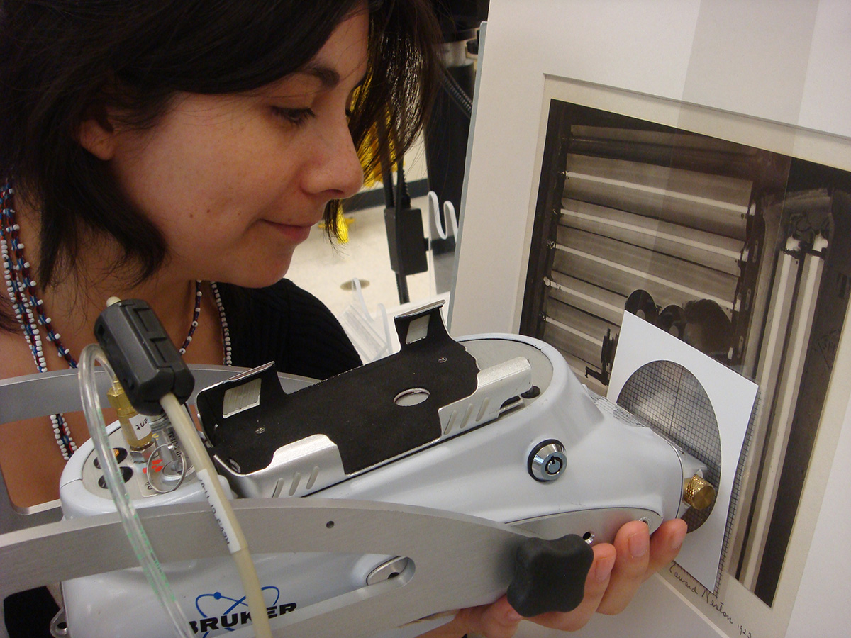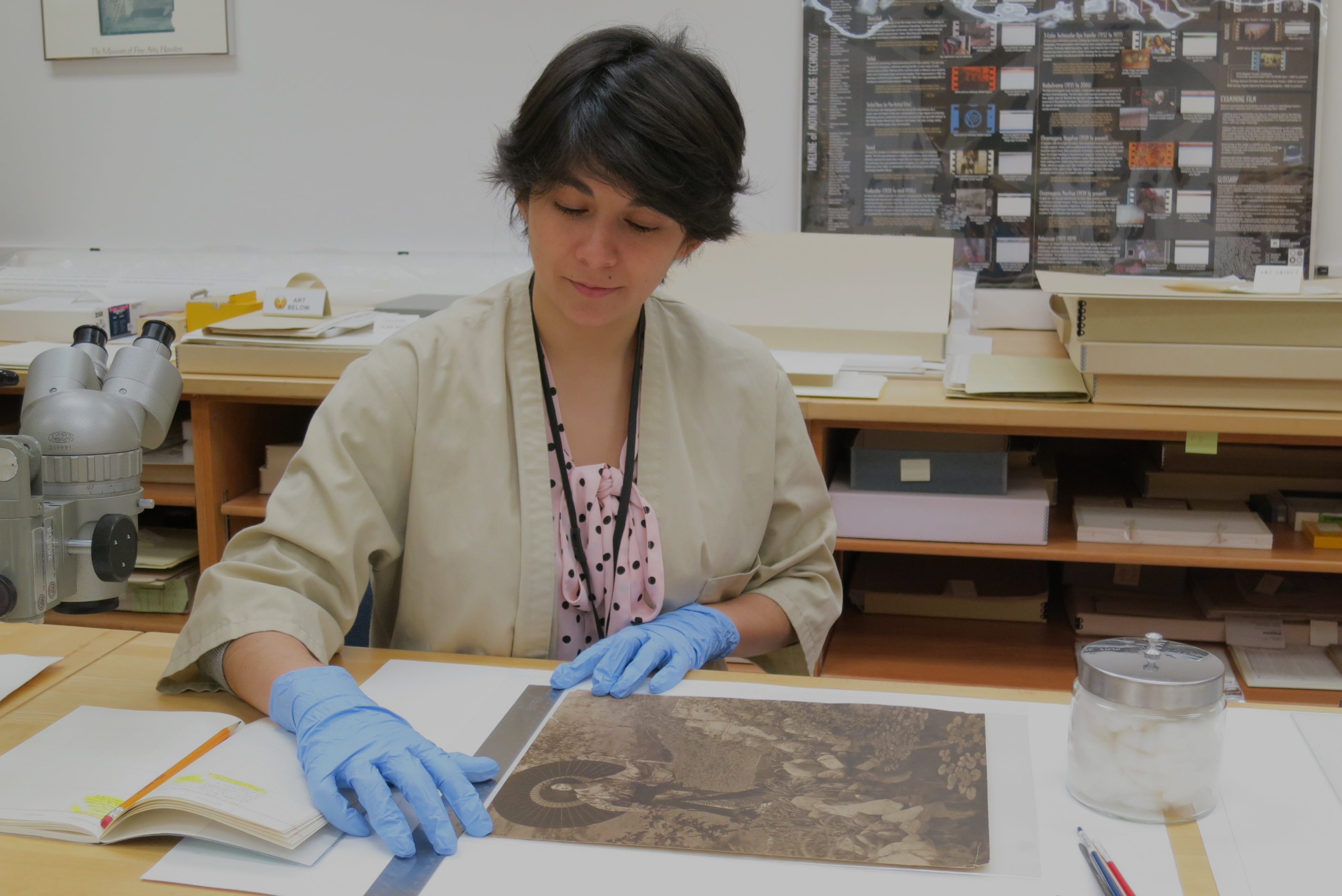 February 11, 2015, Filed Under: Conservation, Meet the Staff, PhotographyMeet the Staff: Diana Diaz Cañas, Photograph Conservator Meet the Staff is a Q&A series on Cultural Compass that highlights the work, experience, and lives of staff at the Harry Ransom Center. Diana has a Bachelor of Arts in Conservation from Bogotá, Colombia and she specialized in Photograph conservation in Mexico City, Mexico. She has worked in private workshops and labs and came to the Ransom Center following her work at the Frida Kahlo Museum and the National School for Conservation (ENCRyM) both in Mexico City. Diaz works on a treatment in the photography conservation lab at the Ransom Center. Photo by Jane Boyd and Barbara Brown. What do you like best about your job? I like the fact that we can actually touch the objects and handle them carefully but with confidence. Usually when you go to a museum, you are not allowed to touch anything, you are only allowed to see and be very careful. In conservation, while performing a treatment, it is usually necessary to handle the objects to take care of them. This allow us to better understand the materiality of the object. What is your favorite item that has come through your office? I was very lucky when I first arrived because the “First Photograph” was coming back from an exhibition in Germany. The case needed some maintenance after the exhibition, so it was brought to us at the Photograph Conservation Lab, and I had the chance to view the photograph outside of its case and look at it closely to check its condition. It was amazing. What was your most challenging project? In Mexico City, I worked on a huge collage with photographs from the end of the nineteenth century. It was a commemoration of Mexico’s independence, with portraits of independence heroes as well as politicians and diplomats of the time. It measures approximately 8 x 10 feet and has more than 700 photographs. It had several structural problems that needed attention and became very complicated due to the size and the mixture of materials in the collage, and it was a lot of work to treat each photograph, one by one. Here at the Ransom Center, I worked on very tightly rolled panoramas that needed to be flattened for the World War I exhibition. The work was delicate and complicated, especially because the paper was brittle and had some tears that needed mending. What is the most useful tool in your profession? For everyday use, the microscope and the spatula are the most helpful tools for identification and treatment of photographs. Equipment used to perform scientific analysis is also very useful and helps us to better understand the chemical composition of the objects and works of art we work with. It is very important for us to first identify the photographic technique of every print or negative that comes to the lab before performing any treatment, as this determines how fragile a photograph might be. For example, some photographs are more sensitive to light, while others are more sensitive to handling. Identifying photographic techniques also allows us to choose appropriate conservation treatments. Does your Spanish proficiency aid you in your work? Sometimes, especially because of Texas’s strong connection with Latin American culture. Many archives are from native Spanish speakers, and others have Spanish inscriptions. My language skills help me understand some details about the objects, and are sometimes helpful when interacting with patrons interested in the Ransom Center’s collections. What drew you to photo conservation? My father, who was a photographer and filmmaker, first influenced me. I used to see him filming and taking pictures, and then I played with his cameras. When I started in conservation, I liked working with paper, so my first job was as a paper conservator in an archive where photographs started to be more and more common. I was asked to survey a new collection that had an important number of photographic materials, and at that moment I realized I did not really know how to talk about the materiality of photographs or their decay with time. I realized that I didn’t know much, but I wanted to. That curiosity and my father’s influence were what helped me decide to work in this field. You worked in the Frida Kahlo Museum in Mexico City. What did you like most about working there? It was great to learn about her as an artist, but also as a person by seeing her pictures. Her father was a renowned photographer, so there is a large collection of family photographs, together with images of her in bed after one of several operations, with an apparatus installed in the bed that held a canvas and allowed her to paint while recovering. Others show the work in progress of some of her most important paintings. There are also photographs with or from other artists and friends of Frida such as Nickolas Muray and Diego Rivera. These pictures show an intimate part of her life that nobody had seen before and have an incredible value for researchers and scholars. When Frida died, Diego locked up her personal effects and other belongings, including unfinished paintings, in bathrooms at the Blue House that had been converted into storerooms. Diego entrusted the archive to his friend Dolores Olmedo, with the instruction to keep it locked until 15 years after his death, but Dolores decided to keep it locked until after her own death. So 50 years passed before the storage rooms were opened and the museum was able to process Frida’s personal archive and establish conservation needs and exhibitions. I feel very fortunate to have contributed to the preservation of her archive. There’s a Frida Kahlo portrait at the Ransom Center. It’s remarkable that we have it here. The painting is one of her most important pieces. Actually, I had the chance to courier it back to the Ransom Center. It was featured in an exhibition that highlighted surreal artists, and I had the chance to return it to t
