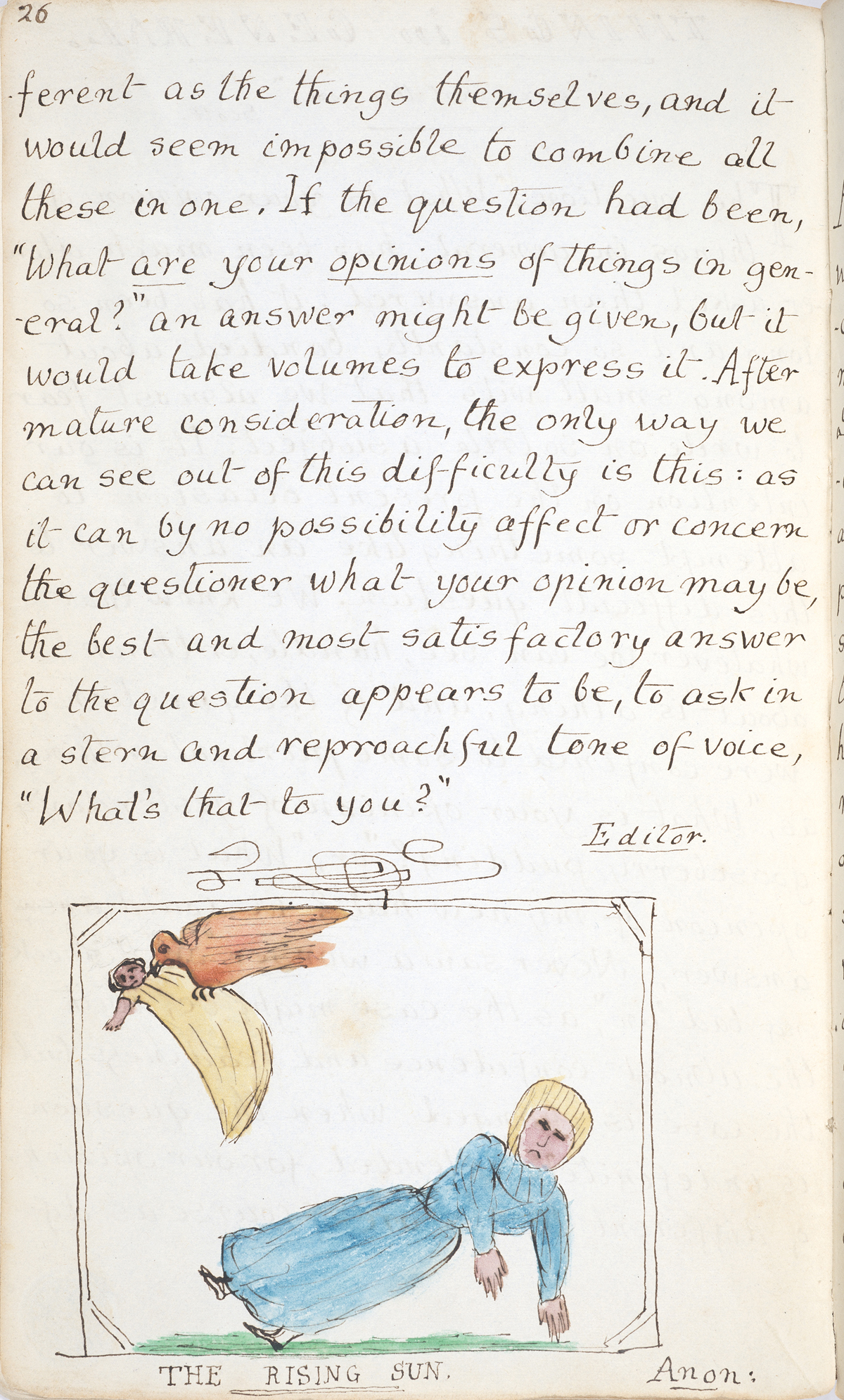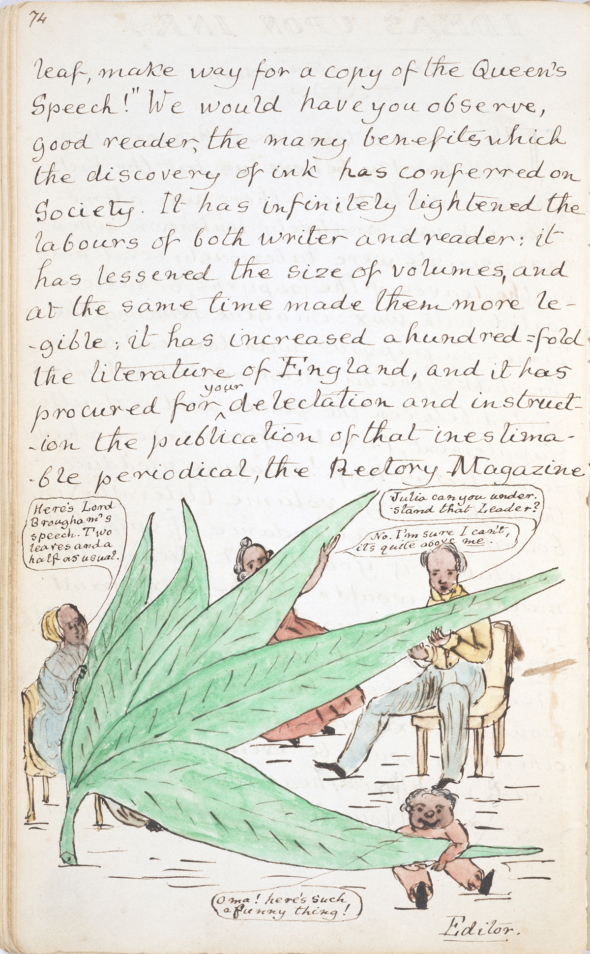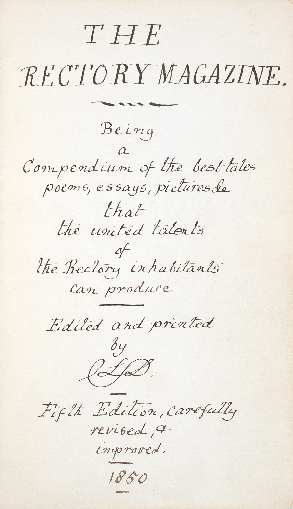 February 13, 2015, Filed Under: Books + Manuscripts, Exhibitions + EventsIn the Galleries: “The Rectory Magazine” The man who became famous as Lewis Carroll was born Charles Lutwidge Dodgson in 1832. Dodgson, the third of 11 siblings, grew up in northern England surrounded by his brothers and sisters. Together they put on plays and created family publications like The Rectory Magazine, named for their home in Croft-on-Tees. Dodgson’s father was an Archdeacon in the Church of England and lived in a rectory, or a residence for the parish clergyman. This edition of The Rectory Magazine includes essays, poems, and short stories, as well as hand-drawn and colored illustrations. The sense of humor and parody that appear in much of Carroll’s later work is already evident in The Rectory Magazine, produced when Dodgson was 18 years old. Visitors to the Ransom Center’s exhibition Alice’s Adventures in Wonderland, on view through July 6, can turn the pages of a digital version of The Rectory Magazine on a touchscreen in the galleries. Please click on the below thumbnails to view larger images. Title page of Charles Dodgson’s [Lewis Carroll], “The Rectory Magazine,” produced by Dodgson and his siblings in 1850. Illustrations from Charles Dodgson’s [Lewis Carroll], “The Rectory Magazine,” produced by Dodgson and his siblings in 1850. Illustrations from Charles Dodgson’s [Lewis Carroll], “The Rectory Magazine,” produced by Dodgson and his siblings in 1850. Illustrations from Charles Dodgson’s [Lewis Carroll], “The Rectory Magazine,” produced by Dodgson and his siblings in 1850.