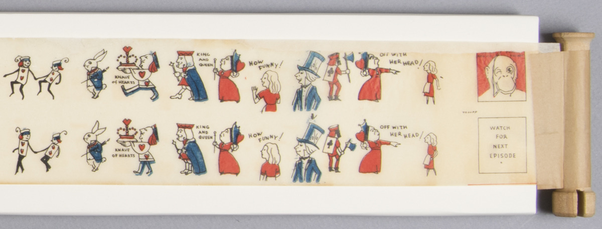 April 12, 2015, Filed Under: Art, Books + Manuscripts, ConservationBefore and After: “Alice’s Adventures in Wonderland” Movie Jecktors The exhibition Alice’s Adventures in Wonderland features two 1933 toy paper film strips called Movie Jecktors. The film strips portray two of the most memorable parts of the Alice story: “Down the Rabbit Hole” and “The Mad Hatter.” Images and text are printed in three colors on 35″ strips of translucent paper. The strips are rolled onto wooden dowels and stored in colorfully printed little boxes. The Movie Jecktors would have been used with a toy film projector to create a simple animation. The Ransom Center’s Movie Jecktors required conservation before they could be safely displayed in the galleries. Both the wooden dowel and the storage box, which is made of wood pulp cardboard, had a high acid content. An acidic environment is harmful to paper. The Movie Jecktors had become brittle and discolored, and there were many tears and losses to the paper. The film strips had been repaired in the past with pressure-sensitive tapes (the common tape we all use to wrap gifts). These tapes are never appropriate for repairing paper that we hope to preserve because they deteriorate and often darken over time and are also difficult to remove once in place. As the Ransom Center’s paper conservator, I removed the tapes using a heated tool and reduced the residual adhesive using a crepe eraser. I mended the tears and filled the losses using Japanese paper and wheat starch paste. For the fills, the Japanese paper was pre-toned with acrylic paint to allow these additions to blend with the original paper. Areas of ink loss were not recreated. Visitors to the exhibition can see the areas of the filmstrips that were damaged, but those areas are now stabilized and less distracting. This kind of treatment reflects the practice of conservation to preserve, but not “restore,” the object’s original appearance. Libraries, archives, and museums today often choose the conservation approach because it allows researchers and other visitors a better understanding of the object’s history, including damages that occurred, which may speak to the materials used in the object’s creation. Related content: Meet the Staff: Heather Hamilton, Head of Paper Conservation Remarkable set of miniature Masonic theater scenery receives conservation treatment World War I Red Cross poster undergoes conservation treatment for exhibition Receive the Harry Ransom Center’s latest news and information with eNews, a monthly email. Subscribe today. Please click on thumbnails to enlarge images. “Alice and the Mad Hatter,” Movie-Jecktor paper film strip, Dandy Films, 1933. Prior to treatment by the Ransom Center’s conservation lab. “Alice and the Mad Hatter,” Movie-Jecktor paper film strip, Dandy Films, 1933. Treated by the Ransom Center’s conservation lab.