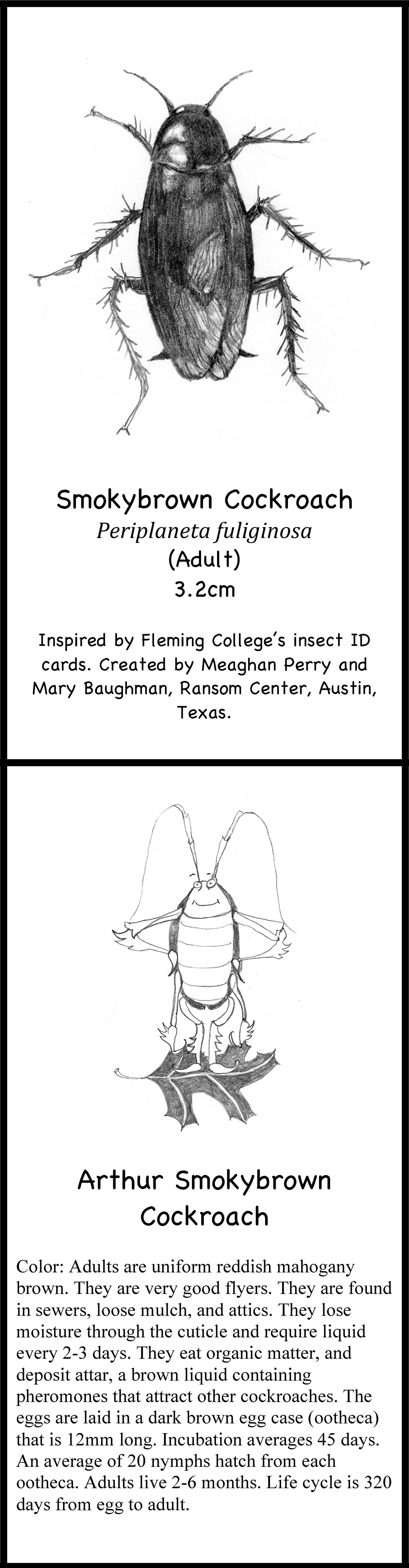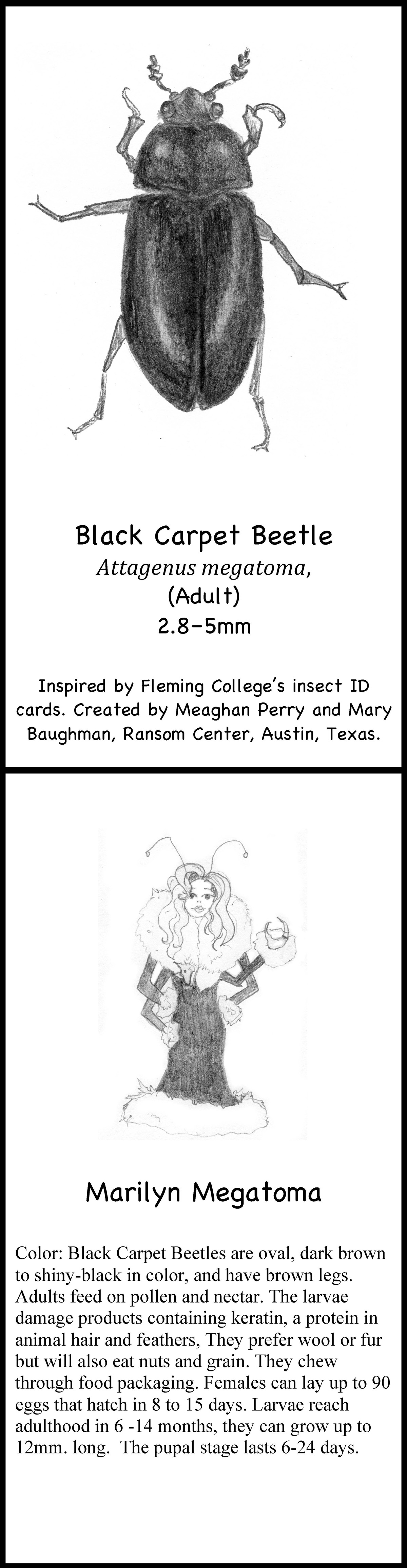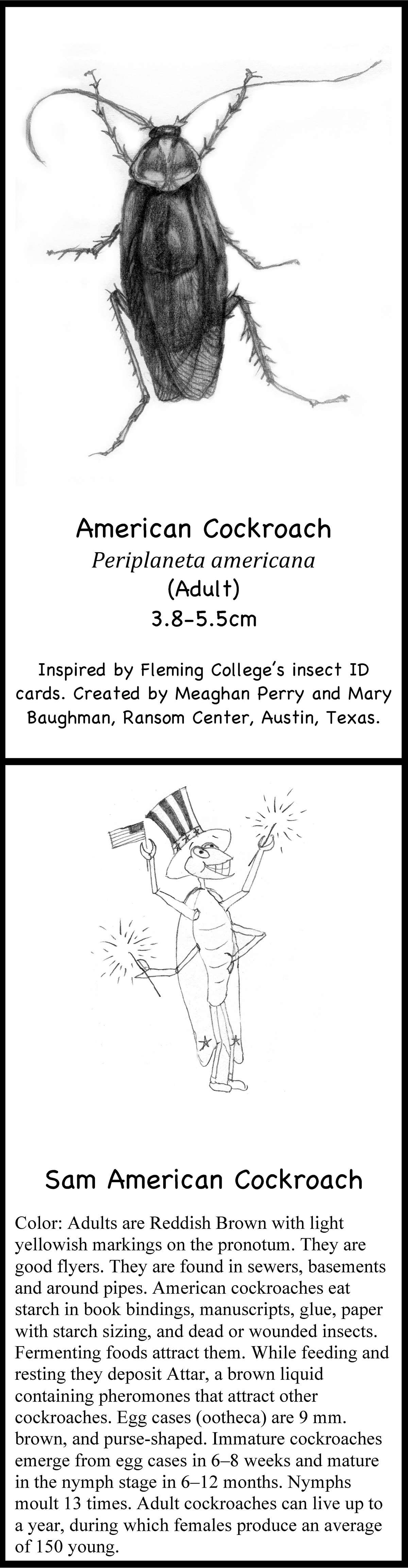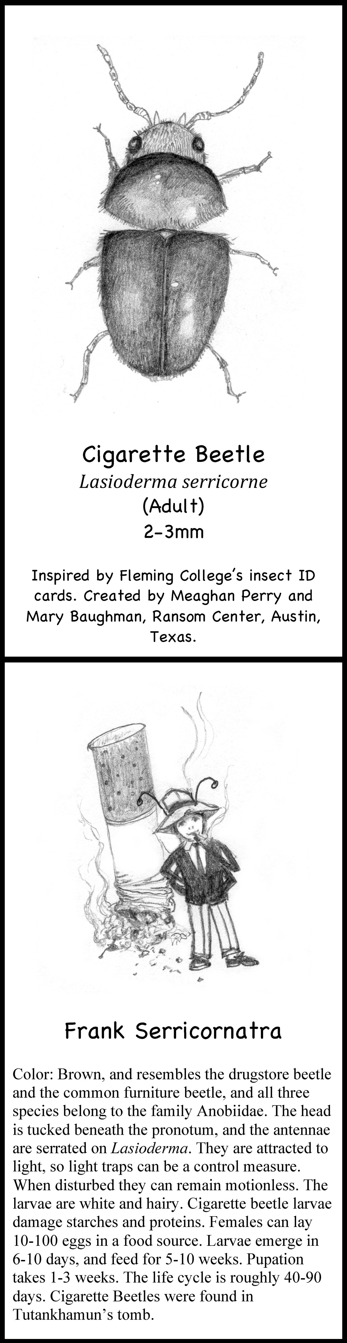 April 28, 2015, Filed Under: ConservationTexas insect ID flashcards go global When boxes of collection materials arrive at the Ransom Center, conservators and archivists gather at the tables in the quarantine room in the basement to inspect the contents, looking for insects and the telltale signs of them—as well as for mold, another great enemy of archives. Leading the effort is Ransom Center Book Conservator Mary Baughman, who trains personnel to recognize signs of insect infestation. Below, Mary shares a recent department undertaking that may humanize the insects but will also make them more recognizable during inspections. Upon the arrival of collection materials at the Ransom Center, the first order of business is for staff to inspect the collection carefully—under the diligent leadership of one of our conservators—for signs of insects or mold, or any other damage that could jeopardize our collections. These inspections are important affairs, for it’s critical that we not introduce pests or mold into our stacks. In looking for instructional materials to educate and identify insects, I turned to MuseumPests.net, a comprehensive international resource for collection managers. Every institution has insect challenges of some sort. In fact, MuseumPests.net is the result of the efforts of the Integrated Pest Management Working Group, a group of collection managers, conservators, entomologists, and other professionals interested in issues surrounding the implementation of integrated pest management in museums and other collection-holding institutions. While exploring the MuseumPests.net website, I located a set of amusing and informative insect identification flashcards created by students of Sir Sanford Fleming College’s Museum Management and Curatorship Program in Peterborough, Ontario, Canada. Inspired, conservation department volunteer Meaghan Perry and I decided Texas should have its own flashcards depicting insects in the state that attack collection materials. I penned the text, and Meaghan created the images; MuseumPests.net entomologists vetted both. Identifying and understanding these insects is the first step in preserving our collections. We’re pleased to depict these Texas insects during Preservation Week. The flashcards can be downloaded from and MuseumPests.net. Receive the Harry Ransom Center’s latest news and information with eNews, a monthly email. Subscribe today. Click on thumbnails to view larger images.