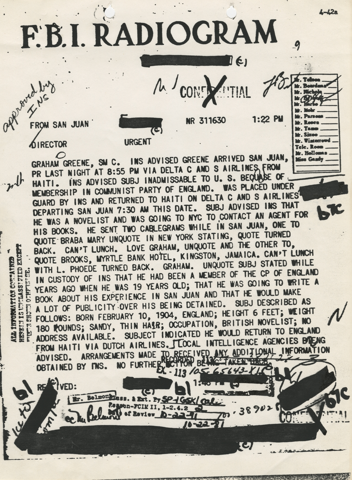 July 9, 2015, Filed Under: Authors, Books + Manuscripts, Research + TeachingFellows Find: Authors find important insights in Graham Greene material Dr. Jon Wise, an independent researcher and writer, visited the Harry Ransom Center in October 2014 to research the Graham Greene collection with Mike Hill, a retired school teacher and current editor of A Sort of Newsletter, the quarterly journal of the Graham Greene Birthplace Trust. Wise and Hill previously co-authored The Works of Graham Greene: A Reader’s Bibliography and Guide in 2012. Upon the successful reception of that book, the two decided to produce a companion volume that covered Graham Greene’s original writings in manuscript form together with his unpublished work. Their research was supported by the Andrew W. Mellon Foundation Research Fellowship as part of the Ransom Center’s 2014–2015 fellowship program. During our first visit to the Harry Ransom Center in 2014, Mike Hill and I worked through the existing Graham Greene collection. We were aware that since this collection was last cataloged there had been several important additions that would require a second visit. What we were unaware of, and what made our return visit doubly rewarding, was the existence of three large boxes of extra material, mainly correspondence, which had been acquired by the Center even more recently. Prior to arrival we had been particularly interested to read Greene’s correspondence with the journalist Bernard Diederich and also with Dr. Michel Lechat. Both men, in different ways, helped Greene to achieve the authenticity for which his writing is renowned and also became personal friends. Diederich had an intimate knowledge of Central America and parts of South America. Greene’s exposé of Papa Doc Duvalier’s dictatorship in Haiti in his novel The Comedians together with Diederich’s investigative journalism helped bring to the attention of the world the true horrors of the regime. Later, Diederich introduced Greene to General Omar Torrijos of Panama. This resulted in the writer visiting the small country on a number of occasions and writing a memoir of the president. There are nearly 140 letters in this collection that date from 1965 to 1990. Although some are copies of correspondence to be found in the Greene collections at Boston College, the Ransom Center’s collection is particularly revealing about their campaign against the Duvalier dictatorship and Greene’s close involvement with Central American politics, which lasted throughout the 1980s. Michel Lechat first became acquainted with Graham Greene when the writer visited his leprosy settlement in Yonda in 1959, in what was then the Belgian Congo. Greene stayed with the doctor and his family during the time he spent researching the setting for what became his 1961 work A Burnt-Out Case. Greene relied on Lechat’s intimate knowledge as a leprologist to provide details of this little-understood disease that is so much a part of the stark and uncomfortable reality that underpins the novel. Photo of Graham Greene. The material in the Ransom Center comes from Lechat’s personal files, and much of Greene’s writing is annotated by him with cover sheets, evidently written in 2007. Half the files consist of materials relating to A Burnt-Out Case and Greene’s Congo Journal and half comprises correspondence between the two men. Prior to publication, the writer sent drafts of the novels to Lechat, and the doctor responded with detailed notes and, in some cases, corrected factual errors in the narrative. He was also deeply critical of some of Greene’s more outspoken comments about individuals who the writer encountered during his stay at Yonda, and these were subsequently deleted from Congo Journal at Lechat’s behest. The 78 letters from Greene are the originals kept by Lechat and date from 1958 to 1988. This is a much fuller collection than at Boston College, which has notable gaps in the sequence of correspondence. The three uncatalogued boxes referred to above contain some fascinating documents including filmscripts, an abandoned story, a copy of Greene’s U.S. National Security file obtained under the Freedom of Information Act, and a good deal of hitherto unknown correspondence. His letters, among other matters, include his thoughts on encountering the Italian priest Padre Pio, who was thought to bear the Stigmata, and an affectionate and nostalgic sequence of communications with his boyhood friend, the poet Peter Quennell, which includes rare references to Greene’s father. Finally, there is a series of letters some 30 in number, spanning the years 1938 to 1969, from Greene to Ben Huebsch and later Harold Guinzberg of Viking Press, his American publishers. This correspondence provides fresh insights into the writer’s many preoccupations during the middle period of his career. One can also chart Greene’s relationship with Viking Press from his initial enthusiasm over the Viking edition of his novel Brighton Rock to his eventual disillusionment concerning the treatment of his picaresque work Travels with My Aunt. Hill and Wise’s upcoming book on Graham Greene will be published in September 2015. Related content: Read more posts in our Fellows Find series. Receive the Harry Ransom Center’s latest news and information with eNews, a monthly email. Subscribe today. Photo of Graham Greene. U.S. Government (FBI) Files on Graham Greene.