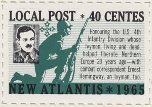 July 30, 2015, Filed Under: Authors, Research + TeachingThrowback Thursday—Contents of a country: Leicester Hemingway’s Republic of New Atlantis This month 51 years ago, the younger brother of Ernest Hemingway staked a claim to a small piece of land off the Jamaican coast, creating a new currency, flag and government for the fledgling nation of New Atlantis, many artifacts of which are now held at the Ransom Center. This post originally appeared in our July 2007 edition of the Ransom Center’s eNews. Leicester (pronounced “Lester”) Hemingway is known to history principally for three things: For being the younger brother of the famous novelist Ernest Hemingway, to whom he bore a striking physical resemblance; for publishing a well-received biography of his brother a mere eight months after Ernest died; and for “founding” his own island nation, the Republic of New Atlantis. Artifacts related to each of these contributions have found their way to the Harry Ransom Center. National flag of the Republic of New Atlantis. New Atlantis collection. New Atlantis Title page for the constitution of the Republic of New Atlantis. New Atlantis collection. VIEW enlarged image of whole document. “There’s no law that says you can’t start your own country,” Leicester told the Washington Post in 1964. He was referring to the island nation of New Atlantis, which he founded on July 4 by anchoring an 8 x 30-foot bamboo raft to an old Ford engine block in 50 feet of water eight miles southwest of Jamaica. The site lay on a shallow ocean bank in international waters, beyond the then-customary three-mile limit of Jamaica’s territorial sea, in an area where the sea floor normally runs to a depth of 1,000 feet. Leicester soon informed the press that he had taken possession of half the “island” on behalf of the United States government under the authority of the obscure U.S. Guano Islands Act of 1856. Guano (bird excrement) was a valuable commercial fertilizer in the nineteenth century and there was something of a gold rush among Western nations to claim unoccupied areas having guano deposits during the middle part of that century. The Guano Islands Act of 1856 opened the game to U.S. citizens by authorizing them to take possession, on behalf of the U.S. government, of any unoccupied “island, rock or key” on which a guano deposit was found. The Guano Islands Act has never been repealed, rendering it theoretically available to 20th-century adventurers like Leicester Hemingway. Several U.S. territories—including Midway Island in the Northern Pacific—were originally occupied under the Guano Islands Act. Hemingway lay claim to the “unoccupied” half of his new island on behalf of the United States. He reserved the remaining half for the aspiring nation of New Atlantis. Currency from New Atlantis. Official exemplars. New Atlantis collection. In February 1965, the Republic’s seven voters—all chosen by the island’s founder—made Leicester their first president. The formal election of the republic’s first government incited another round of press notices, including a six-column front-page headline in the leading Kingston, Jamaica, newspaper. Leicester solemnly told the paper that his new Republic “would be a peaceful power and would not threaten” its Caribbean neighbors. New Atlantis stamp from 1965 for 6 Centes, honoring the provisional government of the Dominican Republic. New Atlantis collection. New Atlantis adopted a national flag, sewn by Leicester’s spouse, and christened its national currency the “scruple.” It seems Leicester believed the rich should have many scruples. Official exemplars of the national currency look suspiciously like things that might have washed ashore on a Caribbean beach in 1964. The Ransom Center appears to have the only “original” draft of the New Atlantis Constitution, for which there may exist no copies. It is typed on a manual typewriter and reads like a near-exact duplicate of the seven articles forming the main body of the United States Constitution. The main activity of Leicester’s new country was the issuing of postage stamps. In 1964 and 1965 New Atlantis issued—or perhaps it is more accurate to say “printed” — stamps in five different denominations. Leicester told several reporters that he intended to finance the International Marine Research Society with the proceeds of the stamp operation, but the revenue plan ran aground when the Swiss-based Universal Postal Union refused to recognize the legitimacy of either the stamps or their issuer. The 1964 New Atlantis stamp honoring Lyndon Johnson, “protector of the entire free world,” merited a thank-you note from the White House but did not help New Atlantis secure diplomatic recognition. New Atlantis stamp from 1964 for 100 Centes, honoring Lyndon Johnson, “Protector of the entire free world.” New Atlantis collection. New Atlantis went out with a whimper when it disappeared in a storm several years after its founding, but not before it came to the attention of Mary M. Hirth, a librarian for what was then called the University of Texas Humanities Research Center. In October of 1965, the Center mounted a small exhibition of New Atlantis artifacts provided by Leicester, who visited Austin to view the exhibition. Many of the exhibition artifacts now reside in the Center’s slender New Atlantis collection, which includes an October 1965 letter from Leicester to Hirth, whom he addressed as “Lady Mary.” To twenty-first-century eyes, the Republic of New Atlantis may seem like little more than tomfoolery. But several elements of Leicester’s plan held a superficial plausibility in the 1960s, a decade that saw something of a boomlet in self-proclaimed island nations—some on man-made platforms. The Republic of New Atlantis was born with several advantages. Most importantly, the Jamaican government did not seem to oppose the project, perhaps because Leicester had t