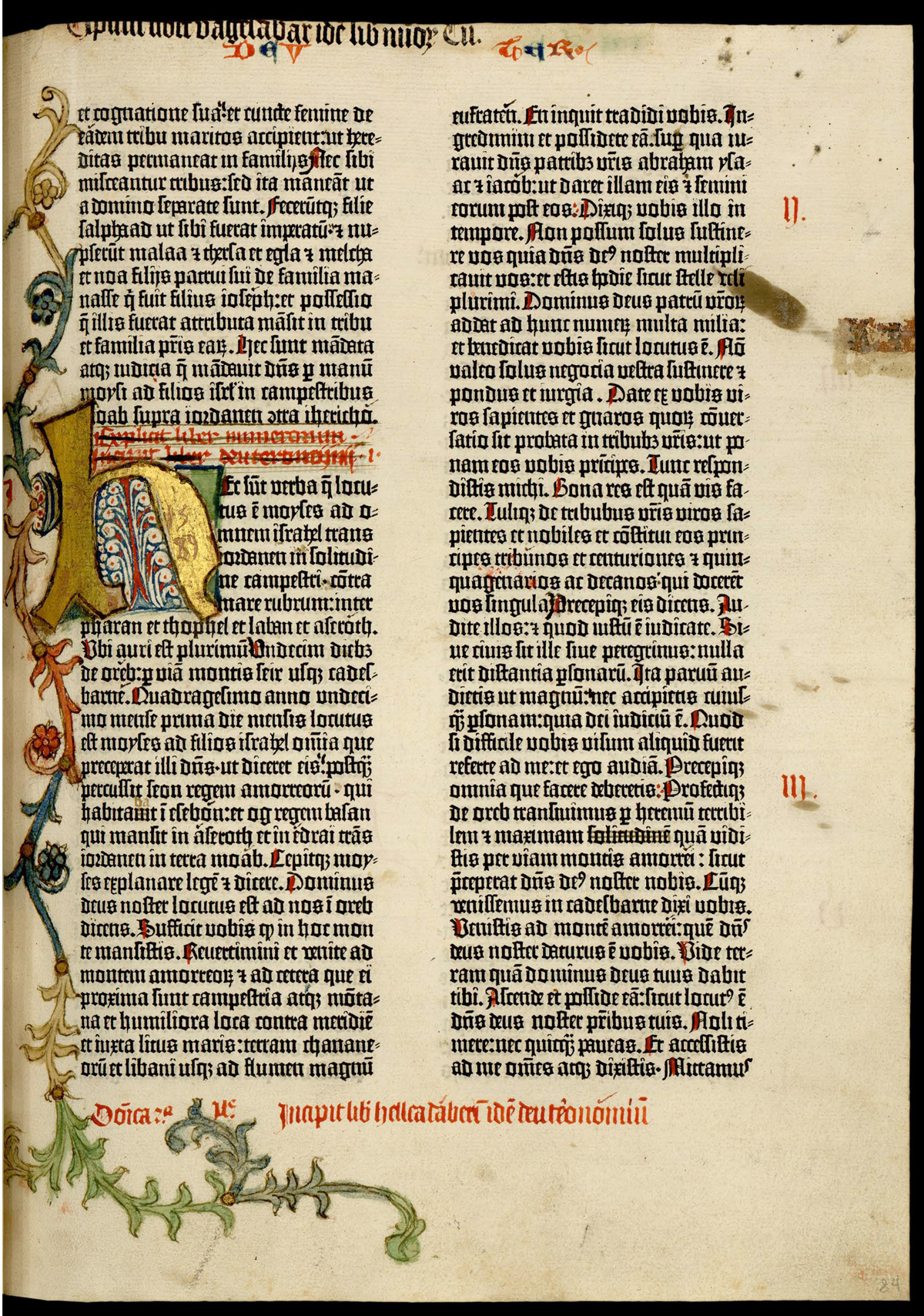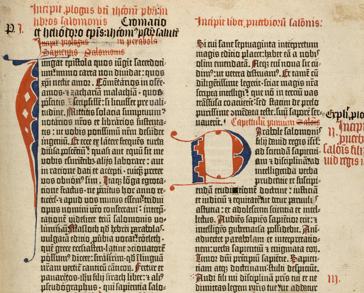 February 17, 2016, Filed Under: Books + ManuscriptsHand decoration in the Ransom Center’s Gutenberg Bible Ransom Center staff recently turned the pages of the Gutenberg Bible to the opening of Deuteronomy. Gutenberg Bibles have been a great object of study for scholars and historians of letterpress printing, but the manuscript decoration added to the Bible after printing also reveals a great deal about each Bible’s unique early history. This particular opening was selected to display the style of hand decorations that are found in volume one of our Gutenberg Bible. In the early days of printing, books were decorated by hand after they were printed, just as they were in the days that preceded Gutenberg. Before printing, books were hand written by a scribe and then subsequently decorated by an artisan. Below is an example of a manuscript Bible leaf in the Ransom Center’s collections, written entirely by hand in the thirteenth century: HRC Leaf B5 Bible leaf, ca. 1240. The layout of the page in two columns of text and the red and blue decorations are typical of Bibles in the few centuries before the invention of printing. The style of the large illuminated initials in volume one of the Ransom Center’s copy of the Gutenberg Bible, an example of which is seen below, has been described by one scholar as “idiosyncratic and eclectic” while another scholar has called their style “bizarre.” The opening of Deuteronomy, volume one, 84 recto. Often, the style of these large initials, which differ greatly from the style of letters in volume 2 of the Ransom Center’s copy, can indicate the location in which the decorations were done. The beginning of the book of Deuteronomy, illuminated letter H, volume one. Compare the decoration in volume one (above) to the decorations in volume two, here at the opening of Proverbs: The beginning of Proverbs, letters I and P, volume two. The initials in volume one tend to combine multiple decorative features, such as gilding, floral extensions, geometric shapes, and other pen work, while the initials in volume two are simple red and blue Lombard initials. Often, the general location of such workshops can be revealed through the style and or habits of the illuminators, such as those described here. But scholarly opinion regarding the location of the workshop that applied the decorations to volume one of the Ransom Center’s Bible has wavered from Bohemia to the Lower Rhine to southeastern Europe without agreement. What scholars do agree on is that the style is rustic, provincial, and less refined than the decorations one typically sees in Gutenberg Bibles. Such initials would be less costly, and appropriate for a Bible used in a monastic setting, like the Ransom Center’s copy. The initials in volume two are “generic Lombard initials” of a common style that are also very difficult to localize. The difference in the style of decorations in the two volumes does tell us that they were worked on separately by two different workshops—not surprising considering the scale of the job. Another curiosity visible in this opening is what seems to be the date of 1589 scratched into the gilt of the letter “H” that begins the book of Deuteronomy. Letter H at the opening of Deuteronomy with “1589” scratched in. The significance of the date, along with the identity of the hand that left it there and the unique nature of these decorations, remains food for scholarly thought and future investigation. Related content Gutenberg Bible Page Turning: Genesis, Chapter XI, Volume I:9r The Gutenberg Bible turns a new page See full digitized version of the Gutenberg Bible Receive the Harry Ransom Center’s latest news and information with eNews, a monthly email. Subscribe today.