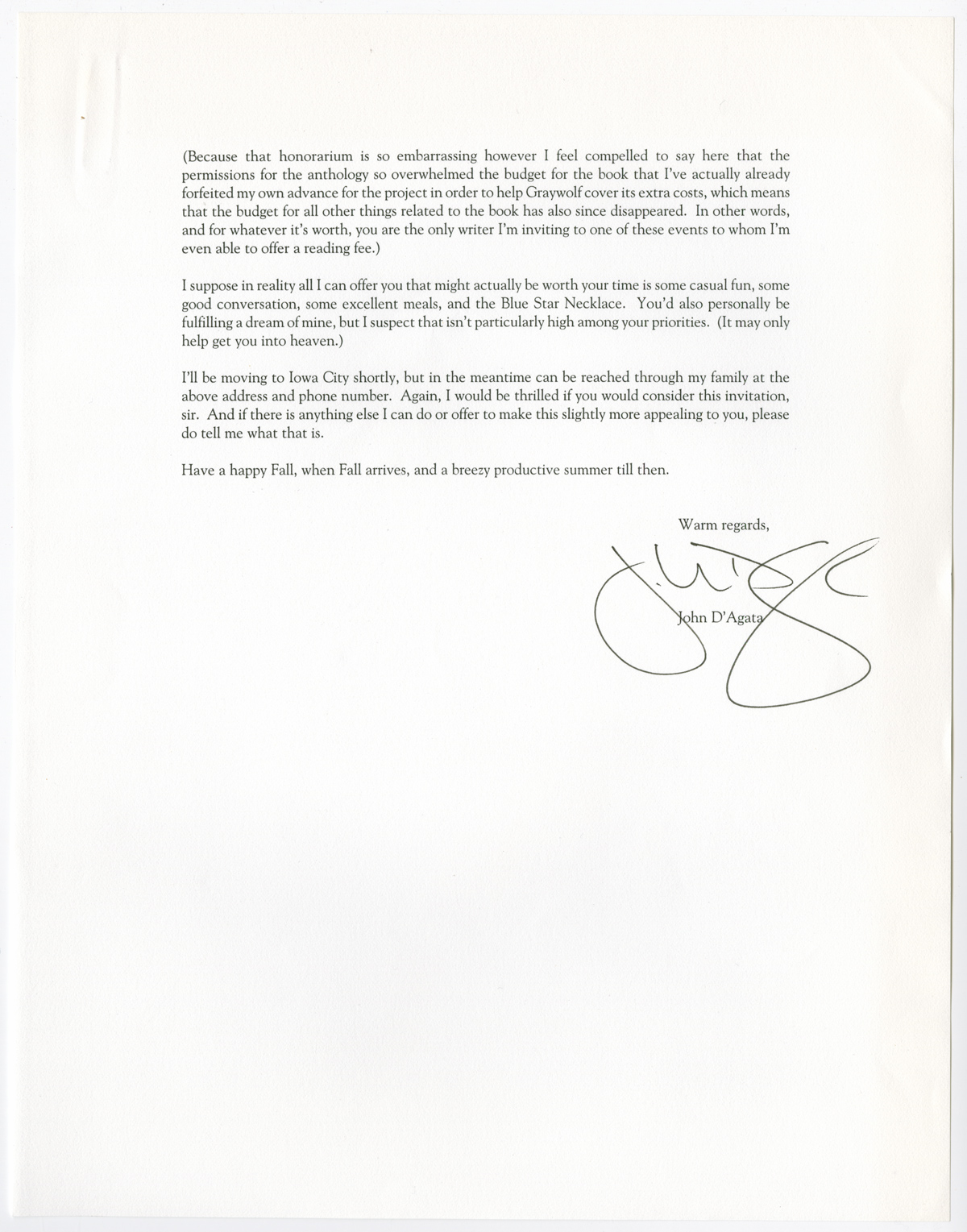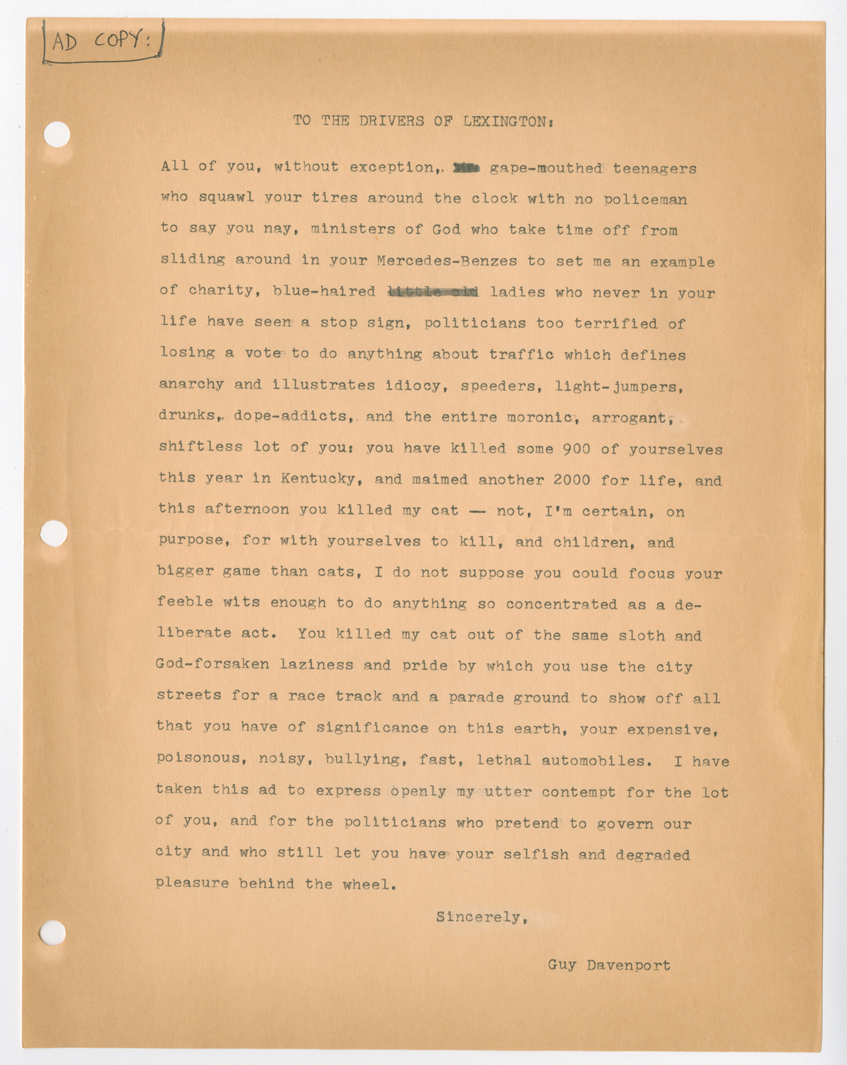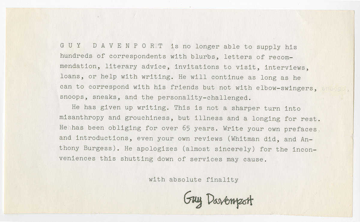 February 24, 2016, Filed Under: Authors, CatalogingDear Guy: Letters in the Guy Davenport collection Here’s the plot of a story a writer told me he had joked about writing with Guy Davenport: For about two days in the 1970s, Queen Elizabeth, the Dalai Lama, and Thomas Merton were within twelve miles of one another in central Kentucky, about a mile from Lincoln’s birthplace. Merton lived at the Abbey of Gethsemani, the Dalai Lama was visiting him, and Queen Elizabeth was staying on a nearby farm where some of her horses were kept. In real life, the three never crossed paths, but in the story they do: “a tire blows out, there’s a great storm, their security details crash into each other on an icy road, they all wind up taking shelter in a barn somewhere. The trick would be figuring out the 4th person.” I was a graduate intern at the Harry Ransom Center, just beginning to assist with processing the final sections of correspondence in Guy Davenport’s papers, which the center had acquired in 2005, after the writer’s death. This month, the papers—letters, artwork, publications, and manuscripts by Davenport and others—are cataloged and available for research. Reading the collection’s finding aid—and seeing the incredible range of characters who considered Davenport a friend, mentor, or collaborator—the answer to the riddle of the fourth person is clear: it would be Davenport, of course, the shelter his home in Lexington, KY. Envelope illustrated by Roy Behrens Letter from Roy Behrens to Davenport. November 27, 1978 The Guy Davenport papers cover six decades of his life as a writer, scholar, painter, and intellectual. But the collection is especially noteworthy for the scope of its incoming correspondence. If Davenport’s own work never drew a popular audience, his letters at first blush would seem to suggest otherwise. The list of more than 2300 correspondents reads like a twentieth-century publisher’s rolodex: John Updike, Eudora Welty, Marianne Moore, Louis Zukofsky, Cormac McCarthy, Hugh Kenner, Joyce Carol Oates, Dorothy Parker, Ezra Pound, and on and on and on. Many of the exchanges span decades, including epistolary friendships begun as an admiring young writer’s shot in the dark. Letter from Guy Davenport to the Lexington Herald-Leader Because artists trusted and respected Davenport, their letters constitute smaller collections within the larger collection of papers and artwork that reflect Davenport’s work and life. Writers conferred with him about art—theirs and others’—between casual and intimate details about their days. They sent him their manuscripts at various draft stages, seeking the insight of a master, and for the most part took his comments—always honest, it seems, sometimes painfully so—with gratitude. Letter from John D’Agata to Davenport. August 17, 2003. Letter from John D’Agata to Davenport. August 17, 2003. Davenport rarely saved copies of the letters he wrote, so reading others’ responses to him can feel like looking at the writer through a dark glass. I imagine him sitting down to write back to a young John D’Agata; the Southern poet and founder of The Jargon Society, Jonathan Williams; and some precocious student from a local high school in the same afternoon. How did he do it? Richard Workman, the archivist who processed the collection, tells me that Davenport recycled parts of his letters, passing anecdotes between his correspondents and on to his own work. His system for organizing the letters changed several times. First he used file cabinets, then letter boxes, grouping correspondence by the first letter of the writer’s last name. During the last decade of his life he simply tossed read letters into a box until it filled up, then started on another. Finally, he was ready to let himself rest, and replied with this letter: Form letter from Davenport to writers Guy Davenport is no longer able to supply his hundreds of correspondents with blurbs, letters of recommendation, literary advice, invitations to visit, interviews, loans, or help with writing. He will continue as long as he can to correspond with friends but not with elbow-swingers, snoops, sneaks, and the personality-challenged. He has given up writing. This is not a sharper turn into misanthropy and grouchiness, but illness and a longing for rest. He has been obliging for over 65 years. Write your own prefaces and introductions, even your own reviews (Whitman did, and Anthony Burgess). He apologizes (almost sincerely) for the inconveniences this shutting down of services may cause. with absolute finality [signed] Guy Davenport