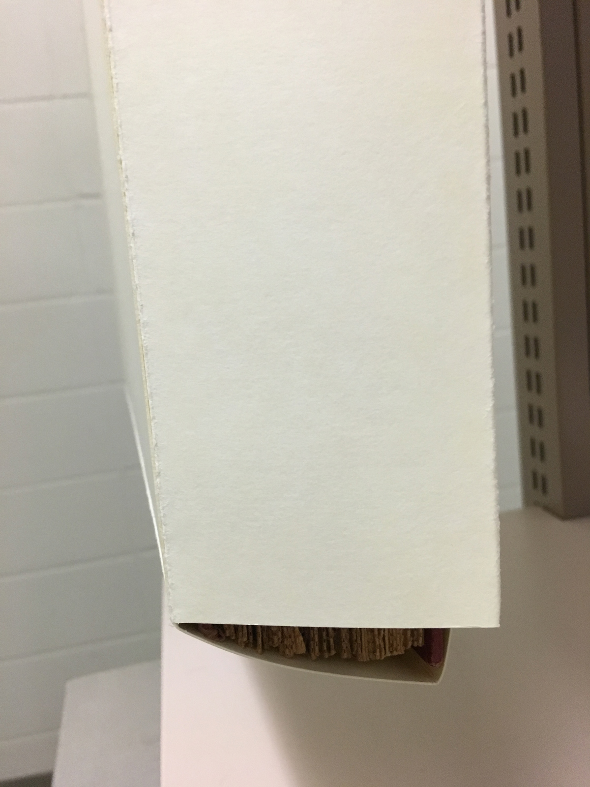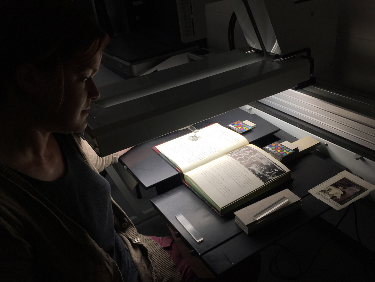 March 4, 2016, Filed Under: Authors, Conservation, Digital CollectionsThinking outside the (tux) box: A novel solution to preserving the quirky diaries of the Guy Davenport collection Last year, Ransom Center archivist Richard Workman brought to my attention some journals that he was cataloging as part of the Guy Davenport Papers. Guy Davenport (1927–2005) was an American author, literary critic, and artist. Throughout his adulthood, he regularly kept journals of his day-to-day life and activities (including his feelings about his marriage gone bad, as well as the saga of Humphrey, his cat who went missing for two weeks), but also include entries about his letters to and from the many important literary figures he corresponded with, including Ezra Pound, Hugh Kenner, and Louis Zukofsky. As informative as these entries are, something else that makes these journals stand out is that Davenport illustrated them, mostly using cutouts from magazines as well as his own drawings. Loose illustration in one of Guy Davenport’s journals. Photo by Alan Van Dyke. Workman was concerned that some illustrations had detached from the pages. Ransom Center conservators could reattach the illustrations, but the volume posed a daunting task. Other illustrations would likely also detach over time, requiring more treatment at a later date. We had to determine a way to ensure that loose illustrations did not become separated from the page location within each journal, that each illustration stayed with the proper journal, and that researchers could still access the information within the journals. We made the decision to use a two-step approach to preserving these journals while still providing access. A heavy book inside the standard tux box causes the bottom to sag. Photo by Alan Van Dyke. The first step was to make a housing for each journal. We decided to use what conservators call a tux box, a simple four-flap enclosure developed at the Ransom Center. This way, if an illustration came loose from the page, it could not easily fall out of the journal. However, the choice of a tux box presented a new problem: larger books stress the bottom of the box, potentially causing damage to the item or structural failure of the box. The design of the tux box had to be modified in a way to keep the bottom of the box from sagging. Traditional tux box tongue and slit. Photo by Alan Van Dyke. A heavy book inside the standard tux box causes the bottom to sag. The box closes itself with a tongue and slit. The slit is usually horizontal, allowing gravity to easily pull it down when not supported on a shelf. However, if the slit is vertical, and the tongue adapted to slide into a vertical slit, then the bottom part of the box is held more securely in place. Modified tux box tongue and slit. Photo by Alan Van Dyke. A heavy book inside a modified tux box doesn’t sag. Photo by Alan Van Dyke. A Guy Davenport journal set in an open four-flap tux box. The next challenge was making the information in the journals available to researchers without risking the misplacement or loss of loose illustrations. We decided to digitize the journals cover-to-cover, convert the images to PDF format, and make the digital files available in the Reading and Viewing Room. This way we are able to restrict handling of the physical journals yet still allow access to what is inside them. Another advantage of scanning the journals is that Ransom Center staff now have a record of where each illustration lies within each journal. Scanning Technician Anne Merkle scans a Guy Davenport journal. Photo by Alan Van Dyke. Although the Ransom Center has created housings for thousands of journals and scrapbooks, and digitized almost as many, this is the first time we have comprehensively approached a collection of this size with the initial intention of using both methods of preservation. During this project, we housed 95 journals and scanned almost 20,000 pages. Scanned page with loose illustration in its proper place. Photo by Alan Van Dyke. Guy Davenport’s 95 journals housed in tux boxes. Photo by Alan Van Dyke. The Guy Davenport journals have been digitized and are available for viewing in the Reading and Viewing Room along with the rest of the Davenport Papers. Related content Dear Guy: Letters in the Guy Davenport collection Receive the Harry Ransom Center’s latest news and information with eNews, a monthly email. Subscribe today.