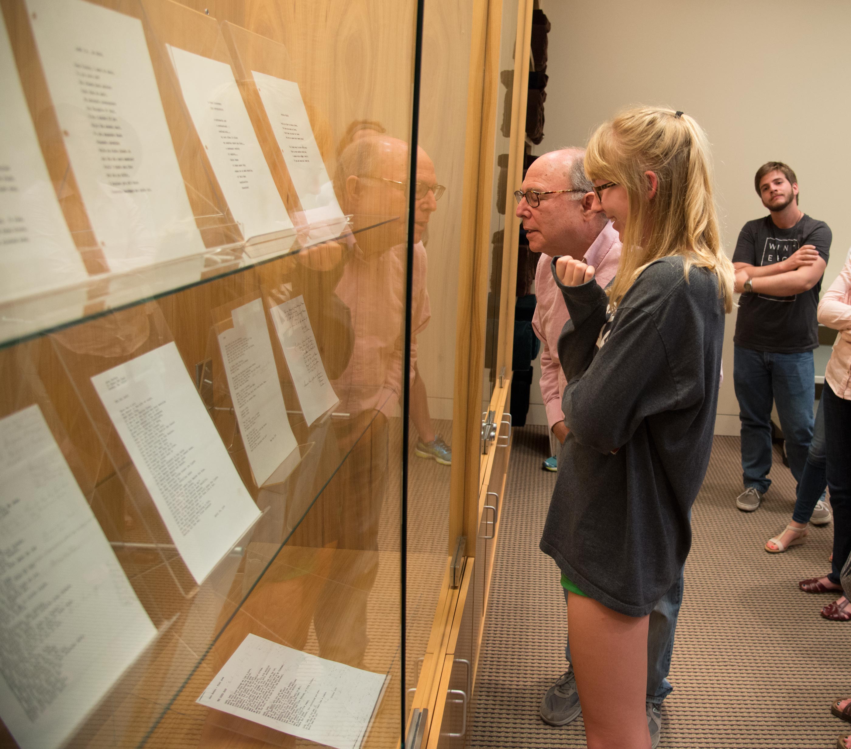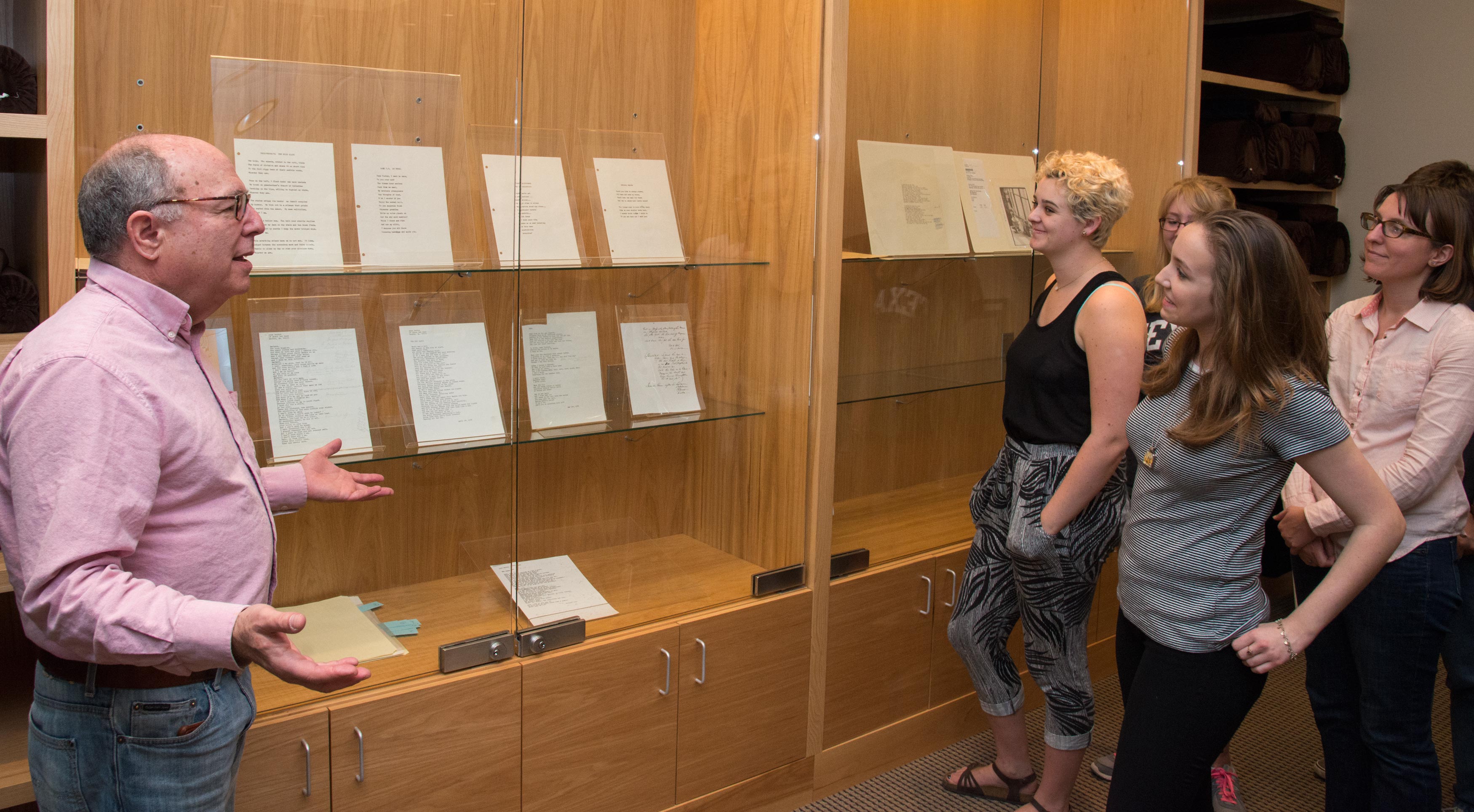 April 29, 2016, Filed Under: Books + Manuscripts, Research + TeachingOut of the classroom, into the collections: Undergraduate class brings students to Ransom Center archives Kathleen (Katy) Telling is a Plan I Honors Junior at The University of Texas at Austin, majoring in History and French. She’s taking Dr. Robert Abzug’s “Religion and Psychology in Modern American Culture,” which meets periodically at the Harry Ransom Center. I never thought I would have a beef with Alfred A. Knopf. For one, the thought of sharing a single line of my past angst-ridden ninth grade attempts at creative writing as published “literature” genuinely slows my heart rate to a complete rest. For another, the gentleman in question passed away in 1984, eleven years before I was born, leaving my indignance, perhaps, too little too late. And yet, here I was, rolling my eyes at the Knopf publishing house’s rejection letters of psychologist Rollo May’s recently completed manuscript “Modern Man in Search of Himself.” “Who did these men think they were?,” my nose crinkling in righteous disagreement, “Had they read the book at all?” I was fuming, I was bothered, I was…defensive? Defensive on behalf of this man whose name I had never even heard of until two weeks ago? Such is the absurd profoundly human reach of archives and the stories they can tell. Accessing collections brings the lives of individuals whose experiences may otherwise seem no more personal than a Wikipedia page back into the present moment, teaching you, comforting you, or, in my case, annoying you. Luckily, I had an entire class dedicated to facilitating these instances of connection. This semester I’ve had the pleasure of taking Dr. Robert Abzug’s “Religion and Psychology in Modern American Culture.” Each Tuesday, our class meets in the College of Liberal Arts building to unpack (as best we can) the works we have been assigned to explore. Every Thursday, though, the subjects we discuss at length in class have leaped out of their modern-day reprinted bindings and into the softly lit shelves of the Ransom Center’s Feldman Room. Showcased in these shelves are related archival material Dr. Abzug selects weekly for our class to view. Students observe Ransom Center materials under the guidance of Dr. Robert Abzug. For me, the Knopf materials undoubtedly elicited the strongest response, as I had days prior fallen for Rollo May’s invitation to live courageously, be vulnerable, and embrace the reality of mortality. As a reader with an appetite for irreverent prose and biting satire (nonfiction or otherwise), it’s not often I fall for the tenderness of an author’s writing, and I was feeling particularly defensive of May. Needless to say, I rankled under the haughtiness of the rejection letters. However, the Knopf materials were only the tip of the iceberg. For my classmate Sarah Stahl, the connection to the class and Ransom Center collections came about in an entirely different way: “I love going to the Ransom Center for class because it makes learning about the authors more interesting. When we got to see the first edition of “Leaves of Grass” (1855), one of which is signed by Walt Whitman, it made Whitman seem more real and personable. I felt like I developed a deeper understanding and connection with the author that I wouldn’t have had if we just read the book in a classroom.” For Junior Rachel Landman, it was the materials Dr. Abzug first pulled for the class that piqued her interest: “I really enjoyed the Ransom Center’s collection of phrenology reports. Phrenology is a really interesting and fairly short time in psychology and psychotherapy history, and I loved seeing a real piece of that history in person.” Junior Rachel Landman with Dr. Robert Abzug. What’s striking about the diversity of our responses is that they reflect the diversity of materials housed in the Ransom Center and how unpredictable connections with materials can be. For the three of us, the eureka moment was found in the acerbic rhetoric of a prestigious publishing house, the esoteric stanzas of a transcendentalist poet, and the peculiar diagrams of phrenological reports. For others, those ineffable moments of understanding of the past could have come from Carl Jung’s correspondence, or Spiritualist photography doctored to depict a young English woman communing with fairies in her lush backyard garden, an oddity pulled from the collection of Sir Arthur Conan Doyle. This class, one way or another, one archive or another, brings the fields I am encountering for the first time before my eyes, providing a tangible timeline through history. Not only has this experience left me with a greater respect and appreciation for the study and history of psychology and religion as a whole, but has also granted me the opportunity to forge new relationships with past lives. That link-forging is at the heart of humanities research, and it has been the joy of taking of this class. As for Knopf, I have to cut him some slack. After all, it was his publishing company and not the man himself who was giving the work of my newfound favorite psychologist the boot. May’s work was predicated upon the study of modern man’s anxiety, and negative reactions to a book which deviated from the usual tone of contemporary psych publications were perhaps illustrative of the concepts May sought to better understand. Certainly, not everyone has to fall in love with the words and ideals of Rollo May, or those of any writer, for the matter. And as a student of the humanities, I can learn to forgive a little historic pretension. At least, just this once. Related content Bringing undergrads into the thick of research Receive the Harry Ransom Center’s latest news and information with eNews, a monthly email. Subscribe today.