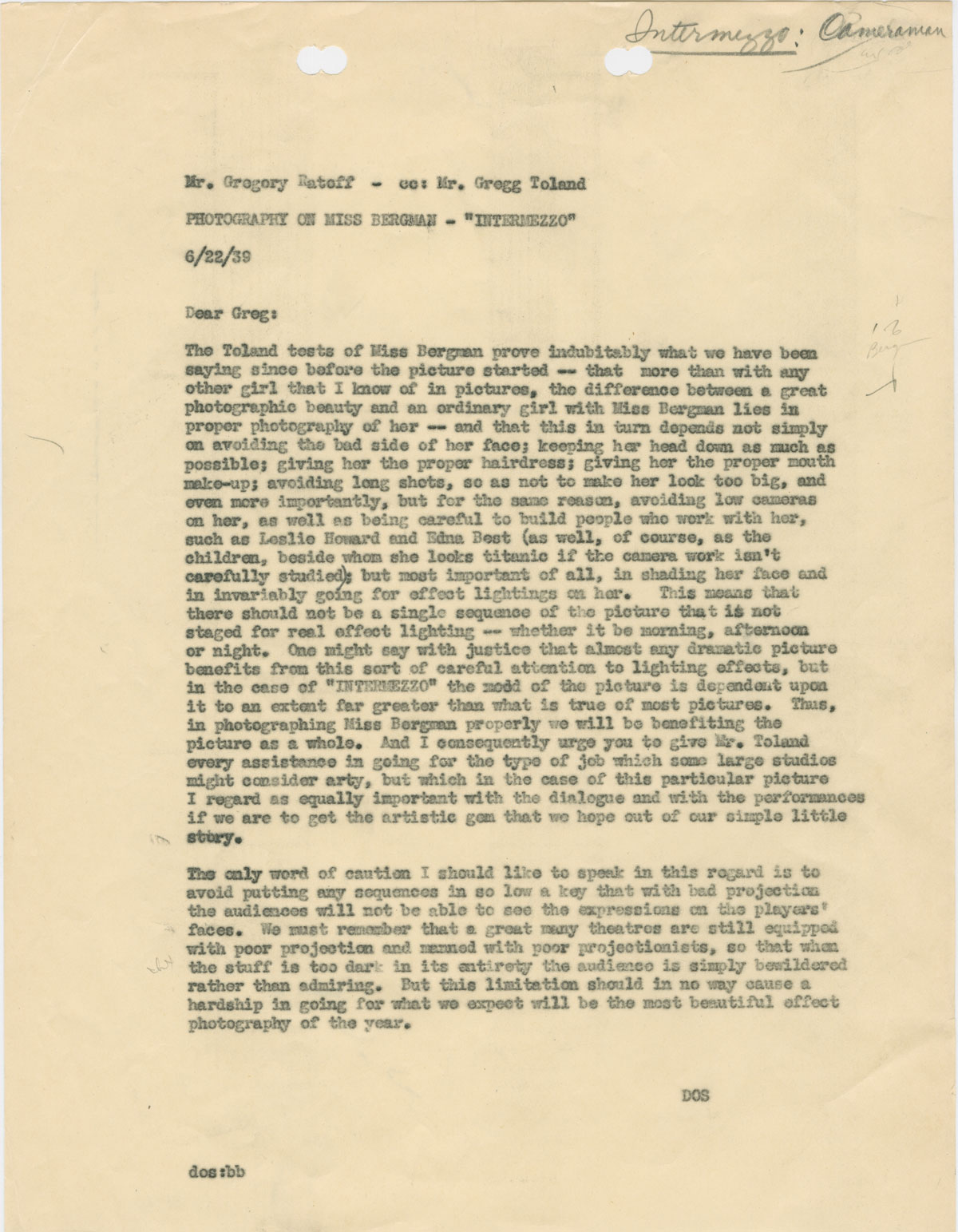 May 31, 2016, Filed Under: Film, Research + TeachingFellows Find: David O. Selznick constructs a “natural beauty” Producer of movies and star identities Ingrid Bergman in a 1939 publicity photo for Intermezzo. From the David O. Selznick collection at the Harry Ransom Center. David O. Selznick (1902–1965) was not only a producer of celebrated films such as A Star Is Born (1937), Gone with the Wind (1939), and Since You Went Away (1944), but also of popular star identities. During his prolific career as an independent producer, he brought into prominence actors Gregory Peck and Louis Jourdan and actresses Vivien Leigh, Joan Fontaine, Ingrid Bergman, and Jennifer Jones, among others. Stars represented important assets for Selznick’s company and the producer took great pains to develop and protect them: he personally selected their films and key collaborators, made numerous contributions to screenplays, advised directors and cameramen on how to photograph them, and supervised promotion and publicity for them and their projects. Among Selznick’s most valuable contract players was Ingrid Bergman Discovered in her native Sweden by Selznick’s talent scout Kay Brown, Ingrid Bergman was brought to the U.S. in 1939 and cast in an English-language remake of one of her own films Intermezzo (originally produced in 1936 and directed by Bergman’s mentor Gustaf Molander). Always cost-conscious, Selznick argued that “one of the principal reasons for buying foreign pictures to remake, is that when they are good they save a very large part of the agonies of creative preparation and a large part of the cost as well.” Prior to the release of the film, Selznick devised an ingenious plan of launching Bergman’s American career. He urged his associates to withhold all publicity on the actress with the purpose of letting the public and critics “discover her for themselves.” The absence of typical ballyhoo was perfectly in line with the way he wanted to present his new discovery–as an ordinary and unpretentious young woman with naturally good looks, in direct contrast to exotic glamour types in the vein of Greta Garbo and Marlene Dietrich. Ingrid Bergman in a publicity image for Intermezzo. From the David O. Selznick collection at the Harry Ransom Center. Lighting is everything In a memo from June 22, 1939, David O. Selznick instructs cameraman Gregg Toland and director Gregory Ratoff how to photograph Ingrid Bergman for Intermezzo. Yet, the Selznick collection materials at the Harry Ransom Center reveal that Bergman’s celebrated naturalness and authenticity were, to a certain extent, products of a tightly controlled process supervised by Selznick himself. Specifically, Selznick paid extraordinary attention to her photography in Intermezzo because, according to Selznick, “it is the difference between a successful picture and an unsuccessful picture; the difference between a new star and a girl who will never make another picture here.” Selznick was dissatisfied with the work of his first cameraman, Harry Stradling, who proved unable to capture Bergman’s unique qualities and was replaced with Gregg Toland, who was famed for his innovative lighting techniques. Despite Toland’s impressive track record, which included two Oscar nominations and a recent cinematographic triumph in Wuthering Heights (1939), Selznick closely monitored his progress and made regular suggestions. In a memo from June 22, 1939, he instructs Toland and director Gregory Ratoff how to photograph Bergman and lists numerous requirements. These include: avoiding the bad side of her face; keeping her head down as much as possible; giving her the proper hairdress; giving her the proper mouth make-up; avoiding long shots so as not to make her look too big; …avoiding low camera on her; …but most importantly of all, in shading her face and invariably going for effect lighting on her. Selznick even personally devised Bergman’s introductory scene in the film, which would present the actress to American audiences for the very first time, and ordered several retakes until he was completely satisfied. We can see, then, that a lot of artifice was necessary to properly render (or produce?) Bergman’s reputed “naturalness.” Even though Intermezzo: A Love Story didn’t become a resounding box office success, it accomplished Selznick’s most important goal: it provoked audiences’ and critics’ interest in his new discovery. In the following years, Ingrid Bergman went on to become one of the most popular and beloved Hollywood personalities, starring in Casablanca (1942), Gaslight (1944), and Spellbound (1945). Dr. Milan Hain is an assistant professor in the Department of Theater and Film Studies at Palacký University in the Czech Republic whose research incorporates studies of classical Hollywood film, exile cinema, and film noir. Hain is the author of Hugo Haas and His (American) Films, co-author of Within the Lines of Admissibility: Censorship in Film and Television, and editor of Hugo Haas: Between Central European and American Culture. Hain received a fellowship supported by the Filmscript Acquisitions Endowment to conduct research for Selznick International: Courting Europe. Related content “Nothing can match the serene, silent images of Ingrid Bergman’s first Hollywood screen test” Cinematography: The financial effects of Ingrid Bergman’s beauty Web exhibition “Producing Gone With The Wind” launches today Jennifer Jones materials in collections