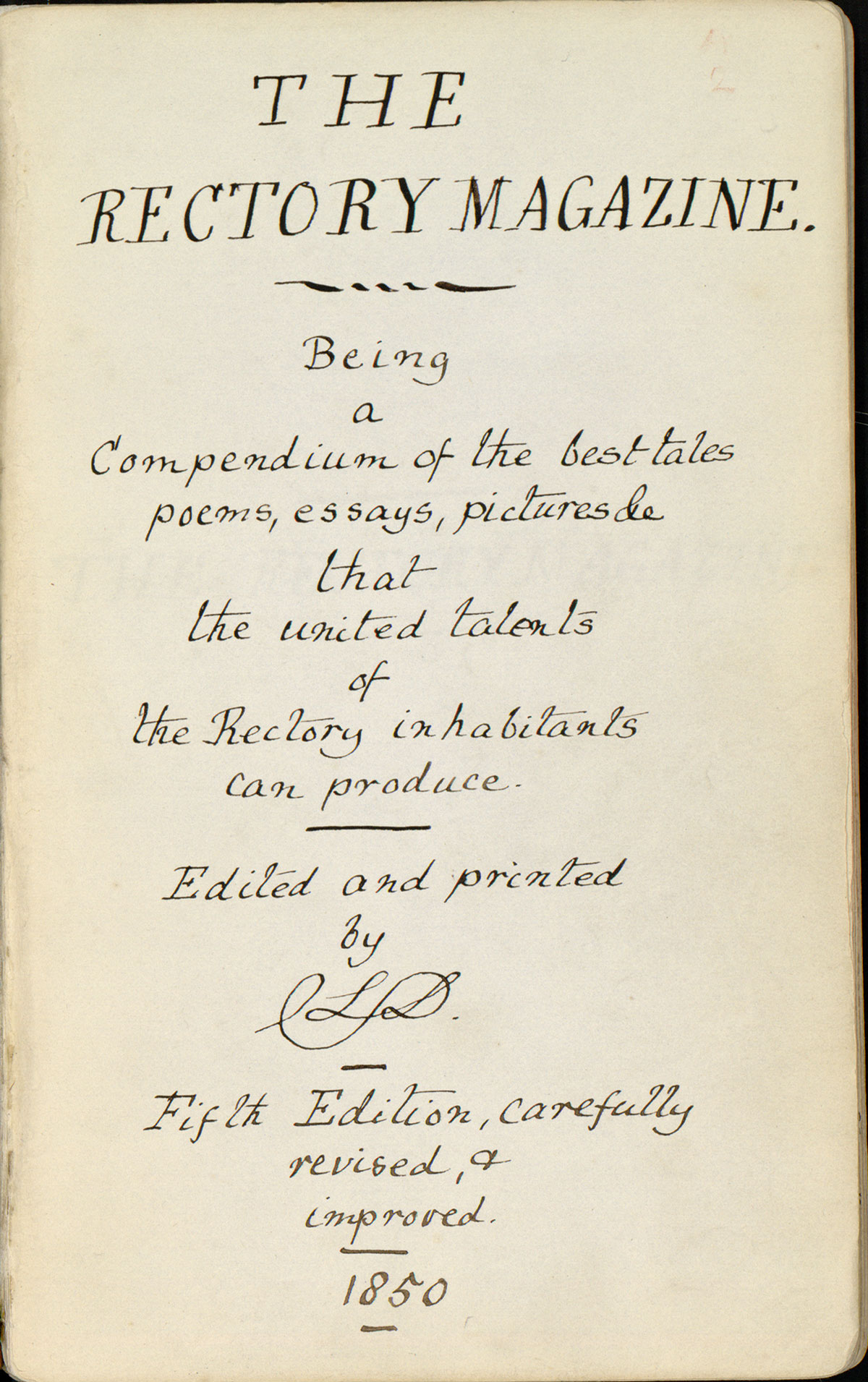 October 13, 2016, Filed Under: Digital CollectionsA young Lewis Carroll, “musing on milk” and “reasoning on rubbish” Through its digital collections portal, the Harry Ransom Center has made available a remarkable example of juvenilia from its Charles Lutwidge Dodgson collection. Charles Lutwidge Dodgson, 1832-1898, The Rectory Magazine, 1850, manuscript. Charles Lutwidge Dodgson Collection, Harry Ransom Center. Dodgson, of course, became best known to the world as Lewis Carroll, the author of Alice’s Adventures in Wonderland (1865). In 1850, when Dodgson was 17 or 18, he and his siblings completed their work on The Rectory Magazine. The magazine, named for the Dodgson family home, is “a compendium of the best tales, poems, essays, pictures &c that the united talents of the Rectory inhabitants can produce.” Charles Dodgson edited the magazine and produced the majority of the content. The magazine also includes work by six of his ten siblings and an advertisement for a “maid of all work” from a contributor identified as “L.L.” The magazine includes a key to the contributors with their “assumed initials,” a table of contents, and an index. In his opening editorial statement, “Reasonings on Rubbish,” Dodgson offers a tongue-in-cheek introduction—imagining a day when “the Rectory Magazine shall draw from admiring thousands their unanimous and uncalled for plaudits” and “when infants shall lisp their first spelling lessons out of ‘Reasonings on Rubbish’!” In compiling the magazine, Dodgson and his siblings followed the conventions of the nineteenth-century periodical press. His “Answers to Correspondents,” which appears eight times throughout the magazine, mimics a common feature of magazines and newspapers of the day in which editors would print answers to questions from readers without including the questions themselves. The result was a string of non-sequiturs. Dodgson’s “Answers” take the at-times absurdity of these features to new heights. (Fifteen years later, Mark Twain would also find the format conducive to satire, publishing six columns of his own “Answers to Correspondents.”) “Reasonings on Rubbish” and “Answers to Correspondents” are just a sampling of the materials in The Rectory Magazine. There are poems, serialized stories, colored illustrations, a disquisition on the word “But,” and the highly alliterative “Musings on Milk.” The Rectory Magazine offers us a glimpse of a developing young writer whose early work continues to entertain and delight more than 160 years later. Danielle Brune Sigler is Associate Director for Scholarly Programs at the Harry Ransom Center. Sigler oversees public programming, publications, and fellowships at the Ransom Center. Her research interests include African American history and culture and American religious history. She is co-editor of The New Black Gods.