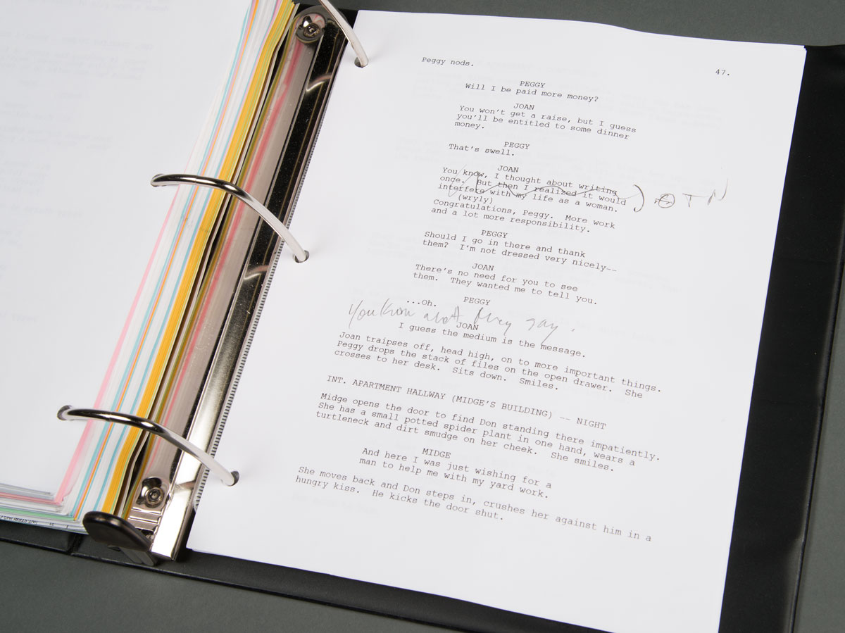 January 12, 2017, Filed Under: FilmEmmy and Golden Globe award-winning Mad Men archive donated to UT Austin’s Harry Ransom Center The archive for the acclaimed drama Mad Men, one of television’s most honored series in history, has been donated to the Harry Ransom Center, a humanities research library and museum at The University of Texas at Austin. The donation was made by Matthew Weiner, the series creator, executive producer, writer and director; and Lionsgate, which produced the critically acclaimed series. The donated materials include script drafts and notes, props, costumes, digital records, and video relating to the creation, production, and marketing of the series. Mad Men, which followed the professional and personal lives of Madison Avenue advertising men and women during the 1960s, has been praised worldwide as much for its brilliantly drawn characters and artistic originality as for its historical authenticity. Mad Men premiered in 2007, going on to join an elite group in 2011 when it became only the fourth drama to be awarded four consecutive Emmy® Awards for Outstanding Drama Series. Additional honors for the series include: three Golden Globe® Awards for Best Television Drama Series; a Peabody Award; three Producers Guild Awards; six Writers Guild Awards; two BAFTA Awards; five Television Critics Association Awards, including Program of the Year; and being named on AFI’s Top 10 Outstanding Television Programs for seven consecutive years in addition to receiving a special award at last year’s luncheon for the show’s final season. “Mad Men” writers. Matthew Weiner is fourth from left. “Mad Men is a groundbreaking program, noteworthy for the high quality of its writing, acting and design, as well as for the insightful depiction of American culture through the lens of the past,” says Steve Wilson, the Ransom Center’s curator of film. “Through the Mad Men holdings, students and scholars will gain new insights into the creative decisions that shaped the series and a greater understanding of the evolution of motion pictures.” The series archive is rich in information about the work of actors, designers, writers, producers and creative direction, which aligns with the strengths of the Ransom Center’s film holdings. The archive complements the film collection at the Ransom Center, including its collections of David O. Selznick, Gloria Swanson and Robert De Niro. “It’s our hope that the Mad Men archive can satisfy academic curiosity and also provide creative inspiration,” says Weiner. “Both artists and scholars can retrace our steps and see how we became interested in the parts of the story we were interested in, and how the creation of the physical world as well as the characters and storylines in the show were the work of many talented people.” Script from “Mad Men.” Photo by Pete Smith. Materials from the series’ 92 hour-long episodes include inspiration boards and lookbooks of period fashion and home and office design, set and costume drawings, scripts, shooting schedules and call sheets. Production footage includes dailies, screen tests, gag and demo reels, trailers and publicity material. The donation includes a selection of costumes and small props, including materials for several of the show’s fictional ad campaigns and characters’ personal effects such as Joan’s pen necklace, Betty’s medical file, and Don’s terms of re-employment letter. “Mad Men is more than a great show—it is part of American and television history, a ground-breaking classic worthy of the scholarly research the Ransom Center supports,” says Lionsgate Television Group Chairman Kevin Beggs. “From its dramatization of gender roles in the workplace to its attention to historical detail in costume, set design and music, Mad Men set standards that will be emulated for decades to come. We’re proud to join with the show’s brilliant creator, Matthew Weiner, in making this archive available to students who want to explore a cultural touchstone.” Set design sketch for the Campbell residence. Photo by Pete Smith. Scholarly and popular interest in Mad Men is already strong, and the Ransom Center is confident that there will be enduring research interest in this landmark series. The depth and breadth of the archive allows researchers to see the full scope of the Mad Men team’s work. “With this acquisition, the Ransom Center becomes a must for researching television,” says Alisa Perren, associate chair and associate professor in UT Austin’s Department of Radio-Television-Film. “The Center’s acquisition of the Mad Men materials represents an exciting moment for television and media industry scholars. This collection will be vital for those wishing to learn about modern television development, research, writing and production processes, 1960s-era advertising practices, and shifting gender roles in American society.” Storyboard for a fictional ad campaign for Playtex. Photo by Pete Smith. The Ransom Center will conserve and catalog the materials, which will then be made available for exhibition, teaching, and research. The Ransom Center also awards fellowships to scholars to conduct on-site research in its collections. One of Peggy Olson’s outfits. Photo by Pete Smith. A selection of materials from the archive will be on view in the Ransom Center’s lobby through February 1. Janie Bryant. Photograph by Elisabeth Caren. Janie Bryant was the costume designer for the television series Mad Men. Some of Bryant’s costumes and research material, including inspiration boards for characters and lookbooks for costume designs, are included in the show’s archive. Kathryn Allison Mann was the head of research for the television series Mad Men. She mined period books, magazines, and newspapers—as well as her extensive network of New Yorkers—to ensure the historical accuracy the show is famous for. Much of Mann’s notes and original material is 