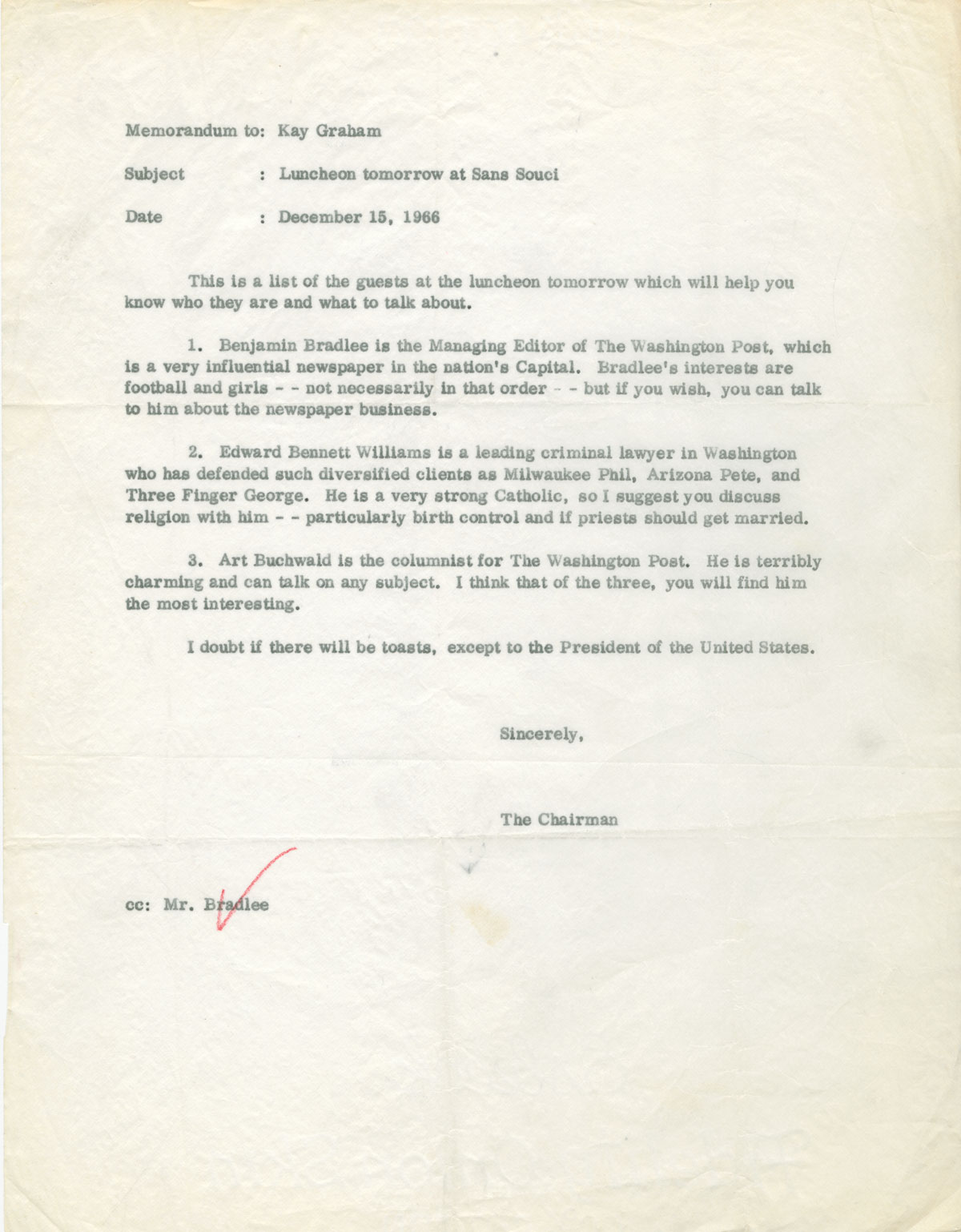 February 7, 2017, Bradlee was close friends with humorist Art Buchwald and attorney Edward Bennett Williams, and the three of them frequently had lunch at a restaurant near the Washington Post named Sans Souci. In this 1966 memo, Buchwald invites Post publisher Katharine Graham to dine with them. Bradlee was close friends with humorist Art Buchwald and attorney Edward Bennett Williams, and the three of them frequently had lunch at a restaurant near the Washington Post named Sans Souci. In this 1966 memo, Buchwald invites Post publisher Katharine Graham to dine with them.