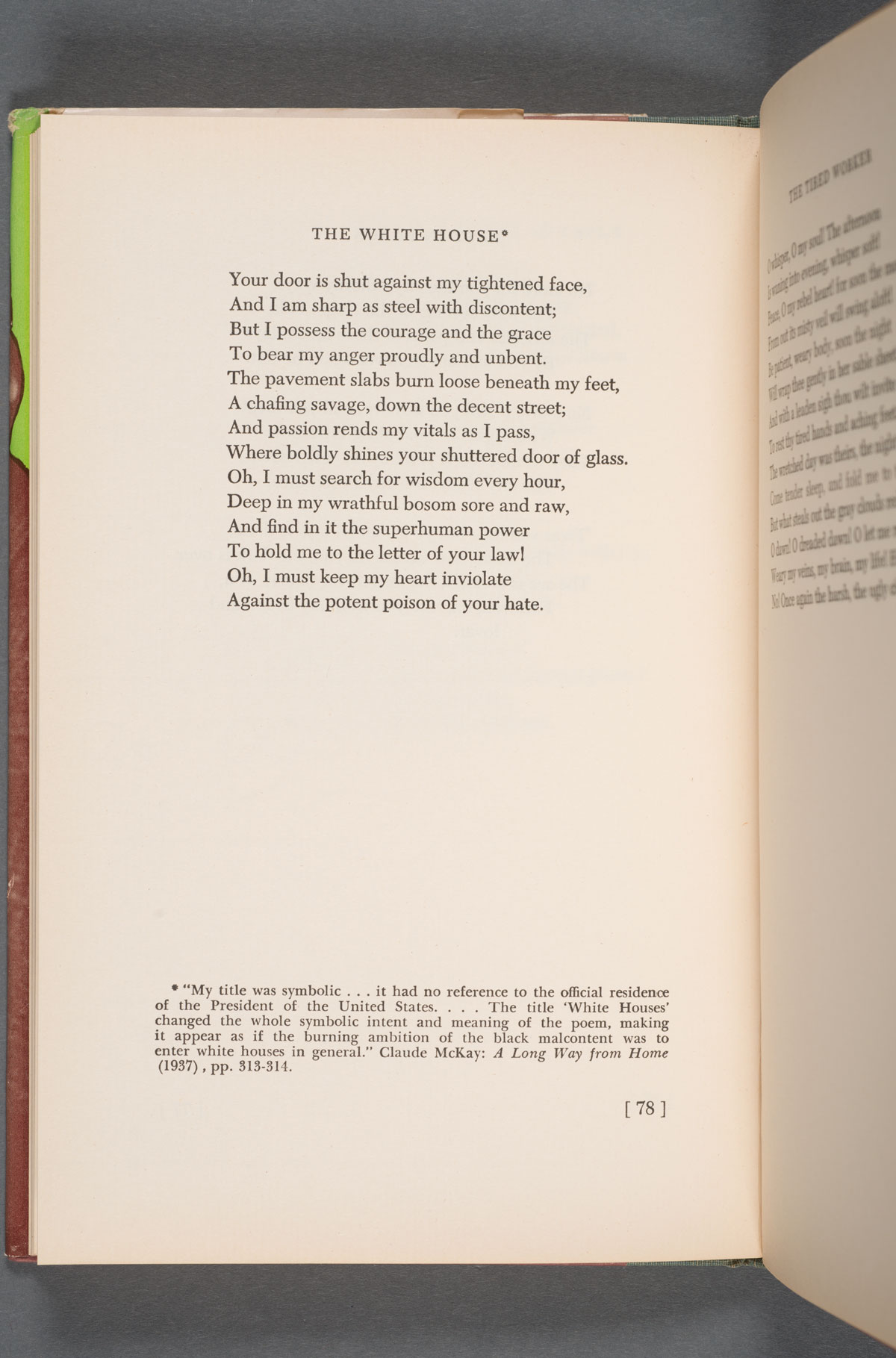 February 16, 2017, Filed Under: Authors, Books + ManuscriptsClaude McKay and “The White House” Explore the Harry Ransom Center, search digital collections, or plan your visit. This February saw the release of a previously unpublished Claude McKay novel, Amiable with Big Teeth (Penguin Classics). Photograph of Claude McKay, taken for ‘Home to Harlem’ promotion, c. 1928. McKay (1889–1948), a major Harlem Renaissance writer, is known for his best-selling novel Home to Harlem (1928) and poetry, including “If We Must Die.” Between 1919 and 1923, much of McKay’s poetry appeared in The Liberator, a socialist magazine at which McKay worked with editor Max Eastman. McKay first published his poem “The White House” in the May 1922 issue along with three other poems. He would later describe “The White House” as part of a series of sonnets “expressing my bitterness, hate and love.” Claude McKay’s poem “The White House” as it first appeared in “The Liberator” (May 1922). In 1925, when scholar Alain Locke guest-edited a special graphic issue of Survey magazine called “Harlem, Mecca of the New Negro,” he selected three of McKay’s poems for inclusion. “The White House” was among them. Locke, however, changed the title from “The White House” to “White Houses.” He was afraid that with the original title, the poem might be read as an indictment of the White House in Washington, D.C., and would potentially prevent Jamaican-born McKay, who was traveling abroad, from returning to the United States. (Locke’s fears were not unfounded; the FBI had ordered customs agents not to allow McKay into the country two years earlier.) An advertisement for Claude McKay’s poetry collection “Harlem Shadows” and a special subscription offer for “Harlem Shadows” and a year of “The Liberator,” from “The Liberator” (May 1922). In his 1937 autobiography, A Long Way From Home, McKay described his “amazement and chagrin” at Locke’s editorial change. He had asked Locke to remove the poem rather than include it with a title that “changed the whole symbolic intent and meaning of the poem.” The title, explained McKay, was a reference to the “vast modern edifice of American Industry from which Negroes were effectively barred as a group,” not a particular home. McKay claimed it was “ridiculous” to imagine this poem referred to “the official residence of the President of the United States” and that whether he was “permitted to return to America or not, [he] did not want the title changed.” Nevertheless Locke moved forward with publication of the poem as “White Houses” in the Survey Graphic and retained the “White Houses” title when he expanded the magazine issue into the landmark anthology The New Negro (1925). Claude McKay’s “The White House” (with an asterisk) as it appeared in the posthumously-published “Selected Poems” (New York: Bookman Associates, 1953) “The White House” was not included in McKay’s well-received poetry anthology Harlem Shadows (1922). The poem did appear in a 1953 posthumously-published edition of McKay’s selected poems. The title, restored to its original form, was followed by an asterisk pointing readers to a footnote with McKay’s explanation of the poem’s title. Almost 30 years after Locke, and five years after McKay’s death, the title “The White House” still required editorial intervention. McKay’s poem persists as a powerful contemplation of discrimination and exclusion. It concludes: Oh, I must keep my heart inviolate Against the potent poison of your hate. Claude McKay correspondence can be found in the Ransom Center’s William A. Bradley Literary Agency collection. The Center also holds editions of McKay’s Spring in New Hampshire, Harlem Shadows, Home to Harlem, Banjo, A Long Way From Home, and Harlem, Negro Metropolis.