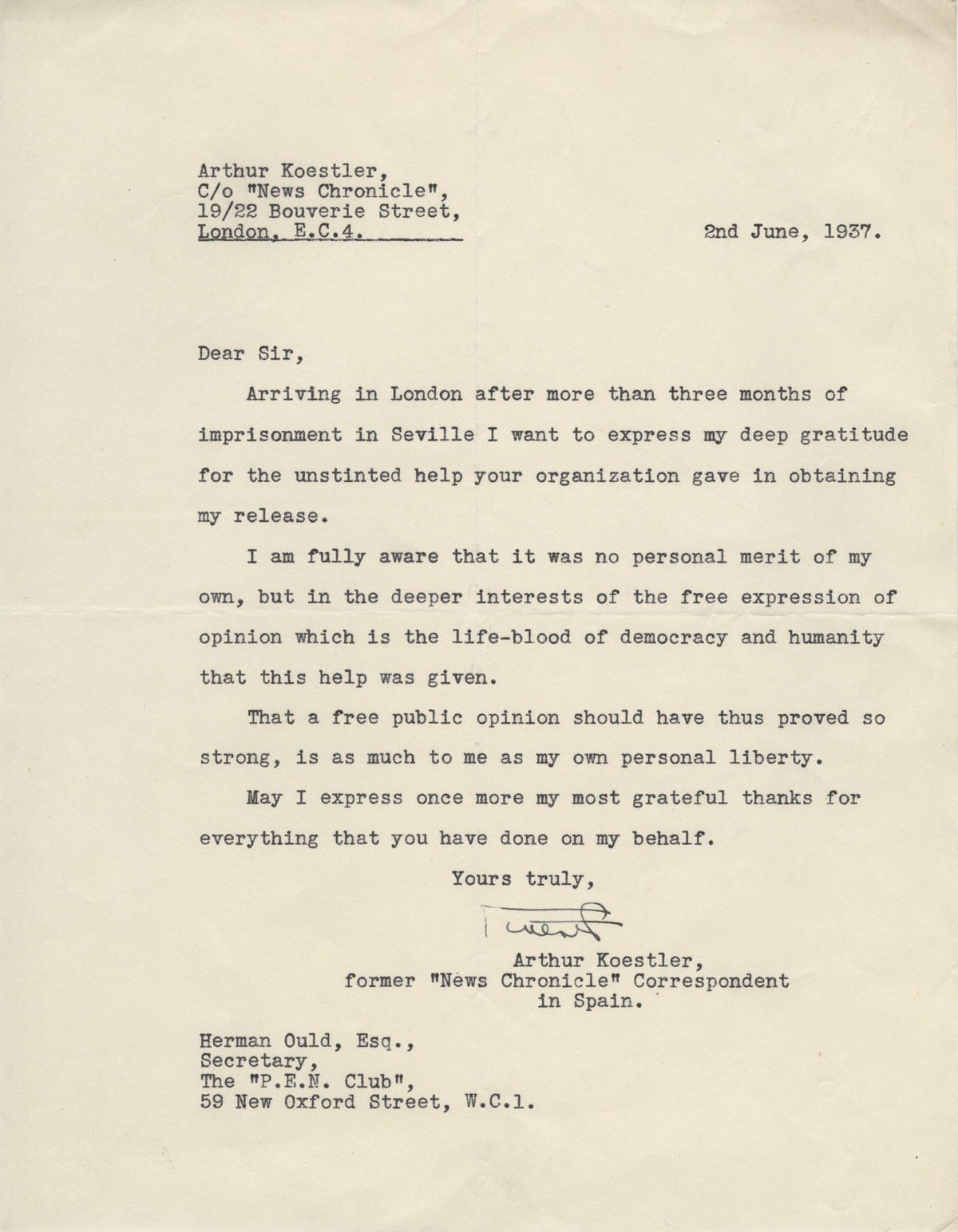 March 27, 2017, Filed Under: Books + Manuscripts, Research + TeachingWriters without borders: The power of PEN The story of twentieth-century political activism, persecution, and creative expression cannot be fully understood without exploring the rich materials in the PEN records at the Harry Ransom Center. The archives of PEN International and English PEN offer unique insight into human rights crises and document important cultural, historical, and literary debates of the last century. They illustrate in vivid and compelling ways why the humanities are integral to questions of equality, social justice, and freedom of expression and how humanists can successfully and powerfully engage in the public square. “When political people have finished with repression and violence PEN can indeed be forgotten. Until then, with its floundering and failings and mistaken acts, it is still… a fellowship moved by the hope that one day the work it tries and often manages to do will no longer be necessary.”—Arthur Miller, former PEN International President The Power of PEN PEN. Appeal to All Governments, printed text in English, French, and German, 1931. On May 10, 1933, a series of staged book burnings in cities across Germany provoked international debates about freedom of speech, censorship, and the fundamental importance of literature to a free society. Just two weeks later, PEN International convened its annual congress of writers in Dubrovnik, Yugoslavia. With H. G. Wells presiding, writer-delegates discussed the book burnings, how to respond to pro-Nazi German delegates in their midst, and whether to permit exiled German Jewish playwright Ernst Toller to speak despite German delegates’ objections. By the conclusion of the meeting, German delegates had left in protest, and Toller had addressed the congress. PEN, a relatively young organization, had adhered to its founding principles and reaffirmed its commitment to support “unhampered transmission of thought within each nation and between all nations.” In that moment, it also completed a transformation that had begun shortly after its founding in 1921, shifting from an apolitical organization to foster friendship and intellectual cooperation among “Poets, Essayists, and Novelists” to a human rights organization marshaling its membership to challenge the rise of fascism across Europe. Unidentified photographer. Photograph taken at the PEN Congress in Holland, 1931; seated to the right of the podium are PEN president John Galsworthy and PEN founder Amy Catherine Dawson-Scott. Nearly a century after its founding by British writer, poet, and playwright Catharine Amy Dawson Scott, and with a membership that now extends to journalists, publishers, and editors, PEN has left an indelible mark on international politics, culture, and literature. PEN’s reach is truly global and has been from inception. Within a year of its founding, PEN centers had spread to France, America, Belgium, and Sweden, soon followed by centers in Norway, Italy, Catalonia, Spain, Poland, Australia, Argentina, Japan, Brazil, and India. Today, there are 149 centers worldwide, each autonomous but working in tandem with the umbrella organization PEN International. Unidentified photographer. Photograph of inaugural ceremony of the Ghanaian Centre of International PEN, 1995. In the years since the 1933 PEN congress, English PEN, PEN International, and its other centers have retained their activist turn: protesting Nazi party treatment of intellectuals, the Franco regime’s imprisonment and death sentence of war correspondent Arthur Koestler in 1937, and the persecution of Jews in Poland. During World War II, PEN helped secure release of exiled German writers from British internment camps, and the organization served as advisor to the British Home Office on treatment of internees. Post-war years were devoted to recovery, continued assistance for refugees and exiles, and reestablishment of international ties broken by the war. Continuing efforts to help persecuted writers—in Greece and Chile during the 1940s and in Iran during the 1950s—led to the 1960 formation of the Writers in Prison Committee to combat ongoing attempts to silence writers through detention. In the 1970s, PEN established itself as a forum for writers from communist countries seeking to evade state censorship. An extensive PEN campaign supported novelist Salman Rushdie, when he received a death sentence in a fatwa issued by Iran’s spiritual leader in 1989. In the 1990s, PEN established the Women Writers Committee to confront challenges faced by women writers around the world, including unequal access to education and prohibition from writing. An online illustrated timeline entitled The PEN Story celebrates these and other highlights of the organization’s first 90 years. Arthur Koestler. Letter to PEN secretary Hermon Ould expressing gratitude for help in obtaining his release from prison in Spain, June 2, 1937. Throughout its history, PEN has counted some of the world’s most distinguished authors among its leadership. Just as importantly, PEN has been a voice for relatively unknown writers, particularly those facing persecution. In 1967, PEN International president Arthur Miller intervened on behalf of then little-known playwright Wole Soyinka, scheduled for execution in Nigeria. On the basis of Miller’s intervention, Soyinka was freed. Soyinka received the Nobel Prize for literature in 1986 and now uses his own international reputation to call attention to PEN’s efforts on behalf of an international community of writers. Today PEN defends freedom of expression and promotes literature through programs implemented by its global network of centers in more than 100 countries. International congresses allow delegates to engage in dialogue and form a circle of solidarity when needed. PEN supports and celebrates literature through community programs, literary awards, conferences, translations of