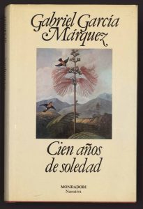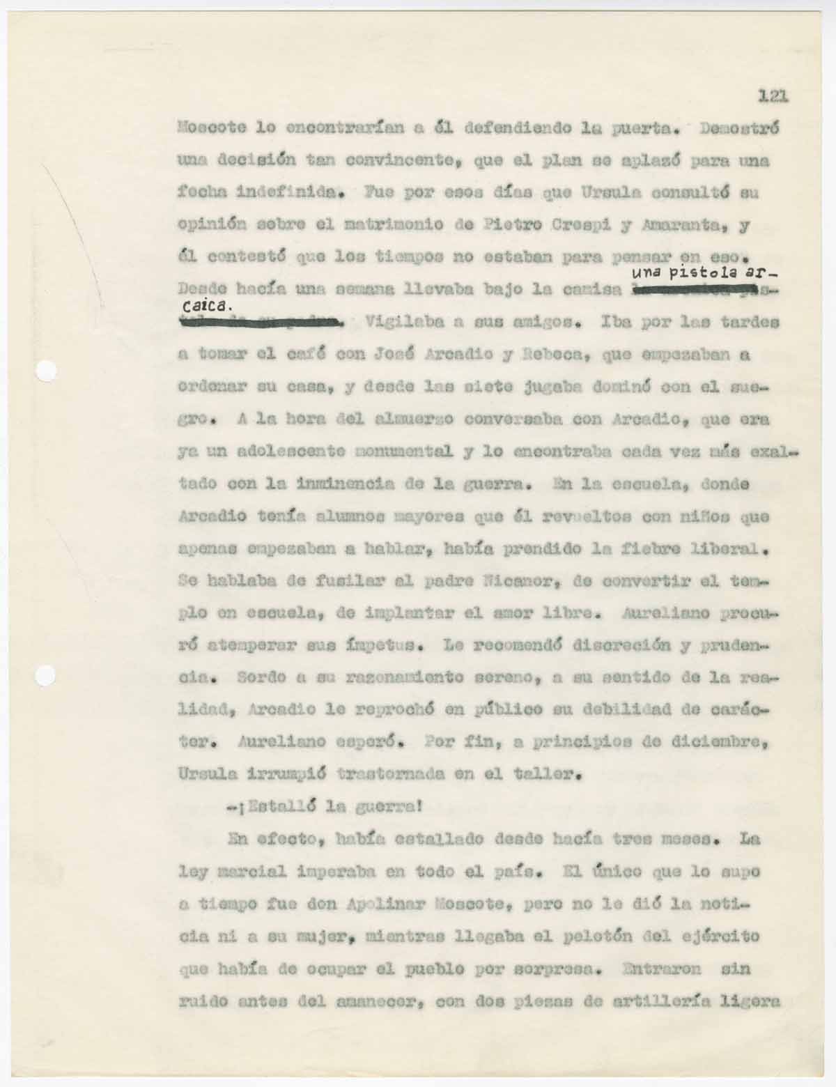 May 23, 2017, Filed Under: Authors, Books + Manuscripts, Digital Collections, Research + Teaching“Una historia de Cien años de soledad a través de sus documentos” “El problema es mío”, confesó García Márquez a un amigo por carta en julio de 1966, “que después de tantos años de trabajar como un animal, me siento agobiado de cansancio, sin perspectivas ciertas, salvo en el único terreno que me gusta y no me da de comer: la novela”. También le dijo a su amigo que acababa de terminar Cien años de soledad, pero que tenía serias dudas sobre si de hecho la novela era buena. Y es que durante los últimos cuatro meses le asaltaba la impresión de estar “metido en una aventura que lo mismo podía ser afortunada que catastrófica”. En esa novela “muy larga y muy compleja”, como la describió al editor jefe de Sudamericana, García Márquez quería recrear el ambiente de su infancia, cuando vivía con sus abuelos maternos en Aracataca, un pueblo de la región caribeña colombiana. Permaneció en casa de sus abuelos hasta los ocho años. Poco después, los recuerdos de la casa, la familia y Aracataca no sólo empezaron a asediarle, sino que también resultaron clave para el despegue de su exitosa carrera literaria, porque esos recuerdos de su niñez se convirtieron en la semilla de Cien años de soledad y varias de sus primeras obras de ficción sobre el pueblo de Macondo y la familia Buendía. Antes de embarcarse en la literatura, el joven García Márquez tuvo dos pasiones: el dibujo y la música. Aunque no se dedicó al dibujo profesionalmente, solía dibujar flores de tallo alargado al dedicar sus libros a sus amistades cercanas, como es el caso de la flor que figura en la primera página de de Cien años de soledad que dio a su amigo Álvaro Cepeda Samudio. Su otra pasión, la música, le acompañaba siempre. Fotos de su oficina en la Ciudad de México muestran que la música (primero, en forma de discos de vinilo y casetes, y más tarde como discos compactos) ocupaba tanto espacio en las estanterías como sus libros de literatura. Escuchar música, de hecho, era una parte tan importante de su proceso creativo como la lectura. Gabriel García Márquez viendo tocar a un acordeonista en Aracataca En marzo de 1966, su amada música vallenata le dio la bienvenida a Aracataca. Ese mes García Márquez interrumpió la redacción de Cien años de soledad y voló de México a Colombia para presentar Tiempo de morir en el Festival de Cine de Cartagena. El cineasta mexicano Arturo Ripstein dirigió la película y García Márquez escribió el guión. Tras Cartagena viajó a Aracataca con su amigo Cepeda Samudio para visitar los escenarios literarios de Macondo, incluida la casa de sus abuelos. Para mayor deleite de García Márquez, su visita coincidió con el primer Festival de Vallenato de la ciudad. Un García Márquez con las pilas cargadas retomó el trabajo de la novela al regresar a la Ciudad de México. Texto mecanografiado de la novela con correcciones del autor Escribir Cien años de soledad le llevó alrededor de 13 meses, de julio de 1965 a agosto de 1966. Es poca la documentación que hoy sobrevive para entender cómo la escribió. Al parecer García Márquez quemó todos manuscritos, notas y diagramas después de recibir de Sudamericana la primera copia del libro. Sólo guardó la última versión mecanografiada del texto, que se conserva en el Harry Ransom Center. Esta versión contiene más de 200 correcciones a mano, las cuales revelan sorprendentes variantes con respecto al texto final de la novela publicado por Sudamericana. Algunas variantes de especial interés se encuentran en las páginas 46, 149 y 282. Tras su publicación el 30 de mayo de 1967, la novela cosechó un rápido éxito en América Latina y España. Sin embargo, ni el autor ni el editor esperaban que triunfase del modo que lo hizo. En aquel entonces, lo que podía esperarse de Cien años de soledad era que alcanzase un éxito similar al de otras novelas latinoamericanas contemporáneas, como Sobre héroes y tumbas (1961) de Ernesto Sábato, El siglo de las luces (1962) de Alejo Carpentier, La muerte de Artemio Cruz (1962) de Carlos Fuentes, La ciudad y los perros (1962) de Mario Vargas Llosa, Rayuela (1963) de Julio Cortázar, Juntacadáveres (1964) de Juan Carlos Onetti y El lugar sin límites (1966) de José Donoso. Para sorpresa de García Márquez y Sudamericana, la novela se convirtió en un superventas internacional. Dada la magnitud del éxito, medios de comunicación de América Latina y España trataron de explicar el fenómeno literario de Cien años de soledad, incluidas publicaciones especiales como el número 9 de Coral, una revista de turismo, arte y cultura publicada en Valparaíso, Chile. Este número especial incluyó una recopilación de ensayos críticos sobre la novela escritos por 11 críticos y escritores de cinco países. Las críticas entusiastas y las cifras récord de venta en lengua española impulsaron una avalancha de traducciones. Su publicación en Gran Bretaña, en particular, incluyó la difusión de un folleto ilustrado de gran formato en el que se afirmaba que ecos de William Faulkner, Lev Tolstói y Thomas Mann aparecían en la novela de García Márquez. El folleto también reproducía la famosa reseña del Times Literary Supplement de 1967 que consideraba Cien años de soledad una “obra maestra”. Presenciando el éxito internacional de la novela estaba la esposa de García Márquez, Mercedes Barcha, quien, como afirmó el escritor en múltiples ocasiones, aparece en la mayoría de sus libros. “Cien años de soledad—críticas y comentarios” (álbum de recortes) En parte gracias al éxito de Cien años de soledad, García Márquez fue galardonado con el Premio Nobel de Literatura en 1982. Desde entonces, el prestigio de esta novela no ha dejado de crecer, y su estilo –popularmente conocido como realismo mágico– sigue influyendo a grandes 