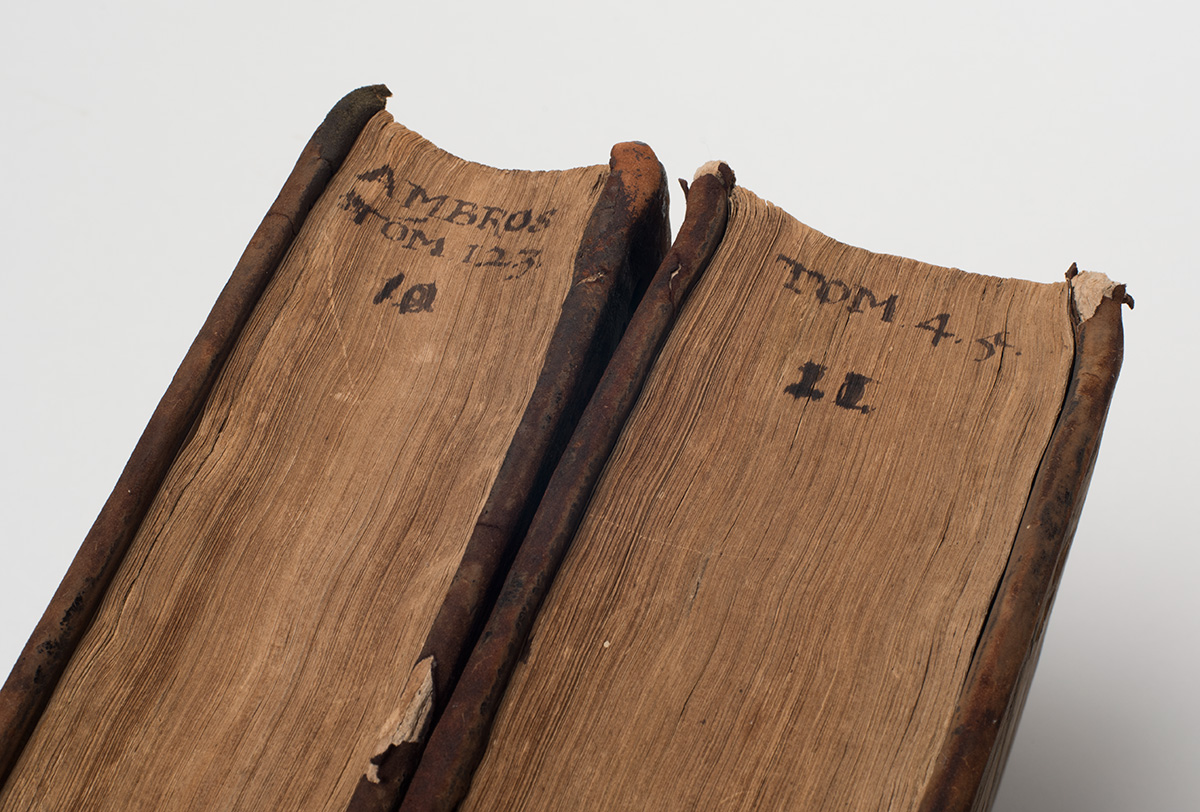 October 19, 2017, Filed Under: Books + ManuscriptsA baroness and her bookshelves in an English parish church In May, the Ransom Center acquired two volumes of Ambrose’s Opera (or Works) in Latin. The edition was published in Basel in 1567. What is most compelling about these particular books, however, is less the writings of the Church Father, as such, and more their story as books. Ambrose’s Opera (Episcopius: Basel, 1567) In 1616, the widow Anne Harington leveraged land owned by her late husband, John, 1st Baron Harington of Exton, to establish a fund for the relief of the poor throughout the county of Rutland, where she lived. At roughly the same time she did this, she also used her resources to establish a small library in the parish church of Oakham. According to the antiquary James Wright, who wrote in 1684 that her charity “ought to be better remembered,” she gave around 200 volumes “for the use of the Vicar of that Church, and accommodation of the Neighbouring Clergy.” Anne Harington’s donor plate has been pasted at the foot of each volume’s title page Wright also notes that these books have been “curiously bound, the Covers adorn’d with several guilded Frets (commonly call’d the Harringtons Knots) and Ex Dono Dominae Annae Harringtonae Baronessae Printed and pasted in the Title Pages.” Although they indeed were made in England, the bindings of the Ambrose now at the Ransom Center predate the gift and lack the custom decoration Wright describes. Nevertheless, a printed label that proudly proclaims Harington’s gift—and her status as both Lady and Baroness—remains prominent in each volume. (As it turns out, only eight of the surviving Oakham books actually have Harington-knot bindings. Wright appears to have overstated the case, as he may also have done when estimating the size of the donation at 200 books: we currently know of fewer than 125 volumes.) So, not only did Anne Harington’s philanthropy provide a group of provincial clergy with food for thought, it also occasioned one of the earliest donor labels (or plates) made for an English woman. Harington was proud of her giving and wanted readers to know about it. She and her daughter, Lucy Russell, Countess of Bedford, also gave more than 200 volumes to Sidney Sussex College at the University of Cambridge. But while a number of the Cambridge books remain in Harington-knot bindings, it appears that Harington inserted her donor plate only in the Oakham books. Author, title, and shelfmark were written on the volume’s fore edges for shelving at the Oakham Parish Library The Ransom Center volumes also help exemplify a shift in the ways readers and libraries stored their books. According to Wright, when Harington donated the books themselves, she built “a convenient place” for them in Oakham’s church. From 1616 until the library was moved to the University of Nottingham in 1980, they appear to have been stored in two large oak presses. Each press had three shelves that could hold the large folios that made up the bulk of Harington’s gift. Inscriptions at the top of the fore edges show that the works within are indeed by Ambrose and that the five parts of the edition have been spread across the two bound volumes. There are also numbers—”10″ and “11”—that once marked the place of these books on a shelf. Anne L. Herbert, who has written on the Oakham Parish Library, observes that Several volumes bear the trace of one number written over an earlier, fainter one [which is the case with the Ransom Center Ambrose]. The numbers used are between 1 and 29, the lower numbers occurring more frequently, up to a maximum of six times; each of the six shelves [between the two presses] presumably bore a parallel series of numbers. For these inscriptions to be read, the books would have been shelved with their edges—not their spines—facing out. Alien to us now, this practice emerged in medieval libraries that chained books to shelves to prevent theft. Books chained to shelves in Hereford Cathedral. Photo ©Getty Images; Published on AvaxNews.com. On shelves in the Hereford Cathedral Library, one end of the chain passed through a bar running parallel to the shelf. The other end attached to the edge of one of the book’s covers. So that chains did not rest awkwardly under books or between the covers of adjacent books, spines faced inward, and edges outward. Shelving books with the fore edge out became standard, even for libraries like the one in Oakham’s parish church that never used chains. Examples of spine-out shelving become common during the sixteenth century. But the practice does not prevail until well into the next. At some point the library stored in the Oakham presses—Harington’s library—bowed to the spine-out shift. At some point after the books left the parish library, the first volume’s spine cover was replaced. The second’s original cover is intact and bears a paper label from its time at Oakham. It is hard to precisely date the handwriting. It is likely that the books had been turned around by the end of the seventeenth century, less than 100 years after they first arrived. For more on the Oakham Parish Library, see Anne L. Herbert, “Oakham Parish Library,” Library History 6.1 (1982): 1–11. A good history of book shelving can be found in Henry Petroski, The Book on the Bookshelf (New York: Knopf, 1999). And the earliest account of the Harington donation is in James Wright, The History and Antiquities of the County of Rutland (London: Bennet Griffin, 1684).