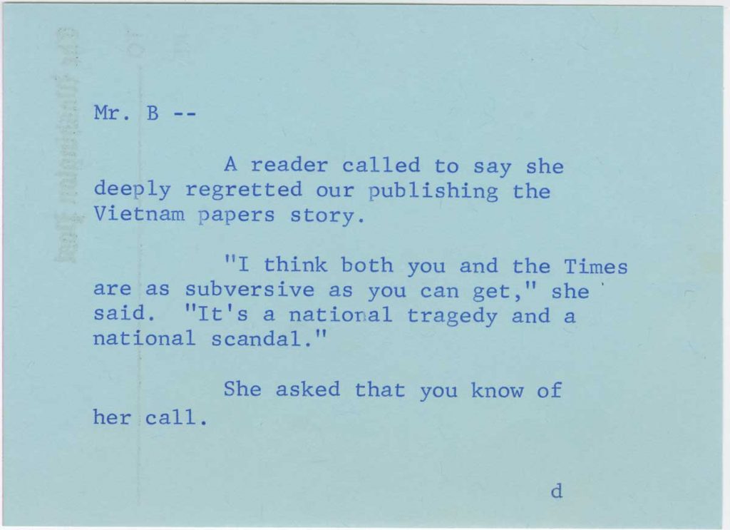 December 5, 2017, Filed Under: Featured1, Research + Teaching“A Frightening Time in Our History”: Public reaction to the Pentagon Papers In recent weeks, two separate films have depicted the career of the late Washington Post Executive Editor Ben Bradlee. The HBO documentary The Newspaperman, which premiered December 4, tells Bradlee’s story through a combination of interviews and archival footage.Researchers for the film consulted manuscript materials and audio recordings from the Benjamin C. Bradlee Papers at the Harry Ransom Center. In addition to the documentary, Steven Spielberg’s fictionalized account of the publication of the Pentagon Papers, The Post, starring Tom Hanks as Bradlee and Meryl Streep as Post publisher Katharine Graham, opened later that month. I had the good fortune to process and describe Bradlee’s papers for the Ransom Center in 2015, and I would like to take this opportunity to share some of the unique materials contained in the archive. Since both the documentary and the feature film discuss the Post’s role in publishing Daniel Ellsberg’s Pentagon Papers, I took a second look at the files related to that controversy, searching for original primary source materials not likely to be duplicated in another archive that tell a compelling story. I found letters written to Bradlee from members of the general public expressing their reactions to the Pentagon Papers controversy—one folder of hate mail and one of fan mail, more or less. Washington Post publisher Katharine Graham with reporters Carl Bernstein, Bob Woodward, editor Howard Simons discuss the Watergate story in Post managing editor Benjamin C. Bradlee in Bradlee’s office at the Washington Post, April, 1973. © Mark Godfrey. Bradlee’s archive is profoundly rich in correspondence; he saved great volumes of letters he received during his career at the Post, not just from friends and colleagues, but also from Post readers, and from those who had never read the Post but saw him on television or read about him in other publications. In those days, public responses to the newspaper were made visible only through a curated selection of letters to the editor published on each day’s editorial page (Bradlee himself did not edit the editorial page and did not select which letters to publish in the newspaper). Letters from the public that are saved in Bradlee’s archive, however, provide an unmediated expression of what Americans thought about the media at that time. I’ve highlighted some of those voices here, and leave it up to the reader to assess the degree to which American opinion regarding the freedom and responsibilities of the press may have changed in the past 46 years. Bradlee’s original files divided the letters he saved regarding the Pentagon Papers into two folders, labeled “Public reaction (negative)” and “Public reaction (positive).” Several writers in the “Public reaction (negative)” folder were disappointed in the publication of information that they believed would compromise national security interests or possibly even put American lives at risk. Hate mail One correspondent from Dallas who wrote to Max Frankel, editor of the New York Times, after viewing an NBC News special on the Pentagon Papers (copying Bradlee on the letter), “You spoke of the First Amendment and the privileges of the New York Times to print the news whatever the consequences…Any given number of additional secret document printing for public consumption and there could possibly be no more First Amendment, no more democracy, and yes—Mr. Frankel—no more New York Times…This is the type of action that is destroying the United States from within and to say the very least causing the public not to know what to believe.” A writer from Troy, New York who watched the same program wrote, “I believe the press has too much power at times and in cases that concern vital information or information concerning our government…I really felt ashamed of you and Mr. Frankel and am sorry I watched the program, having the feeling that you were not sincere—just not interested in what your country might feel vital information nor how you hurt people now living or dead…The news must come first before country or people must be your motto.” Other correspondents felt that the Times and the Post had acted immorally by publishing documents that Ellsberg had copied illegally. A minister based in Washington, D.C., wrote, “It is my own personal hope that the government of the United States will indict and prosecute to the fullest extent not only the thieves or thief, but also the representatives of the newspapers and anyone else involved.” Several writers argued that by publishing the Pentagon Papers, newspapers were furthering the aims of Communists: “The NY Times might as well be a subsidiary of Pravda,” concluded the sender of one anonymous postcard. The “Public reaction (negative)” folder also contains some examples of hate speech. A Post reader from Alexandria, Virginia, wrote that the Pentagon Papers were “All a ‘Jewish’ conspiracy to take over America. To the concentration camp with treasonable and disloyal bas—-…and others of your paper that are part and parcel of this conspiracy. Hitler was right on this score…” Out of about 50 letters in the “Public reaction (negative)” folder, three are anti-Semitic in content (two from the same correspondent in Alexandria). Telephone message for Ben Bradlee, 1971, concerning the Pentagon Papers. From the Benjamin C. Bradlee papers at the Harry Ransom Center. Fan mail Bradlee’s “Public reaction (positive)” file is slightly smaller than the file of negative responses, containing approximately 40 letters. There are a few letters of support from Bradlee’s friends and several letters and telegrams from journalists in the United States and overseas. Many letters written to Bradlee by members of the public stress the importance of a