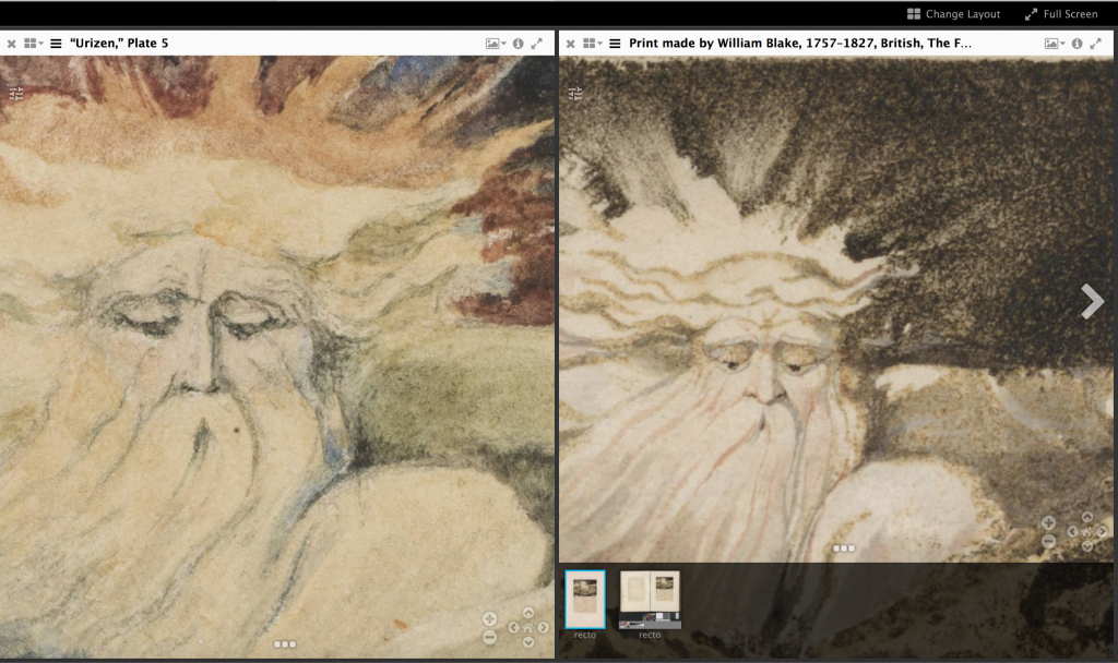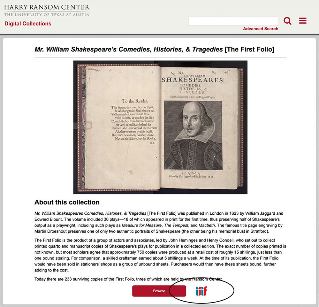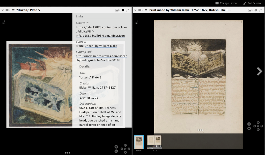 December 5, 2017, Filed Under: Digital Collections, Research + TeachingThousands of cultural heritage materials now instantly shareable in new online platform Ransom Center adopts IIIF and Mirador viewer More than 50,000 images in the Ransom Center’s digital collections portal are now available via the International Image Interoperability Framework (IIIF). IIIF offers new ways to view, compare and engage with images. About IIIF IIIF (pronounced “triple eye eff”) is an international collaborative effort across archives, libraries, museums, and other cultural heritage institutions to define standards for describing and delivering images across the web. The Center’s adoption of IIIF means that its images and descriptive metadata are now instantly sharable with other IIIF-enabled digital image collections such as the British Library, the Getty Museum, and the Yale Center for British Art, to name just a few. The interoperability inherent to IIIF allows for digital image repositories to share image content across (formerly) incompatible or proprietary systems. This facilitates the viewing and study of hundreds of thousands of books, manuscripts, works of art, and other cultural heritage materials from around the world within a single, familiar interface. In other words, researchers can bring together and examine materials virtually that are held by institutions that are often geographically remote from one another. Enhanced image viewing Along with IIIF, the Center has implemented the Mirador image viewer for the display of IIIF image resources. You can use Mirador to study a single image or compare multiple images side-by-side, including those from other IIIF-enabled institutions, within a single browser window. You can also view metadata, zoom deeply into an image, rotate images, or change contrast and brightness. You have two options to view Ransom Center collection materials in Mirador. The IIIF icon appears on every digital collection landing page and the IIIF icon appears alongside every digitized image. The Digital Collections landing page for William Shakespeare’s Comedies, Histories, and Tragedies (London: W. Jaggard, E. Blount, et al., 1623). The image includes sigs. πA1v and π1r of Ransom Center shelfmark Pforz 905. Collection example: Art Ransom Center Curator of Art Tracy Bonfitto appreciates that Mirador allows users to zoom in closely to get a better sense for a work’s details, medium, and process, and to compare images from different institutions. This screen shot shows how you can examine color variants across two different pulls of William Blake’s Urizen print. The print on the left is from the Ransom Center’s collection, shown next to a related work held by the Yale Center for British Art. “Each of these relief etchings were hand-colored to very different effect,” she says. “Researchers can closely compare variations in the rendering of the open book and of Urizen’s face, for example, or consider the details of our unbound print, to which the text was never added, against a print that made up part of Blake’s Book of Urizen.” The IIIF Mirador image viewer showing the Center’s Urizen, Plate 5, 1794 or 1795 (left) and the Yale Center for British Art’s The First Book of Urizen, Plate 8, 1794 (right), both by William Blake The IIIF Mirador image viewer showing the metadata for the Center’s Urizen, Plate 5, 1794 or 1795 (left) and the Yale Center for British Art’s The First Book of Urizen, Plate 8, 1794 (right), both by William Blake Collection example: Early books Ransom Center Pforzheimer Curator of Early Books and Manuscripts Aaron Pratt says that as more institutions digitize their copies and make them available via IIIF, “it will be possible for textual editors to compare even more copies simultaneously in Mirador, greatly facilitating what has historically been difficult—and tedious—work.” He explains: The works of the sixteenth-century English writer Thomas Nashe constitute an important milestone in the development of English prose, and the book collections here at the Ransom Center hold numerous early Nashe editions. We are especially lucky to have three copies of his polemical dialog, Have with you to Saffron-Walden (1596). Although print did help to make books more consistent, from copy to copy of a given edition, the process of getting books through the press almost always generated variants of one kind or another. Each letter, after all, had to be set by hand, and there’s a good chance that at least one correction had to be made each time a new set of pages was in the press. Because Mirador can view multiple items at the same time, it has great promise when it comes to one of modern editors’ central tasks: collating copies, looking for these press variants. In this screenshot showing the Center’s three Saffron-Walden copies, we can spot one such variation on the third line of the page: two of the Ransom Center copies begin the line with “dius” and one with “dent,” as in “compendius” and “compendent.” (Nashe’s current editors report that “compendent” appears in fewer known copies than “compendius” and is almost certainly the earlier setting, an error.) The IIF Mirador image viewer juxtaposing the Ransom Center’s three copies of Thomas Nashe, Haue vvwith you to Saffron-vvalden (London: J. Danter, 1596). The display shows sig. V4v of Ransom Center shelfmarks Wg N177 596h, Ag N177 596h, and Pforz 763. “We are delighted to join the IIIF community in this way,” says Ransom Center Head of Digital Collections Services Liz Gushee. “The Center is committed to sharing our collections as broadly as possible and in finding new way to support scholarship. IIIF and Mirador are exciting new tools that will facilitate discovery, creativity, and engagement with the Center’s collections and beyond.”