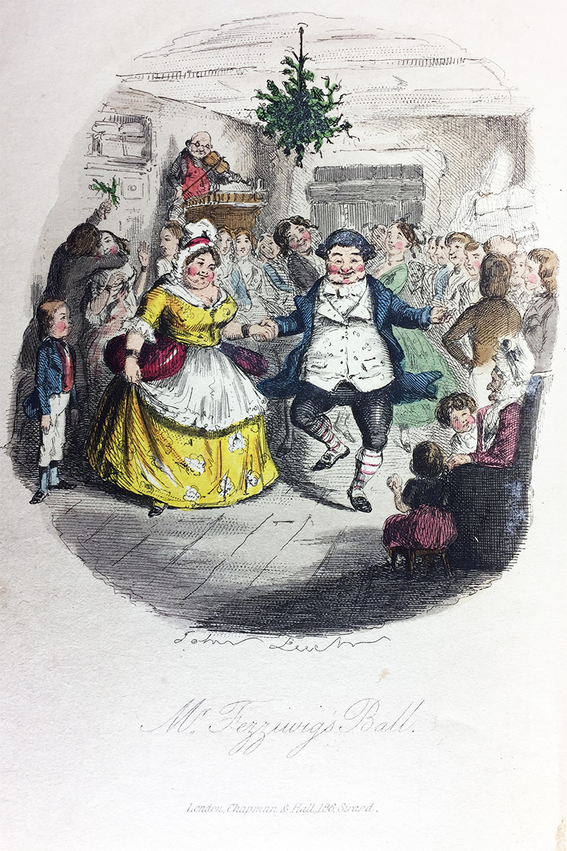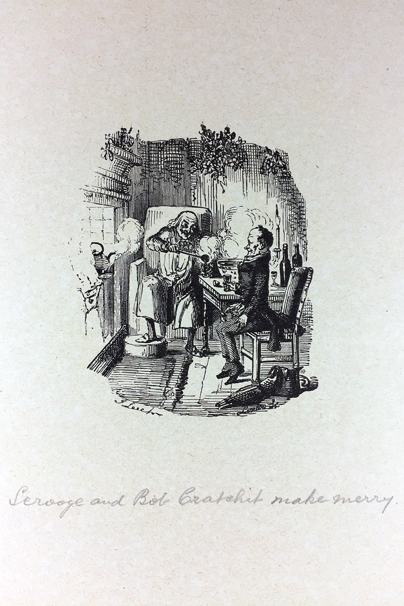 December 19, 2017, Filed Under: Art, Featured1George Macy’s illustrated editions of Charles Dickens’s Christmas classic Between July 1937 and March 1938, Nonesuch Press—under the direction of George Macy—set out to publish what it billed as the most extensive collection yet made of Charles Dickens’s writings. It had already been an energetic few years. Macy founded the subscription-based Limited Editions Club in 1929, and the Heritage Press in 1935, before acquiring London-based Nonesuch Press in 1936. Nonesuch’s practice of teaming up a small hand press for design and commercial printers for production allowed for a wider circulation of its fine-press quality books. In addition to the 23-volume Dickens set, Nonesuch’s ambitious 1937 winter publication roster included a reprint of Virgil’s Eclogue I with illustrations by William Blake and the first reprint of a 1783 translation of Rousseau’s Confessions. In the midst of the hardships of the Depression, Macy billed these Nonesuch publications as modest luxuries whose anticipated popularity signaled better economic times to come. Volume 4 of The Nonesuch Dickens was devoted to the writer’s Christmas Books. Published in late autumn of 1937, the volume comprises “A Christmas Carol,” “The Chimes,” “The Cricket on the Hearth,” “The Battle of Life,” and “The Haunted Man.” To illustrate the series, Macy and book designer Francis Meynell acquired the 877 steel plates and wood blocks that had been used to illustrate the 1836–1870 first editions of Dickens’s works. Among the plates and blocks were nine by John Leech that had been originally produced for Chapman & Hall’s 1843 The Christmas Carol. Frontispiece for Chapman & Hall first edition of A Christmas Carol (London: Chapman & Hall, 1843). John Leech, Mr. Fezziwig’s Ball, 1843, hand-colored engraving That 1843 first edition featured hand-colored prints of Leech’s illustrations. Jovial couples dance under the mistletoe at Mr. Fezziwig’s Ball on the frontispiece. In Stave I, a plate depicts Scrooge confronted at his meager fireside by the spirit of former business partner Jacob Marley; here, the candle flame itself has taken on a portending, ghostly countenance. Later plates illustrate Scrooge’s encounters with the Ghosts of Christmas Present and Future. Several smaller, uncolored prints are also included throughout the text. By Christmas Eve of 1843 Chapman & Hall’s first edition had sold out. A number of subsequent editions—and illicit copies—were produced in the years to follow, heralding the story’s enduring popularity. Trial proof for Nonesuch Press edition of Volume 4 of The Nonesuch Dickens, 1937. John Leech, Untitled [Scrooge and Bob Cratchit Make Merry], engraving, 1937, from the 1843 plate, Charles Dickens Collection, 72.77.1a.9.8 For his Nonesuch publication Macy reproduced Leech’s prints from the original 1843 plates. As with the 1843 prints the Nonesuch prints were hand-colored, to very similar effect as the originals, and these appeared alongside Dickens’s text as revised for publication during the author’s lifetime. In A Christmas Carol Macy found a story with significant value in reproduction. Via the Limited Editions Club he had printed A Christmas Carol in Prose three years earlier, in 1934; that edition was limited to 1500 copies and included original illustrations by Gordon Ross. In 1939 Macy would again publish the story as part of Dickens’s Five Christmas Novels, this time through Heritage Press and with illustrations by Reginald Birch. Illustration for Nonesuch Press edition of Volume 4 of The Nonesuch Dickens (Bloomsbury [London]: The Nonesuch Press, 1937). John Leech, Marley’s Ghost, hand-colored engraving, 1937, from the 1843 plate For his Nonesuch Dickens, Macy restricted the set to 877 copies—the exact number of plates and wood blocks that had been purchased from Chapman & Hall. Hoping to generate greater interest in the set, Macy announced that each subscriber would receive with their 23 volumes one of the original plates or blocks. The plates were presented in custom-fit boxes, handsomely bound in linen buckram and designed for shelf-display alongside the volumes. Each was accompanied by a print and a letter of authenticity from Chapman & Hall. The Ransom Center’s collection includes two of these original plates: a steel plate by artist Phiz (the pen name of Hablot Knight Browne) for The Pickwick Papers, 1837, and a wood engraving of a George Cruikshank drawing for Sketches by Boz, 1836. The latter has an interesting story of its own—it was originally owned by author Evelyn Waugh. The Ransom Center has a large collection of Dickens’s works published by Macy’s companies, Chapman & Hall, and others. Researchers can also explore the records of George Macy Companies, Inc., and view the trial proofs of the Nonesuch illustrations to Dickens’s works in our Reading and Viewing Room.