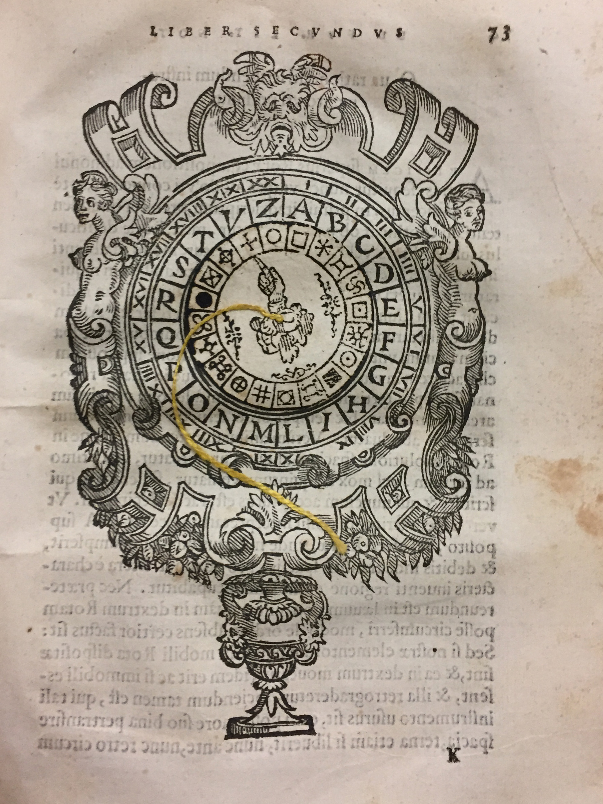 January 4, 2018, Filed Under: Books + Manuscripts, Exhibitions + Events, Featured1In the Galleries: Interactive design in early printed books In early July 2017, a little over a month after I started as the new early books and manuscripts curator at the Ransom Center, a colleague informed me that the Kozmetsky Family Foundation and the Reissa Foundation had together made a generous donation to our collections: a stunning—and quite rare—set of eight large woodcut diagrams on paper, each featuring several layers of intricate rotating parts. The gift paperwork that preceded its arrival identified the set as the work of the German polymath and miracle doctor, Leonard Thurneisser zum Thurn (ca. 1530–ca. 1596). It’s hard to emphasize just how eager I was to examine it. Detail of Leonhard Thurneisser zum Thurn’s Dess Menschen Circkel und Lauff (Berlin: Leonhard Thurneisser, ca. 1575) Thurneisser designed and printed the eight paper machines around 1575. Meant to accompany the second edition of his alchemical and astrological treatise, Archidoxa, they are tools to help readers determine the influence that the heavens would exert on their lives and the natural world. In essence, they are horoscope calculators. Rotating devices made of paper or parchment, like these, are known as “volvelles,” and the complexity and detail of Thurneisser’s make them a strong contender for the most elaborate ever produced. The set now at the Ransom Center has the added benefit of sumptuous hand coloring. We are grateful to the Kozmetsky Family Foundation and the Reissa Foundation for donating this remarkable publication. Long before computer mice and touchscreens made it possible to manipulate complex digital interfaces with ease, volvelles were cutting-edge information technology, transforming the otherwise static surface of the page into an interactive vehicle for learning and knowledge creation. From Latin volvere, a verb meaning “to turn,” “volvelle” emerged in the Middle Ages as a noun that emphasizes the dynamic nature of new rotating devices that were being made of parchment and paper. First designed for inclusion within medieval manuscripts, volvelles and other interactive diagrams proliferated with the advent of print. Although their specific content can be difficult to understand without specialized knowledge, they readily demonstrate both the ingenuity of medieval and early modern thinkers and the technical skill of the printers and bookbinders who helped bring their ideas to broader audiences. The Ransom Center has long held examples of early interactive design in its extensive collections of early printed books, and the arrival of the Thurneisser devices has provided us with an opportunity to showcase a few of them in the gallery. They are on view in our exhibition Stories to Tell: Selections from the Harry Ransom Center until February 26, 2018. Materials on display in Stories to Tell: Selections from the Harry Ransom Center Detail from Ramon Llull’s Ars brevis (Paris: Gilles Gourbin, 1578) Active during the later thirteenth and early fourteenth centuries, Ramon Llull (ca. 1232–ca. 1316) dedicated much of his prolific career as a writer to the goal of converting Muslims to Christianity, and in the process became one of the earliest—and most influential—volvelle-makers. A 1578 edition on display includes the volvelle he integrated into his Ars brevis. It combines the letters of a symbolic alphabet, which is designed to help readers contemplate important questions and arrive at Christian truths. For example, Llull writes that the combination “BCD” can help readers contemplate “whether any goodness is as infinitely great as eternity.” (Llull’s answer is “yes; otherwise all the greatness of eternity would not be good.”) Detail from Johannes de Sacrobosco’s De sphaera (Wittenberg: Johann Crato, 1568) Decades before Llull finished the Ars brevis, Johannes Sacrobosco (ca. 1195–ca. 1256) wrote an important astronomical treatise, De sphaera. It was not originally designed with volvelles, however. It was only in Renaissance printed editions that publishers introduced interactive elements. Once they were introduced, De sphaera became what is likely the bestselling book to include volvelles; its success was in large part due to its use among university students. On display is the Ransom Center’s copy of a pocket edition from 1568, which includes the smallest volvelle I’ve seen: a dial of well under two inches helps to illustrate the ecliptic, the circular path that the sun travels on the celestial sphere as it passes through the twelve parts or “signs” of the zodiac. (In a Ptolemaic universe, the earth sits fixed at the center; other celestial bodies, including the sun, move around it.) Detail from Peter Apian’s Cosmographia (Antwerp: Arnold Birckman, 1539) Interactive devices could also serve as decidedly practical tools. In his Cosmographia, for example, the sixteenth-century humanist Peter Apian (1495–1552) works to demonstrate the relationship between time-keeping and astronomical knowledge by incorporating a volvelle that converts the book into a complex—and complicated—sundial that could be held up to the sun and used to perform calculations. With the book in hand, readers could determine the current time of day, the time of sunrise and sunset, the duration of dawn and dusk, as well as their latitude. Although not quite as popular as Sacrobosco’s De sphaera, the Cosmographia was nonetheless something of a print bestseller in the sixteenth century. Detail from Giambattista della Porta’s De furtivis literarum notis (Naples: Giovanni Maria Scoto, 1563) The Latin title of Giambattista della Porta’s (1535–1615) treatise on cryptography translates to On the secret writing of the alphabet. Although the wide-ranging thinker’s contribution to the field lies primarily in his creation of an early digraphic substitution cipher, he also has achiev