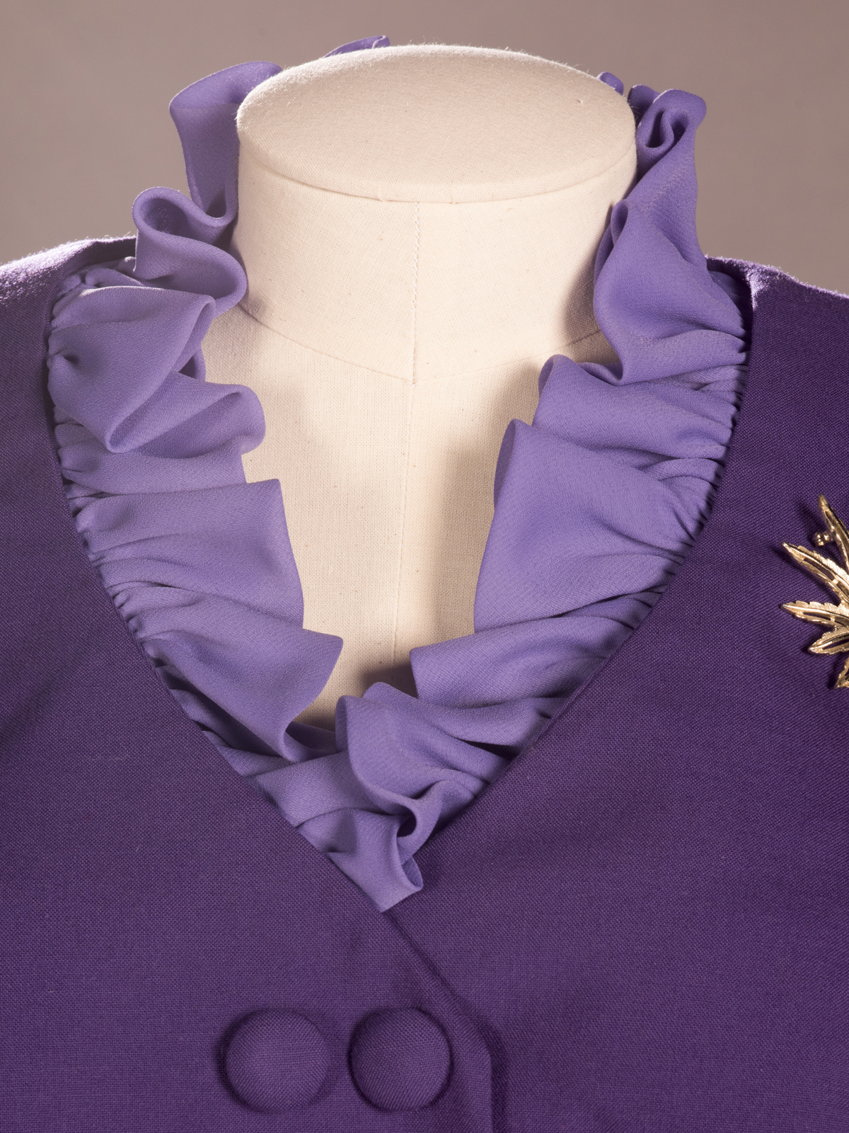 January 16, 2018, Filed Under: Exhibitions + Events, FilmIn the galleries: Dressing for success in Mad Men’s Season 6 The Ransom Center’s Stories to Tell exhibition features a rotating selection from the Ransom Center’s holdings. Currently on display are selections from the Mad Men archive, donated by series creator Matthew Weiner and Lionsgate in January 2017. Among the objects on view are notes on character development, revised scripts, props, and a lookbook and costume for Joan Harris, all from the Season 6 premiere, “The Doorway.” Joan Harris’s costume on display alongside materials from Season 6 of “Mad Men.” Season 6 of Mad Men takes place at the end of 1967 and moves into 1968. In interviews costume designer Janie Bryant said that she saw the styles from this season as precursors to the bold, colorful trends of the 1970s, and she wanted this larger shift in style to mirror the changes the characters experienced on a personal level. As a result, there was significant variation in style during Season 6 among the cast. Megan Draper, for example, sports the newest trends of the moment, while Don Draper maintains his classic style, ignoring growing trends of thicker ties and more vibrant colors that other male characters wear. Costume ensemble for Mad Men Season 6, “The Doorway” (detail). Having started the series as office manager, Joan Harris is now a partner at the agency Sterling, Cooper, Draper, Pryce, and her style has evolved accordingly. The costume on display in Stories to Tell is the ensemble Joan wears in the season premiere. It still has the form-fitting silhouette her character favors, but includes ruffles, a vest, and an A-line skirt. Ruffled necklines and cuffs were mainstream trends of the 1960s, giving Joan’s outfit an up-to-date look, while the menswear inspired vest emphasizes her new role at the agency. Also on display is a lookbook by Bryant created for Season 6, containing clippings of advertisements, catalogs, and fashion photography from the time period. It visually summarizes the feeling and styles for Joan’s costumes. The images evoke Joan’s self-confident, professional appearance. Costume ensemble for Mad Men Season 6, “The Doorway” (detail). In the late 1960s, clothing became softer and less structured because clothing manufacturers and designers used less seam-shaping and built-in bones—thin strips of plastic or metal usually inserted into the bodice —when making clothes. These methods shaped a woman’s body in accordance with the structure of the outfit and restricted movement. For example, pencil skirts, a hallmark of Joan’s style in past seasons, confine movement much more than an A-line skirt, which she wears in this episode. According to Jill Morena, costumes and preservation technician at the Ransom Center, Joan’s costume was made entirely by Bryant and her team, with the exception of the ensemble’s brooch and earrings. Making the garments themselves allowed the team to recreate the style of the era while tailoring the costume exclusively to actor Christina Hendricks. Costume ensemble for Mad Men Season 6, “The Doorway” (detail). Bryant and her team also used vintage 1960s garments, which were tailored to the actor or modified to fit with the character and the scene. The inside of Joan’s costume is not finished with lining, which is common in film and television costumes; either the costume fits or drapes on the actor best without lining, there are time or budget constraints, or the interior of the garment will not be seen on camera, and therefore isn’t necessarily needed. The ultimate goals for Bryant and her team were to create costumes that embody the character’s style and personality, fit the actor well and are comfortable to move in given the demands and actions of the scene, and express the overall arc of the show’s narrative. See these items from the Mad Men archive along with selections from the archives of Edgar Allen Poe, Kazuo Ishiguro, Anne Sexton, and others on display through February 26, 2018, in Stories to Tell: Selections from the Harry Ransom Center.