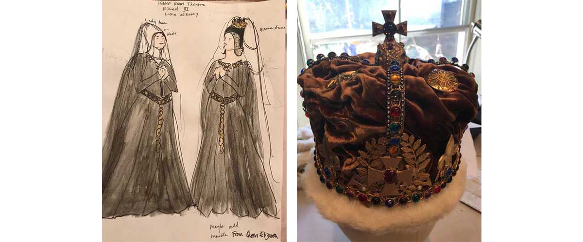 May 7, 2018, Filed Under: Books + Manuscripts, Exhibitions + Events, Research + TeachingScholarship, time machines, and madness by Beth Burns, Hidden Room Theatre Artistic Director John Wilkes Booth’s promptbook for Richard III “Ready trumpet. Boy ready with armor. Take time. More piano. Long flourish continued till discovery, next Sc. – and do not W Till Mr Booth is on stage.” I’m trying to decipher this sentence. I’m trying to translate these notes, some written by a prompter (basically our modern day stage manager) and some by the star of the show (our modern day actor/director), into usable instructions. I’m trying to resuscitate playing practices that have been dead for over 100 years, using an 1861 promptbook of Shakespeare’s Richard III. (Really, it’s Restoration playwright Colley Cibbers “fix” of Shakespeare’s Richard III in 1699, but that’s another story.) The promptbook is the play script with detailed notes handwritten inside to instruct actors and theatre staff before the star arrives to play his part. Beth Burns. Photo by Pete Smith. For The Hidden Room, a company that specializes in scholar/practitioner collaborations, often recreating historically significant theatre, these handwritten notes are DNA hidden in the book’s rich amber. But the actor/director who wrote most of them, than man who is assisting me from the beyond is John Wilkes Booth. I hate John Wilkes Booth. In 1865, John Wilkes Booth will assassinate Abraham Lincoln. Yet here in 1861/2018 he kindly assists me, blissfully unaware that he will become one of the most detested villains in American history. “Shouts. Clashing of swords all through – distant at times.” That’s good. That’s a good note. The sound effects of swords clanging, sometimes more quietly as though far away helps build an encompassing battle for the audience to imagine. “All the characters discovered & fight above. 2 & 3 groups. Long flourish kept up til Richard fights through Soldiers and meets Richmond who enters RIE. All fight at flourish stop.” Now I have a better idea of the timing and accents of the battle, and its extravagance. I know this is a massive, violent spectacle, and I see the drama of the lead-up to Richard and Richmond’s epic fight, as Richard forces his way through a curtain of struggling soldiers. These are remarkably helpful notes. But I remember again that they come from him, and I struggle to focus. John Wilkes Booth’s promptbook for Richard III, ca. 1861–1864. Manuscripts Collection, Harry Ransom Center. We almost certainly would not have this promptbook had its owner not been so morbidly interesting. It is well-traveled, and such books often didn’t survive past their usefulness in production. It could have been chucked at any point. Legend has it most of John’s belongings were burned by his brother Edwin, an actor whose reputation for greatness lives on despite his brother’s infamy. View entirety of John Wilkes Booth’s promptbook online. But still this promptbook remains, and was recently pulled from its careful storage at the Harry Ransom Center by Eric Colleary, Cline Curator of Theatre and Performing Arts. Colleary recognized its immediate practical use, especially to a theatre company like the Hidden Room. Regardless of the man it belonged to, despite him even, it is a treasure to me. It’s a time machine back to forgotten practices in drama, and there is so much to learn. The big red “W” underlined, what is that? Into the vaults Colleary and I go to find books from the period on acting and “amateur theatricals.” There it is! “W” is for “whistle,” and indicates a scene change. Different types of whistles for different scenes. I learn from an extant poem that the whistle is “shrill” and audible to the audience. I learn that the Prompter has a whistle around his neck to call for these scene changes, and a bell around his wrist to cue music. I wonder if this is where the term “bells and whistles” originates, from over-the-top scene changes and music as noisily called for by the prompter. I also realize this must be the root of the superstition not to whistle in a theatre. No one wants to be crushed under the weight of a scenic drop. The promptbook keeps creating questions for me, and further research at the Ransom Center keeps providing answers. I know that there is a “boy ready with armor,” but what did that armor look like? Off to the stacks to see pictures of other “Richards” of the period and their armor choices since no pictures of Booth’s Richard are known. What music was likely being played here? How was gesture acting articulated in the 1860’s? Theatre is at a tipping point in this period, what side did Booth’s production fall towards? How did resident actors approach their scripts? What was it like for a traveling actor like Booth to perform five shows a week with an ensemble he’d only meet a few days before the run? The dive goes on and on, and I’m reassured and guided by Eric and Visual Materials Circulation Coordinator Michael Gilmore as we keep uncovering, learning, questioning. The Hidden Room’s Jenny McNee’s drawing of Lady Anne (left) and a mock up of a crown based on one of Edwin Booth’s Richard crowns from the same period. I remember to be grateful for the promptbook even though it sometimes gives me a shudder as I turn a page. I breathe, and keep my focus on unlocking the way we told stories in 1861. I think about the way that helps us as story tellers and story receivers today, and do my best to accept the unintentional gift, this magic mirror back into to a theatre in 1861, that a madman left behind. “All quiet – after Richard tries twice to rise and cannot.” The Hidden Room Theatre will present Booth’s Richard III in co-production with the Harry Ransom Center and presented by the glorious 1863 Scottish Rite Theatre in June. Top image: Junius Brutus Booth Sr. as Richard III, ca. 1836-1849