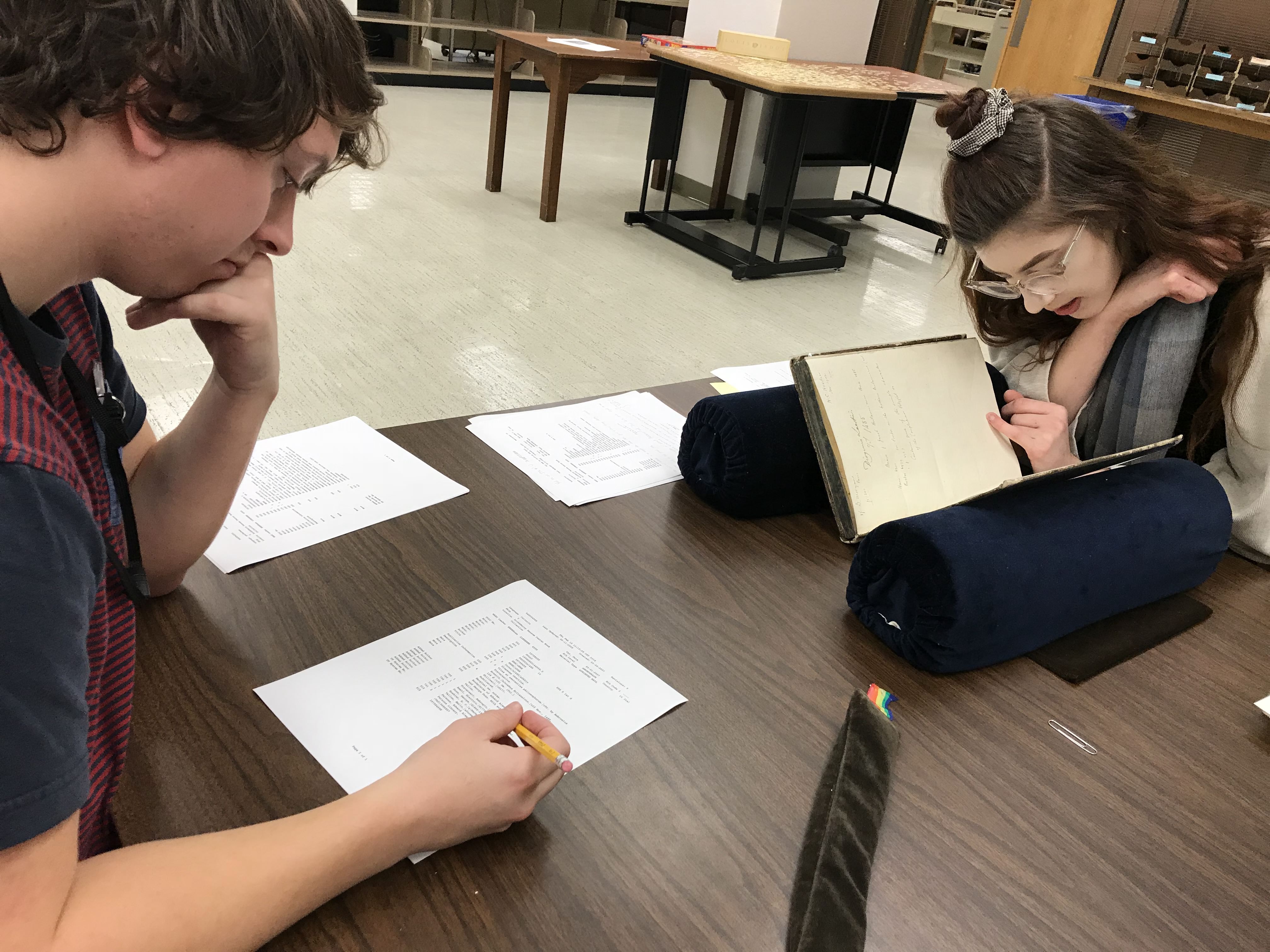 May 18, 2018, Filed Under: Meet the StaffInterview with Nick Purgett, intern in the description and access department Nick Purgett is a senior art history major, graduating in May. He is working at the Harry Ransom Center as an intern in Description and Access, printed and published media. In the future, he wants to continue art history at the graduate level and beyond, though he plans on taking a year or two before starting an even larger profusion of school. What does a work day look like for you? It depends on the work day and really no two are alike! Tuesday and Thursday, I tend to work with Hebrew books as well as some of the internal data with the incunabula project. Fridays, I work with Pforzheimer Curator, Aaron Pratt, and fellow intern Celia Shaheen on the incunabula themselves, flipping through pages and driving ourselves crazy at the absolutely insane stuff you tend to find in old books. In working on these projects there is a fairly straightforward workflow, for the incunabula it is among the three of us while working on the Hebrew books is solo. One person has to do the dirty work of flipping through every page in the book. The one page you skip over could have a weird and crazy annotation or bit of provenance information that is key in better understanding the book, so you have to pay attention. Additionally, the person flipping through the book makes sure that our record of how the book is constructed, what leaves are missing, etc. is consistent with the actual state of the book. Another person will have a printed record of the book and take notes based on what is found inside, adding them to relevant software. This makes relevant details about the book more easy to find via the UT library catalog. Finally, a third person is on a laptop finding the ISTC number for each of the incunables. The ISTC is the Incunabula Short Title Catalog, a very useful, but very unwieldy, database used to manage standard forms of incunabula. It seems crazy, but books didn’t exactly have titles back then. Furthermore, the names of the printers who made these books are rarely standardized between German/Latin/Italian/etc variants. The same is done by one person for the Hebrew books but we also share that as well as biographical and location information of the people who owned a particular book. Taking that data, Columbia can then generate a map of how books moved, which is a really interesting take on digital humanities. Nick at work with fellow intern Celia. What projects are you working on or have you completed? Is there one you most enjoy working on or are passionate about? I have mainly two projects, Hebrew books and incunabula. I must say that despite working with the books I do not know a lick of Hebrew, so I do prefer incunabula. Also recently I have been collaborating with other members in the department towards creating a wiki that consolidates and documents workflow for future employees and interns. What skills have you gained or knowledge have you learned through this internship at the Harry Ransom Center? I know more now about incunabula, binding, and bookmaking than I ever thought there was to know. That’s partially the work of Aaron, but additionally having practical experience working with books is such a valuable teacher. What has surprised you about the Ransom Center and your position here? I’ve been working with the materials themselves since day one! The Center absolutely does not baby you in giving access to important things, which is great! I can have a book from 1550 sitting in a manuscript cradle on my desk. That’s just something quotidian and that’s incredible. What prior interactions had you had with the Ransom Center before working here? My interactions with the Center were both as a student and a researcher. Being an art history student, many classes of mine have used the incredible resources of to teach. As a researcher, I used the reading room last school year to look through incunabula that I found interesting just for my own edification. How is the work you do here important for researchers and the general public? For the Hebrew books project, the data myself and Celia are collecting are shared with Columbia University. They are running a project there to map out these instances of Hebrew books in the US, allowing scholars to get a better view of how these books moved before the resurgence of Hebrew in the late 19th century. For incunabula, we’re generally updating and modernizing the description of these books, allowing for both researchers and the public to search our holdings more easily. Say a scholar wants to only look at books with engraved clasps, they’ll be able to do just that once this project is finished. What is the most interesting thing you’ve seen at the Ransom Center? This is really a question about my favorite piece of work. There is an absolutely whacky incunable where the rubricator has drawn, badly I might add, snakes and birds all throughout the margins. It absolutely defies reason. I love it. What was the most difficult part of your internship? There are a ton of individual resources that you have to keep track of in your head, be it for incunabula or Hebrew books or cataloging or whatever. That’s partially what will be so useful about this new wiki. So much of the Ransom Center’s knowledge is tied up in the heads of the brilliant people who work here but that information is never written down anywhere. So it will be great to consolidate all of that and help future employees and interns! How has your passion for historical documents helped in your internship? At the end of the day it is useless to go through these books if you do not have a passion for them and want to describe them and make them accessible with the greatest accuracy possible. Every day, I get to work with the early books I’ve learned about in art history, as well as my German and French culture classes. It’s a dream! Top photo: Nick Purgett, second fro