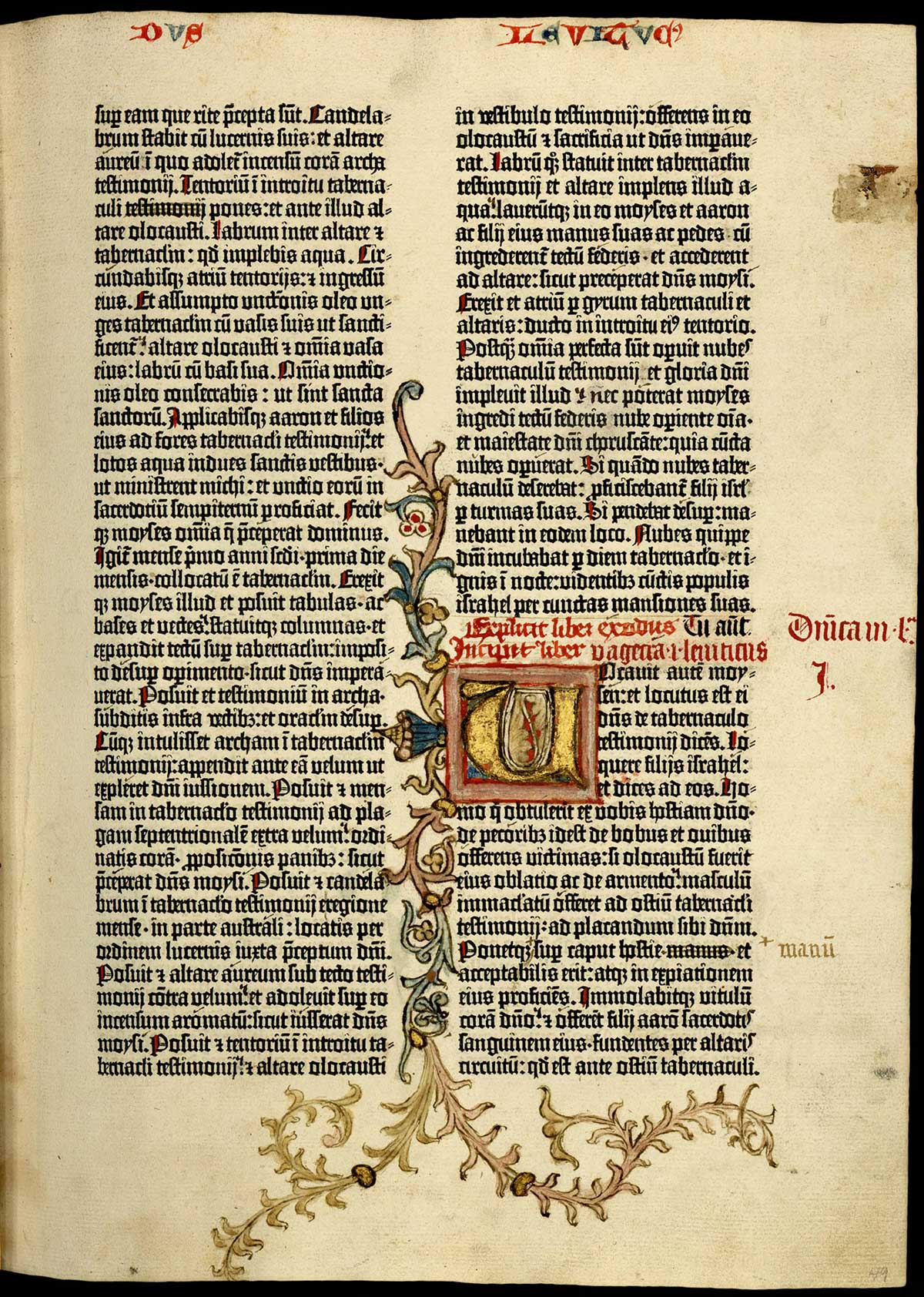 October 4, 2018, Filed Under: Books + Manuscripts, Featured1Printing manuscripts In order to understand the Gutenberg Bible, it is critical to remember that it is a medieval book that was designed to satisfy the needs of medieval readers. Today, we expect pages in most books to be black and white. To navigate what we read, we rely on variations in typography, centered text, indents, and other creative uses of white space. These are the design elements that signal chapter, paragraph, and other section divisions. When Gutenberg was developing his printing technology, though, color often did much of this work. Well aware of the expectations readers of his Bible would have had, his team developed a process to print red text alongside black, but it was apparently cumbersome: they used it for only a handful of pages before giving up, instead leaving blank spaces for scribes to fill in later, by hand. [Biblia latina, commonly known as the Gutenberg Bible (Mainz: Johann Gutenberg and Johann Fust, between 1454 and 1456)], 5 recto. Here, at the beginning of Genesis, the red text has been printed. If you look carefully, you can see that this page went through the press twice, once for the black text and once for the red: the hook of the “g” in the first line overlaps with the horizontal line atop the “u” in the second. This meant that, if you bought a brand-new Gutenberg Bible in the fifteenth century, your book would not have been complete and ready to read until you found a scribe—and, optionally, another artist to provide more elaborate decoration. So, in addition to the fact that the design of Gutenberg Bibles was the product of a long tradition of manuscript production that preceded the press, Gutenberg Bibles are also, in part, manuscripts. Indeed, Gutenberg’s team does not appear to have tried to print the larger initial capitals that begin sections, so even if they had gone forward with printing most of the red text, owners would still have had to employ scribes. By design, the Gutenberg Bible is a print-manuscript hybrid, as the appearance of surviving copies, like the Ransom Center’s, makes clear. [Biblia latina, commonly known as the Gutenberg Bible (Mainz: Johann Gutenberg and Johann Fust, between 1454 and 1456)], 49 recto. With its red text and elaborately decorated initial, this page showing the beginning of Leviticus is unquestionably indebted to the design conventions of earlier manuscripts. In 1455, Gutenberg’s business partner, Johann Fust, sued him and went into business with one of his former employees, a man named Peter Schoeffer. Fewer than two years after the lawsuit, in August 1457, their new operation published a book that has the distinction of being the first piece of European print to indicate the date of its publication and the names of its publishers. At the very end of the book, Latin text—printed in red—tells that The present book of the Psalms, decorated with the beauty of capital letters and sufficiently marked with rubrics, by the ingenious invention of printing with letter forms has been fashioned without any driving of the pen; and in praise of God it has been brought industriously to completion by Johann Fust, citizen of Mainz, and Peter Schoeffer of Gernsheim, in the year of the Lord 1457, on the vigil of the Feast of the Assumption. (Translated in Eric Marshall White, Editio Princeps: A History of the Gutenberg Bible (London: Harvey Miller Publishers, 2018), 27.) As the passage proclaims, their book, known as Mainz Psalter, includes both capitals and red text (“rubrics”) that have been made “without any driving of the pen.” Fust and Schoeffer did what Gutenberg and his team had not: they insisted on replicating the look and feel of manuscript books mechanically, without relying on scribes. Mostly. As a psalter designed in part for use in church services, their book needed musical notation, and this was beyond even the innovations of Fust and Schoeffer. In surviving copies, the music has been added in manuscript. Still, Europe’s second printing business developed a three-color process that allowed capital letters, surrounding decoration, and red text to be printed at the same time, usually in a single pass through the press. Fust and Schoeffer, we might say, had succeeded in printing manuscripts. Of course, if we were fifteenth-century readers, we would just call them books. [Psalterium, commonly known as the Mainz Psalter] (Mainz: Johann Fust and Peter Schoeffer, 14 August 1457)], 37 recto. The Ransom Center is fortunate to have a fragment of the Mainz Psalter that was once recycled as part of a bookbinding. Currently, it is on display in the lobby alongside the first volume of the Center’s Gutenberg Bible. Both show Psalm 26/27. In the Gutenberg copy, the two-tone “D” with which the Psalm begins and all of the other color initials on the pages are in manuscript. In the Mainz Psalter, though, the bulk of the text, the red capitals, and the fine blue linework around the large “D” have all been printed. Modern bibliographers believe that Fust and Schoeffer achieved such a precise and consistent boundary between colored initials and their contrasting decoration by separately inking two metal plates that then fit together snugly on the surface of a wooden block and went through the press, usually along with rest of the page. [Biblia latina, commonly known as the Gutenberg Bible (Mainz: Johann Gutenberg and Johann Fust, between 1454 and 1456)], 297 verso and 298 recto. Compare Psalm 26/27 in the Gutenberg Bible, which begins in the second column on the left, with the same psalm in the Mainz Psalter. While printed red text would become routine in liturgical books, almanacs, and a handful of other publications, Fust and Schoeffer’s more ambitious process remained idiosyncratic. In fact, it would take only 50 years or so before the efficiency and economy of single-color printing largely shifted readers’ expectations toward 