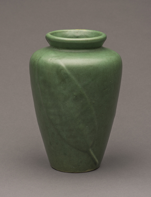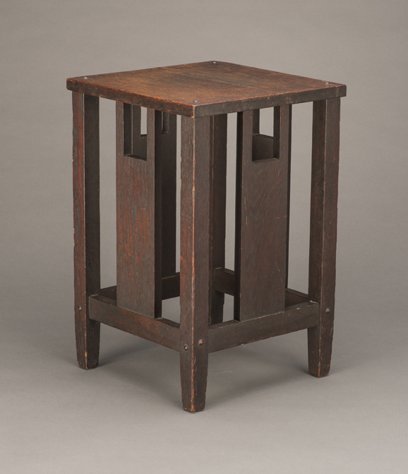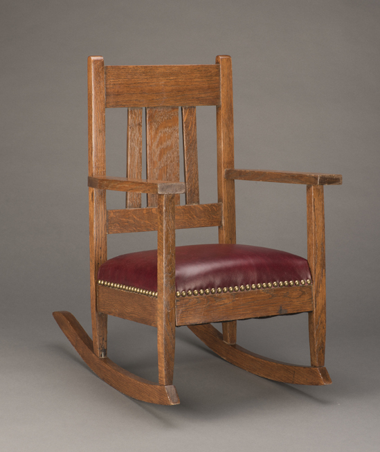 February 26, 2019, Filed Under: Exhibitions + EventsFree daily tours of The Rise of Everyday Design: The Arts and Crafts Movement in Britain and America Tour The Rise of Everyday Design: The Arts and Crafts Movement in Britain and America Through July 14, 2019 We offer free daily exhibition tours. No reservation required. Public tours meet in the south atrium. Daily tours at noon, with additional tours on Thursdays at 6 p.m. and 2 p.m. on weekends. The tours last about an hour and are led by docents. The Rise of Everyday Design: The Arts and Crafts Movement in Britain and America examines how the ideas of Arts and Crafts reformers, influential to this day, transformed the homes and lives of ordinary people in the nineteenth and twentieth centuries. With books, drawings, furniture pieces, decorative arts objects, photographs, and advertising ephemera, the exhibition appeals to anyone with an interest in architecture and design. Visitors will learn how the movement’s theorists and makers spread their ideas through books, retail showrooms, and world’s fairs. Concerned with the daily realities of the Industrial Age, they used design to envision and promote a new and improved way of living. Taboret, manufactured by unknown American maker, c. 1914. Quarter-sawn oak, 48.3 x 31.8 x 31.8 cm. Private collection. Zanesville Stoneware Pottery Co., tobacco leaf vase, model 102, c. 1920. Stoneware with matte glaze, height: 21 cm, diameter (at the shoulder): 14 cm. Private collection. Child’s rocking chair, manufactured by unknown American maker, c. 1914. Oak with leather upholstery (replaced), 63.5 x 37.6 x 56.5 cm. Collection of Arlo Casey, Austin. The movement was transformed as its tenets of simple design, honest use of materials and social value of handmade goods were widely adopted and commodified by large companies. The exhibition explores how these objects, originally handmade and costly, came to be manufactured and sold to the everyday consumer.
