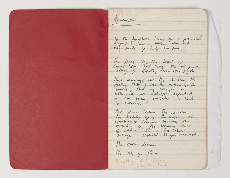 April 9, 2019, Filed Under: AuthorsThe Weather of Domestic Life The Ransom Center acquires the papers of Rachel Cusk. Below, Cusk describes her writing process. When I was writing my first novel I frequently dreamed that the house I was living in was on fire and that I was unable to rescue the manuscript. I took this same manuscript with me everywhere I went: the exteriorising of what was inside me, the creation of it as a physical object, was so momentous and alarming that I often felt more like its guardian than its author. Years later, when I had children, this feeling – that I had created something worth more than myself, or produced an embodiment of myself that I could value – returned. I was again its guard, and it seemed to me that what I was guarding was the struggle towards intelligibility and autonomy. Laura Wilson, Rachel Cusk. The process by which I conceive a piece of work has never been especially palpable. I tend to see it, suddenly and entire, in a single glimpse. The question is how I bring what I have so briefly seen into public existence. I immediately make a set of notes that are like a photograph of it: they record, in one frame as it were, what it looked like to me. Then there is a long period – of months and occasionally years- while I work out what it is. Of this rumination I write down almost nothing: instead I test the image against life, from as many perspectives as I can. If I decide that it does belong to life, that it is real and viable – and in deciding this I have had to learn everything about it – I write it, usually quite quickly. What I write nearly always conforms to the note-photograph I made at the beginning. Notes relating to Rachel Cusk’s adaptation of Medea, 2015. Rachel Cusk Papers, Harry Ransom Center. I don’t know whether my writing process has developed in this way because of my particular circumstances and the life I have lived: I have never had very much privacy. As a child in a large intrusive family and then at boarding school, I wrote diaries that people openly read and were provoked by. The diary was the first form in which I found any power, but I quickly abandoned it: it was too artificial, both too social and too shaming. Most of my work has been written while bringing up children: I have had very little time alone and have had to hold a great deal in my head. Writing things down has become, for me, almost purely performative, to the extent that I can ruin or extinguish the ‘real’ writing by writing things down too early, before they are ready. When my children were small I used to fantasise about the writer’s life, the life I believed other writers were living: one in which you were what you appeared to be, in which the holding it in one’s head wasn’t necessary, in which the physical world exactly reflected the mental environment. My physical world was fragmented, scattered everywhere by the weather of domestic life and its cycles of servitude and change and destruction and renewal. A journal containing Rachel Cusk’s notes for her 2012 memoir Aftermath: On Marriage and Separation, 2011–2012. Rachel Cusk Papers, Harry Ransom Center. Sometimes I tried to create a record of my mental life, to collect some orderly evidence for it: I would hold on to draft manuscripts for a while, but if they didn’t get used to light the fire or for the children to draw on, they were abandoned in the next house move. Against the force of emergency – of enactment, of ‘live’ action – that runs so strongly through family life, I could never exert myself to defend the dead testimonials to my past work. And perhaps my work became a living thing to me in a way it otherwise wouldn’t have done. I did, however, keep hold of my notebooks, in which the ‘photographs’ of my conceptions were taken. Most of them show evidence of daily life trampling through them; they were far from sacrosanct, far from being the ‘writer’s room’ of my fantasy. But being small and lightweight and easy to carry, they survived.
