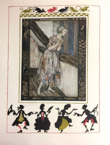 January 8, 2020, Tipped-in illustration and designs by Arthur Rackham, Cinderella (London: William Heinemann, 1919), PR 6009 V339 C56 1919.