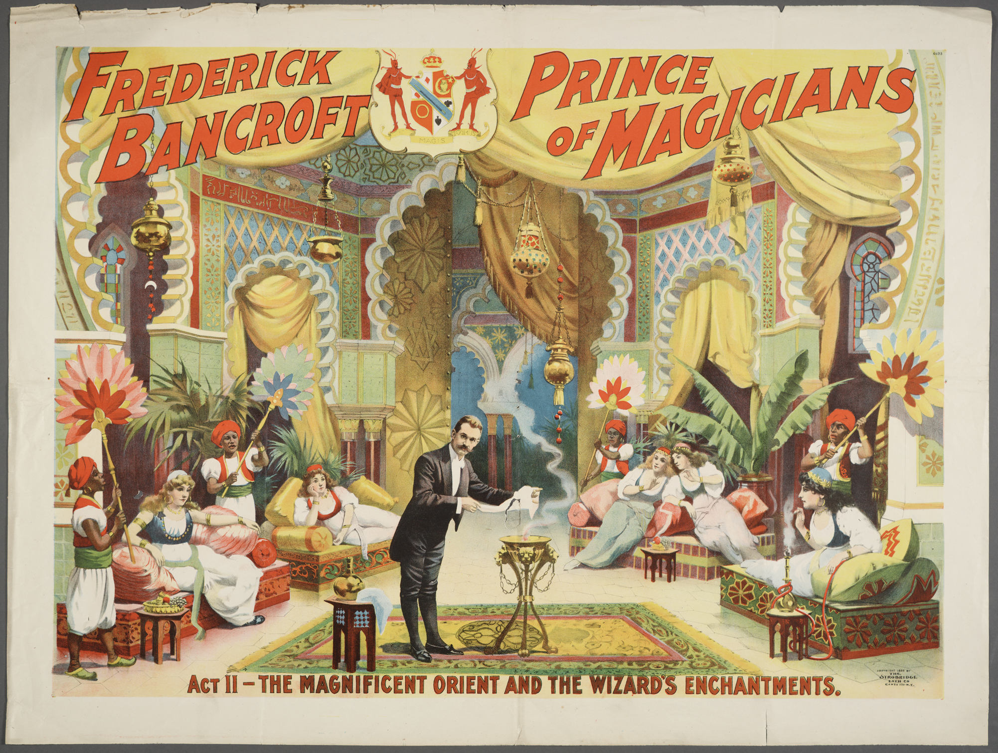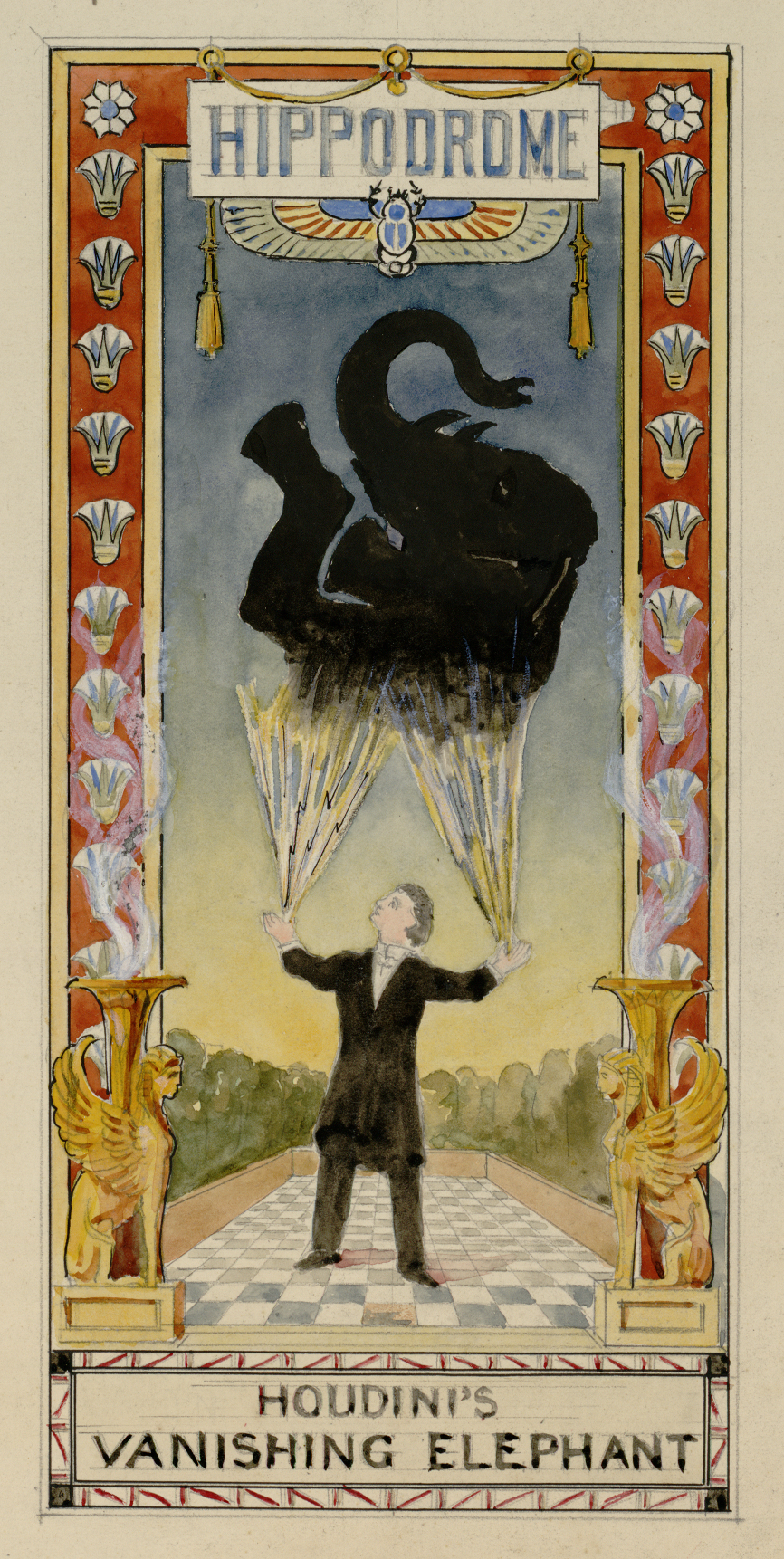 January 23, 2020, Filed Under: Art, Digital Collections, Exhibitions + Events, Featured1, Theatre + Performing ArtsThe Golden Age of Magic Posters DETAIL. Otis Lithograph Co. (American, active 1880s–1930s) “George: The Supreme Master of Magic,” 1928. Lithograph, Magic Collection. The turn of the twentieth century was a period of innovation, when advances in printing and color lithography coincided with a new golden age in the performance of magic and illusion. This convergence resulted in the most stunning, color-saturated advertisements in the history of magic. In the early 1900s, lithographs were popular in advertising, especially for stage magicians who used posters such as these to convey a sense of mystery and exoticism in their acts. Strobridge Lithographing Company (American, active 1867–1960) “Frederick Bancroft: The Magnificent Orient and the Wizard’s Enchantments,” 1895. Lithograph, Magic Collection. Strobridge Lithographing Company capitalized on its location on the Ohio River in Cincinnati—an important trading city bridging the American north and south, and the east with the expanding west. They excelled in creating full-color lithographic posters for variety performance (circus, magic, minstrelsy, etc.), developing an internationally-recognized reputation as a leading advertising company. Lithography is a complex printing process, which, at the time, used smooth stone plates. An artist drew the image on the stone with grease or wax. An acid wash created an etching where the stone was not protected by the grease. Water could be absorbed into the etched stone, but oil-based inks stuck to the grease image. When pressed on paper, the ink transferred, reproducing the original drawing. Color lithography involves multiple layers of printing with different colors of ink, and eventually translucent inks that would blend to create different color tones. Unidentified artist, ‘Houdini’s Vanishing Elephant,’ 1918. Watercolor on paper. Harry Houdini Papers, Gift of the Hoblitzelle Foundation. In 1918, Harry Houdini performed his famous ‘Vanishing Elephant’ trick at the Hippodrome in New York. He commissioned these designs for a poster to advertise the performance, but ultimately, for unknown reasons, posters were never made. They are rare examples of the magic poster design process. Numerous examples of these lithographs are on view in the Ransom Center galleries through February 2, 2020, as part of the exhibition, Stories to Tell: Selections From The Harry Ransom Center. These highlights represent only a fraction of the extensive collection of stage magic advertisements largely collected by Harry Houdini and gifted to The University of Texas at Austin by the Hoblitzelle Foundation in 1958. Strobridge Lithographing Company (American, active 1867–1960) ‘Kellar in his Latest Mystery: Self Decapitation,’ 1898 Lithograph. Magic Collection. Harry Kellar (1849–1922) was one of the most celebrated American stage magicians of his generation, and is credited with inventing a number of now-canonical tricks. He was named the first Dean of American magicians in 1907. He retired the following year, naming Howard Thurston as his successor.