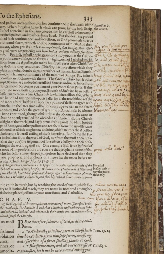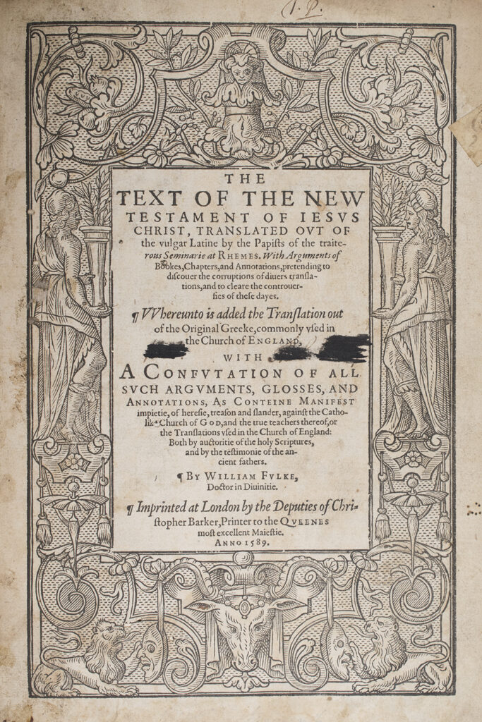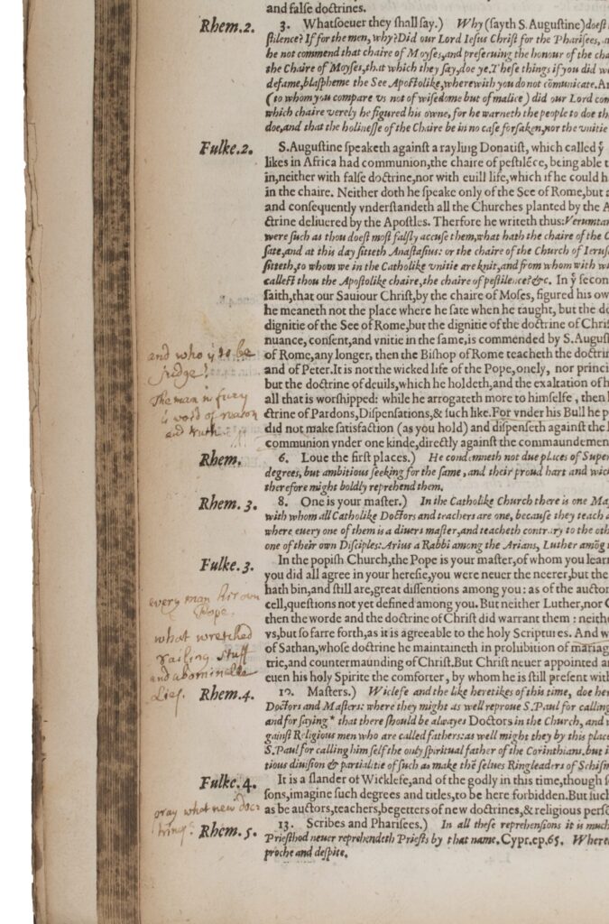 May 28, 2020, Filed Under: Books + Manuscripts, Featured1CONFLICT IN THE MARGINS: The Controversy Over the First Catholic Bible in English The Ransom Center is home to a collection of over 4,000 items related to a persecuted religious minority: the “recusants,” English Catholics who refused to participate in the Church of England, as mandated by English law from the sixteenth to the nineteenth century. Among the many stories these items tell is that of the first Catholic translation of the bible into English. Protestant translations had been in print for over 50 years by 1582, when a group of English Catholics living in exile in France brought out the Rheims New Testament, a translation overtly Catholic in nature and complete with printed notes aimed at refuting Protestant doctrine. These exiles then covertly shipped their work northward to England, where all Catholic books were banned, hoping it would support and spread their beleaguered faith. Though the Rheims New Testament did not reconvert England to Catholicism, it did leave an indelible mark on English bible translation, even influencing the famous King James Version of 1611. William, Fulke, ed., The text of the New Testament of Iesus Christ, translated out of the vulgar Latine by the Papists of the traiterous Seminarie at Rhemes (London: Deputies of Christopher Barker, 1589). Harry Ransom Center Book Collection (BS 2080 1589 It also garnered numerous printed rebuttals by English Protestants. The most extensive was a 1589 dual-columned bible, largely the work of English puritan William Fulke, which reproduced the entirety of the Catholic text alongside the translation from the Bishops’ Bible, then the accepted version of the English church. This large folio volume included Fulke’s point-by-point refutations of the Catholic notes, the intention being that the reader could compare every aspect of the Rheims text with a Protestant counterpoint and observe the flaws in Catholic scholarship. If the Rheims translation aimed at refuting Protestant versions, Fulke’s bible refuted the Rheims translation in turn. While working on an article entitled “The Elizabethan Catholic Bible and Its Readers,” I was fortunate to have access to the Ransom Center’s extensive holdings in these rare bibles. Among these, I discovered a remarkable 1589 Fulke bible featuring marginalia in a seventeenth-century hand. The markings reveal the bible’s reader to be not a Protestant committed to debunking Catholic doctrine—Fulke’s intended audience—but a Catholic as hostile to Fulke as Fulke is to the Catholic text. Such hostility appears in a series of handwritten ad hominem attacks. “No Fulkes: But the Church,” the reader writes in the margins, “is to teach us the true sense of scripture.” Fulke’s interpretations are “wretched railing stuff and abominable lies,” “against all Christians of all ages,” “simple malice,” and just plain “silly.” The reader’s sympathies appear in frequent accolades of the Roman church, which “ever was and is and shall be the City upon a hill, the visible society of true believers; into which all nations have visibly entered.” One revealing marginal note sums up the reader’s attitude towards Fulke’s refutation: “I suppose we must take his interpretation along with us, or he will not allow us our reading. Tho[ugh] I fancy we may rely on better authority then his or any of his fellow Gospellers for the true sense of the Scriptures.” That is, grappling with Fulke’s anti-Catholic polemic is the price of access to a version of the biblical text that maintains the authority of the Catholic Church. At a time in England when punishment for mere possession of Catholic books could include torture and death, Fulke’s publication—contrary to his intentions—allowed this reader to peruse the Catholic translation in relative safety, from pages the Protestant majority had printed themselves. The evidence of this rebellious reading now resides safely among the Ransom Center’s collection, where it offers a contemporary window into the religious controversies of the past. Jeremy Specland, a Ransom Center fellow in 2019, is a PhD candidate in English literature at Rutgers University.